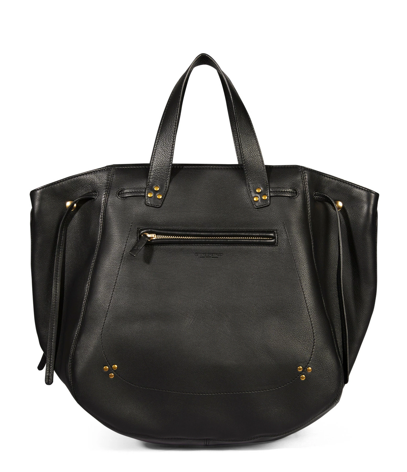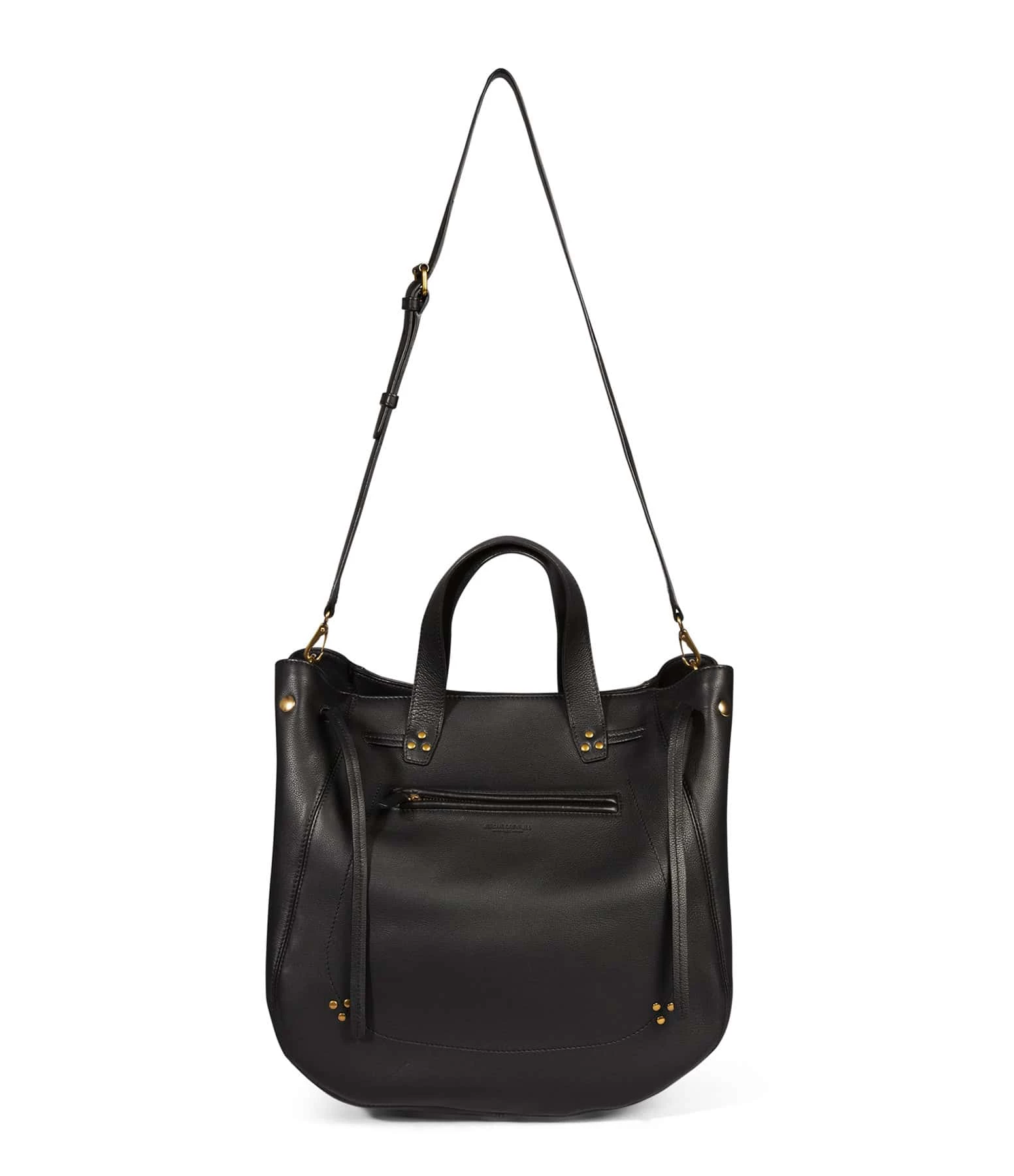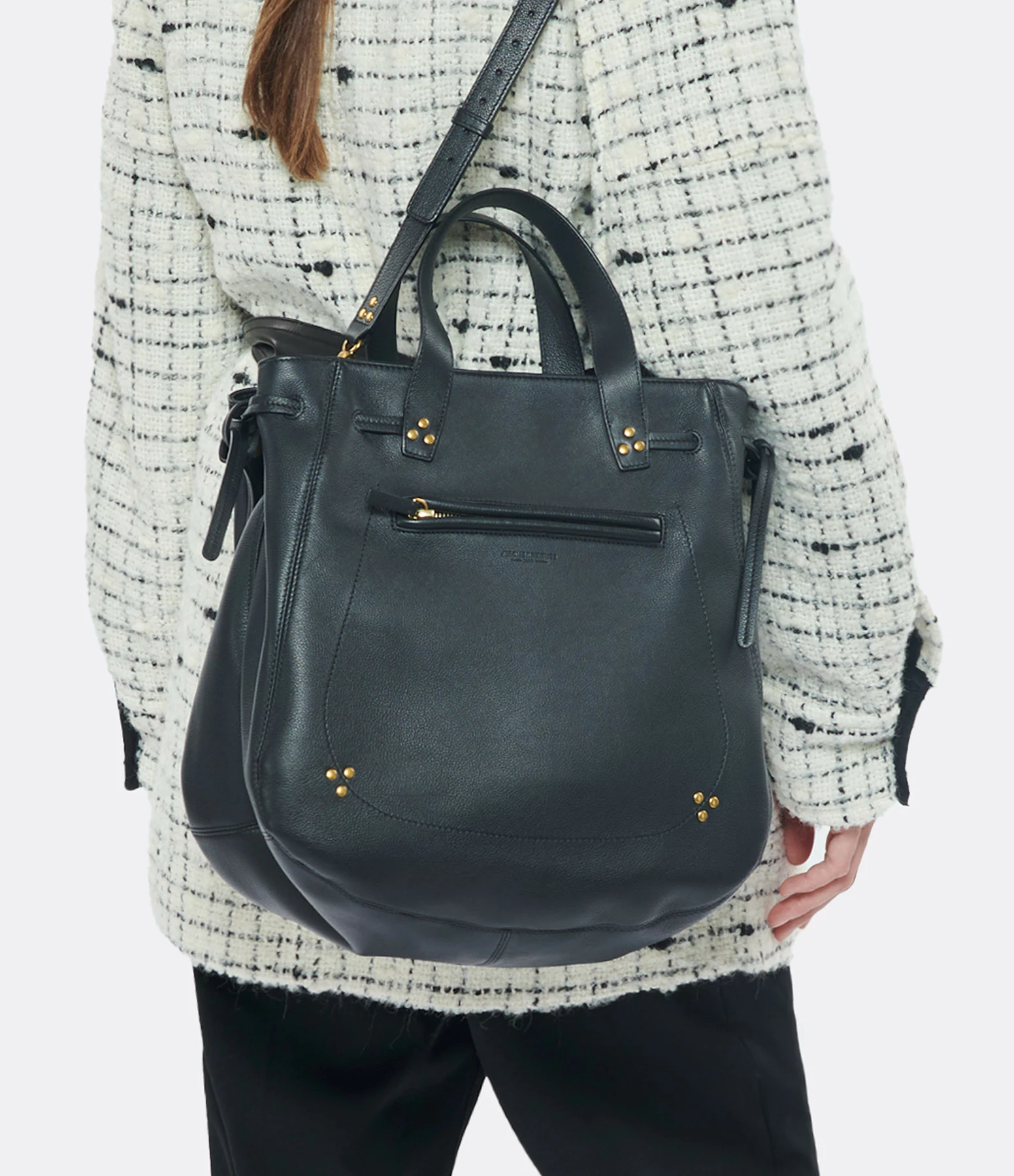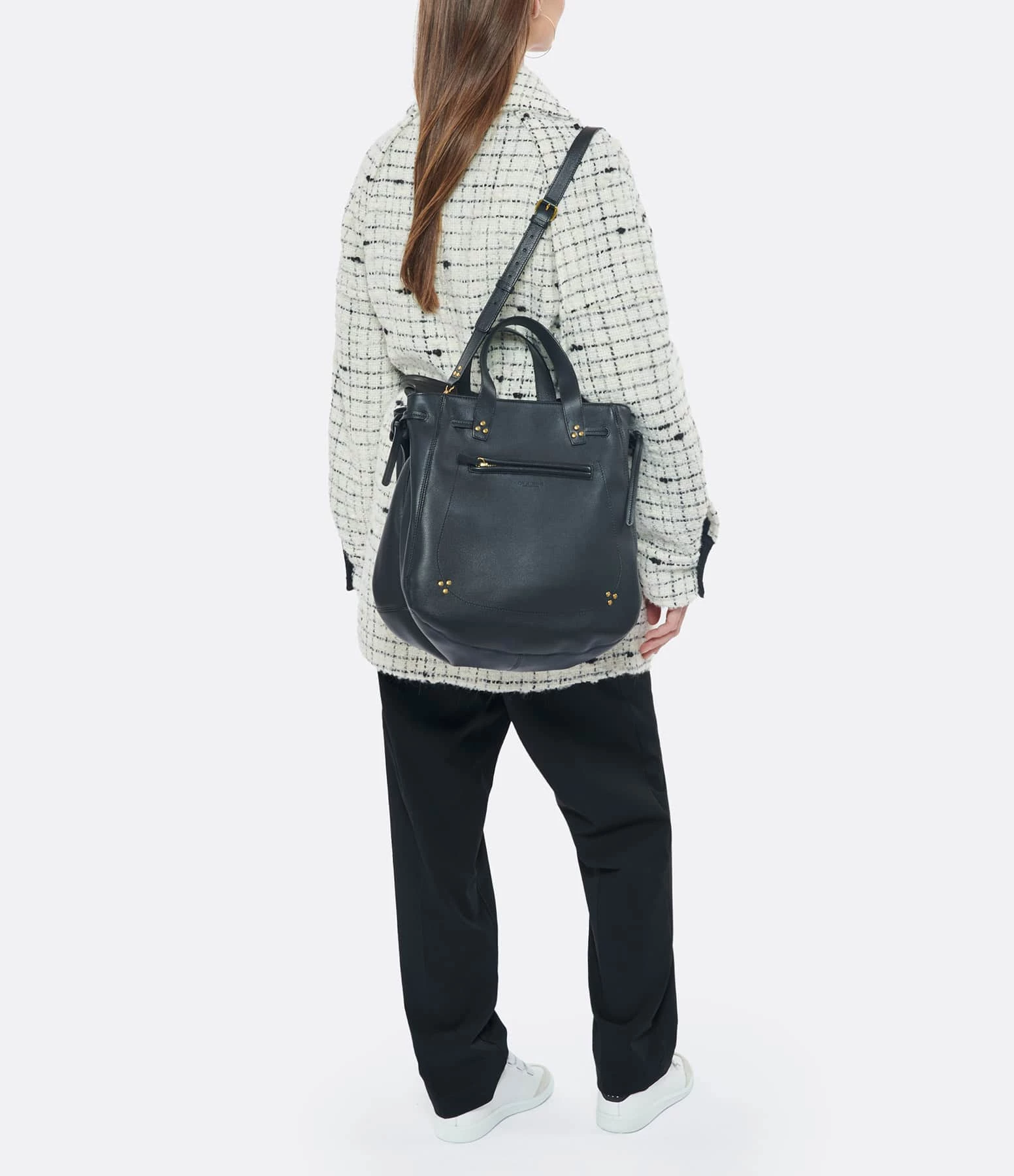 Sac à main en cuir grainé noir, avec une poche zippée à l’avant. Deux petites poignets et une bandoulière amovible. Intérieur doublé en coton avec une poche zippée et Fermeture zippée.