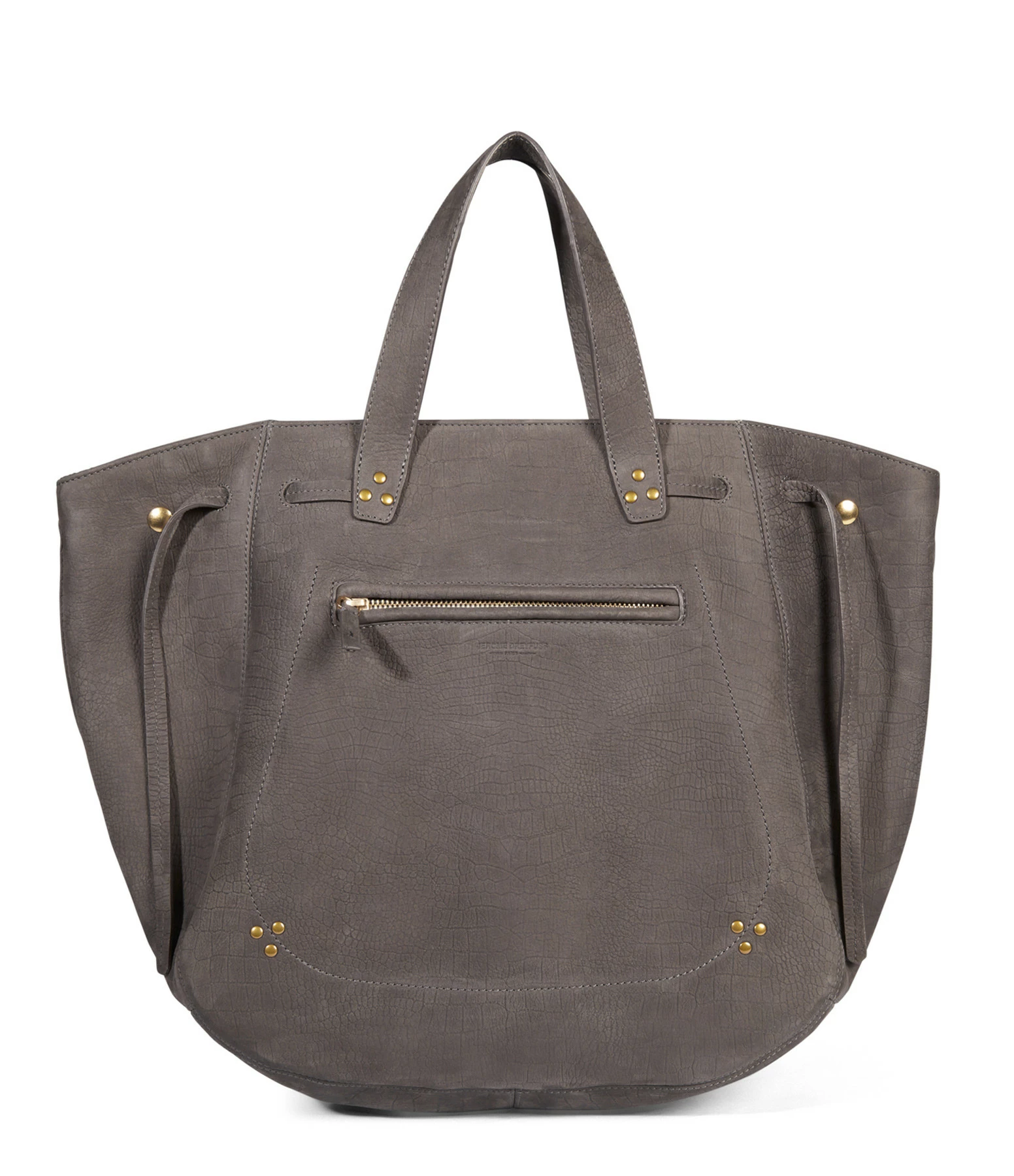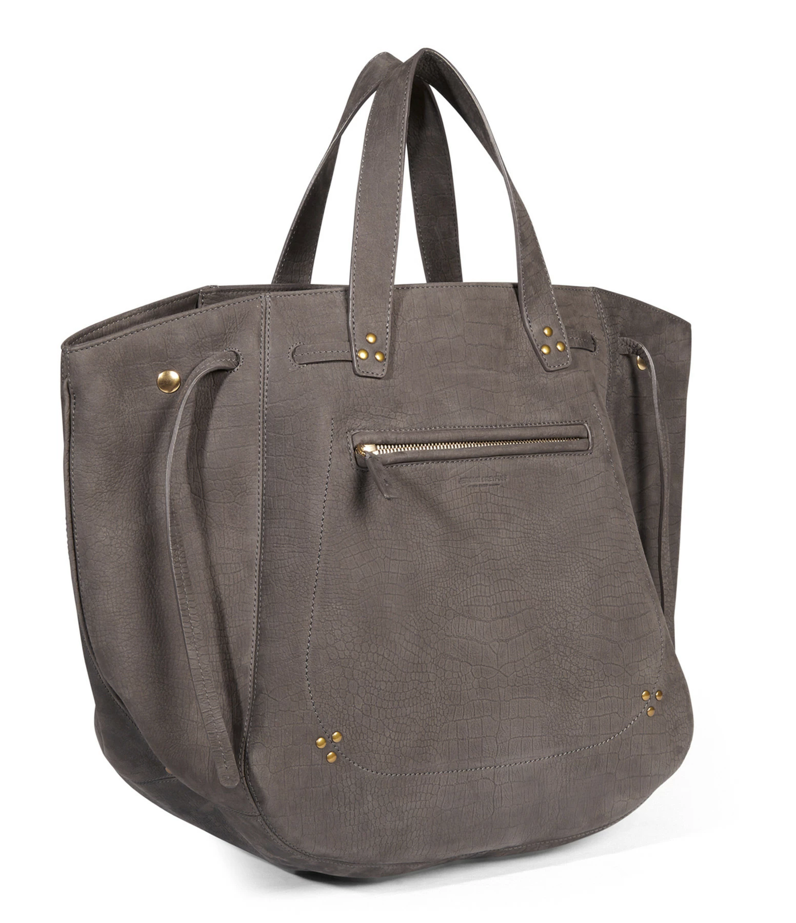 Sac à main en cuir suédé effet croco gris, avec une poche zippée à l’avant. Deux petites poignets et une bandoulière amovible. Intérieur doublé en coton avec une poche zippée et Fermeture zippée.