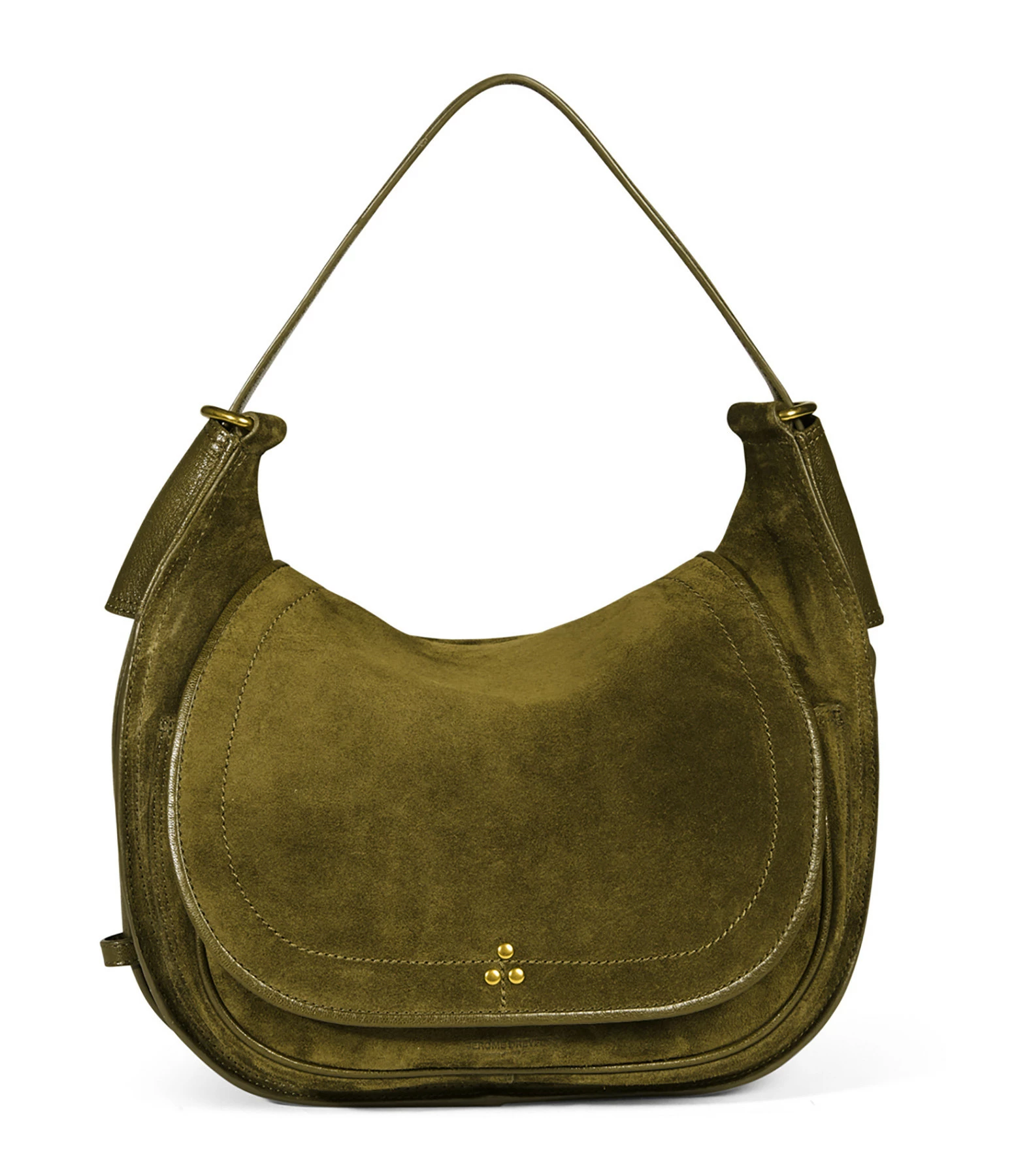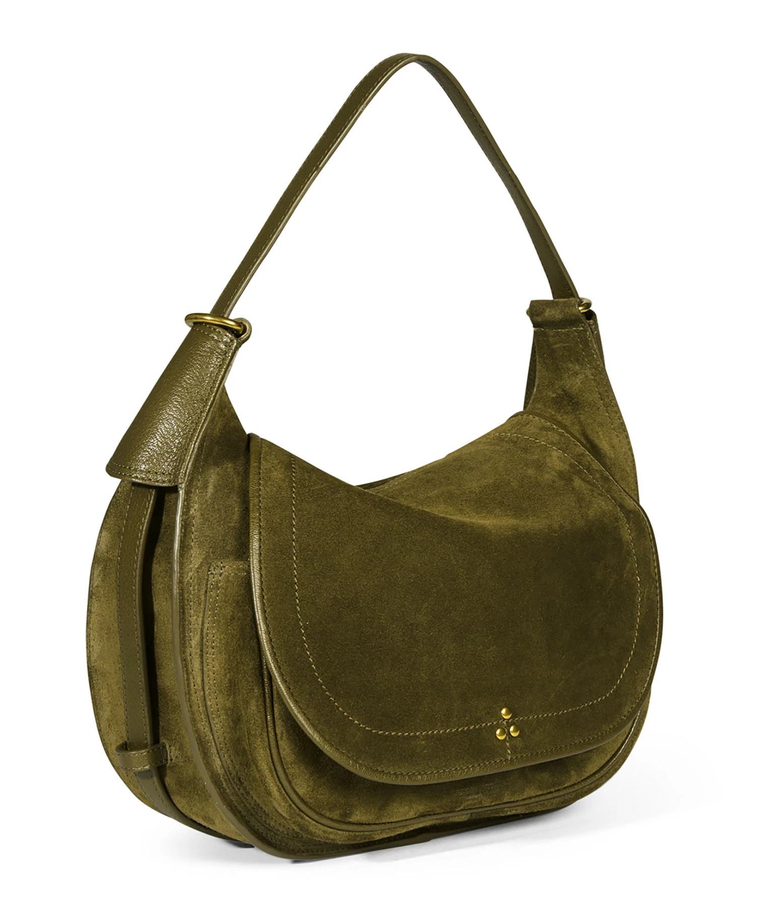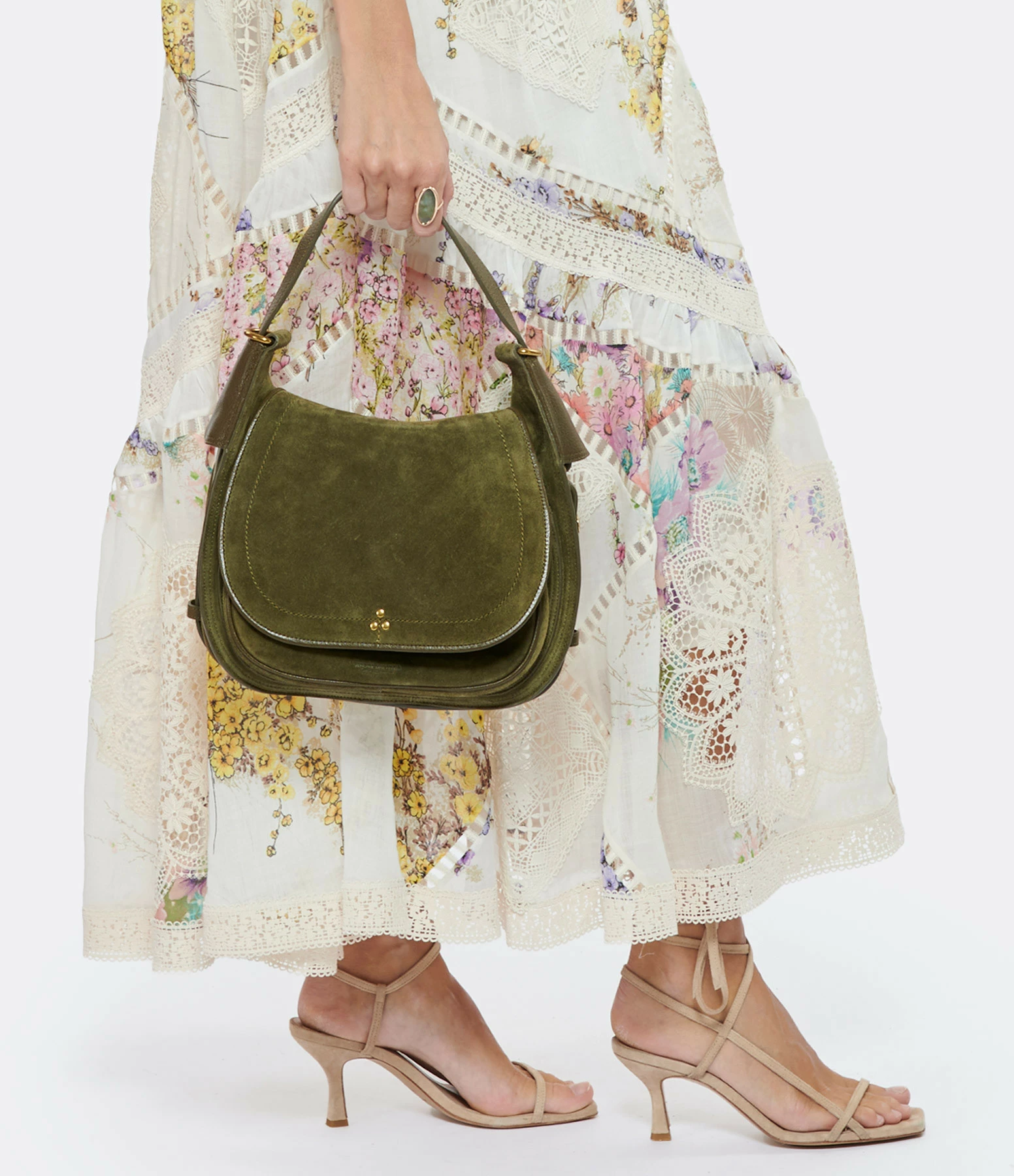 Sac besace en cuir suédé vert. Une anse réglable en deux longueurs. Intérieur en cuir, un grand compartiment et une poche plaquée sous le rabat.