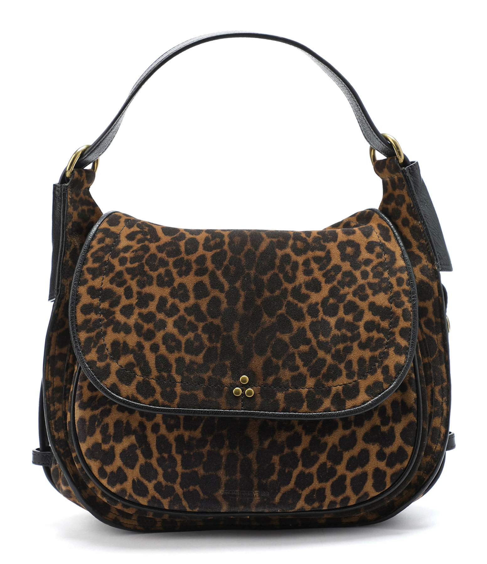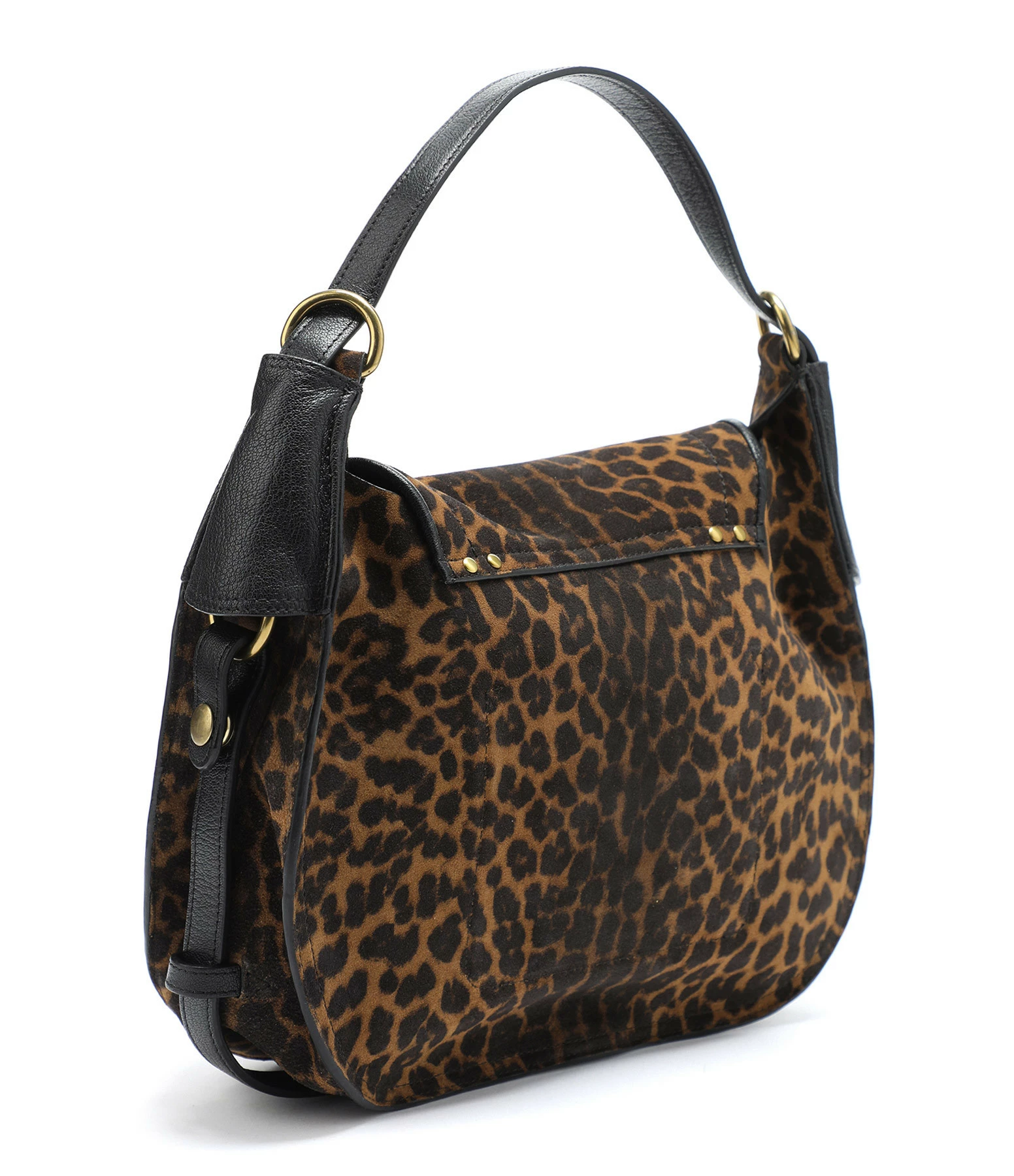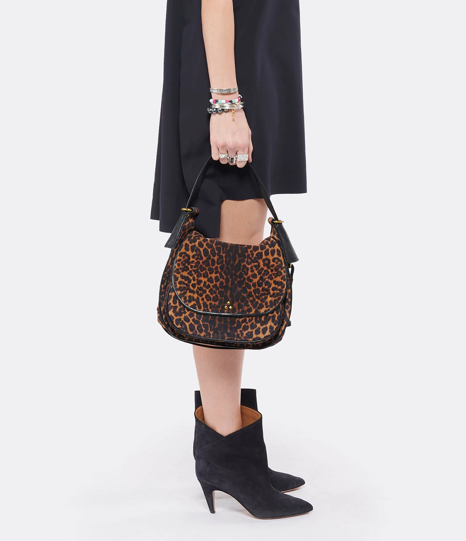 Sac besace en cuir suédé imprimé léopard. Une anse réglable en deux longueurs. Intérieur en cuir, un grand compartiment et une poche plaquée sous le rabat.