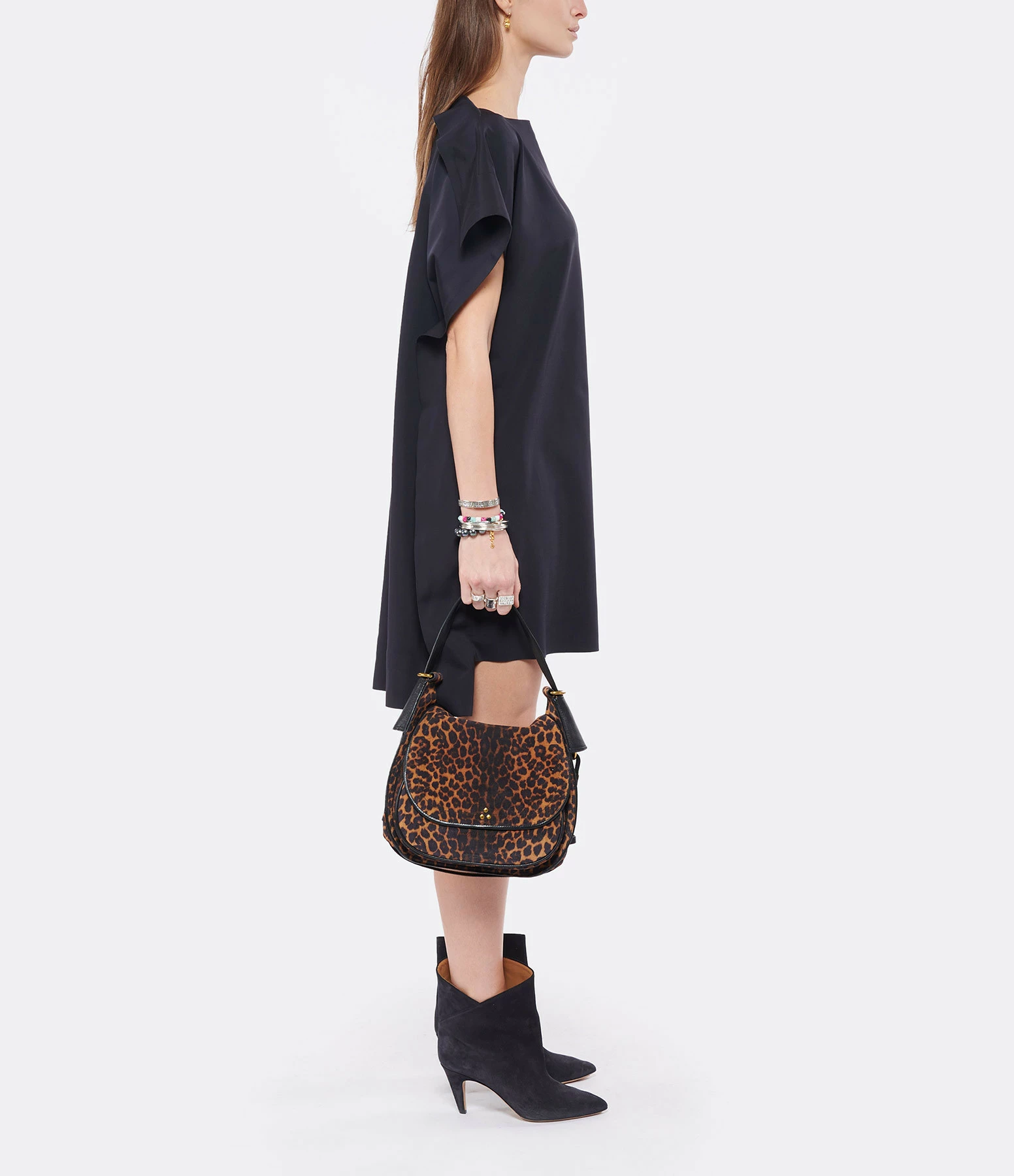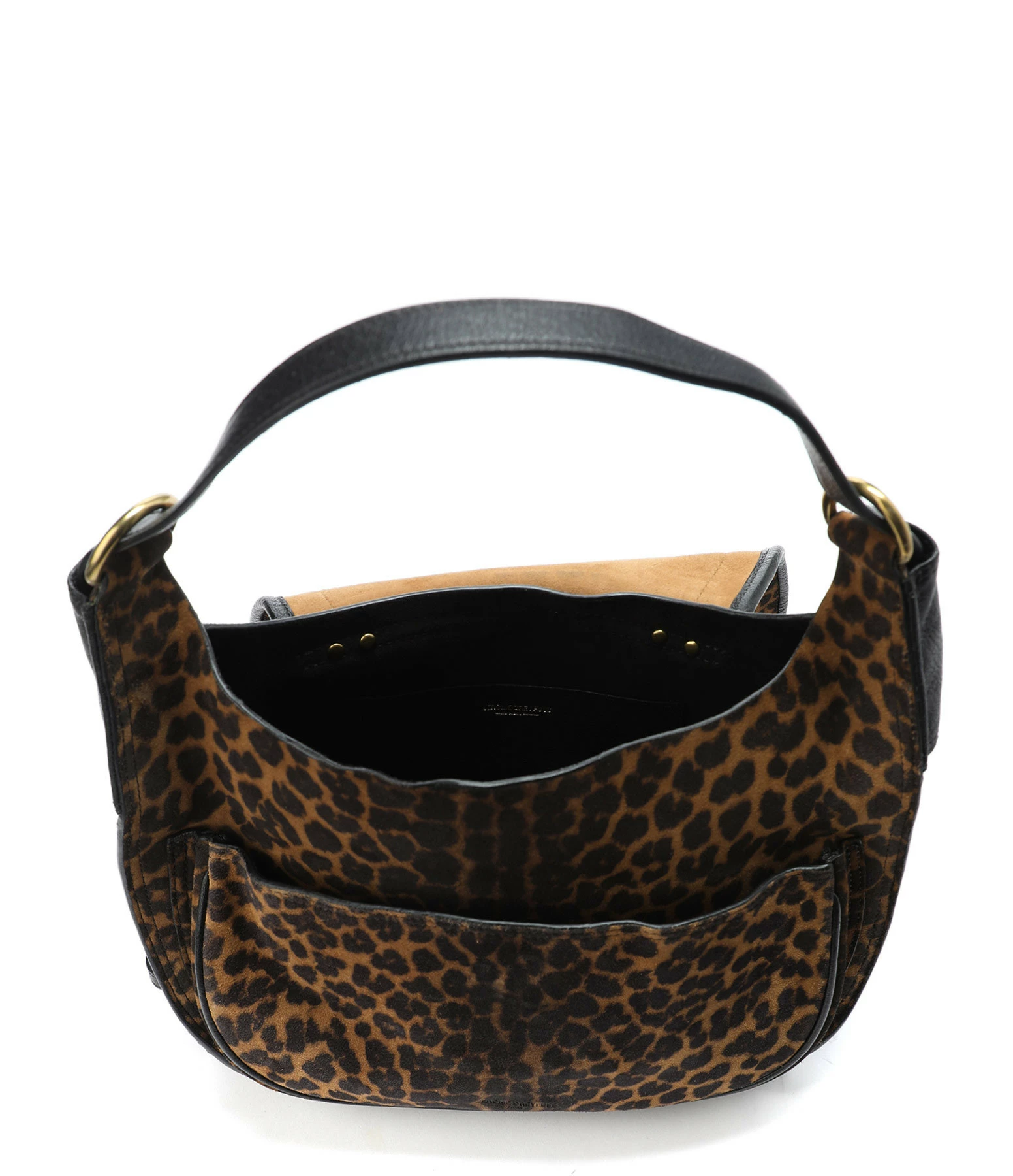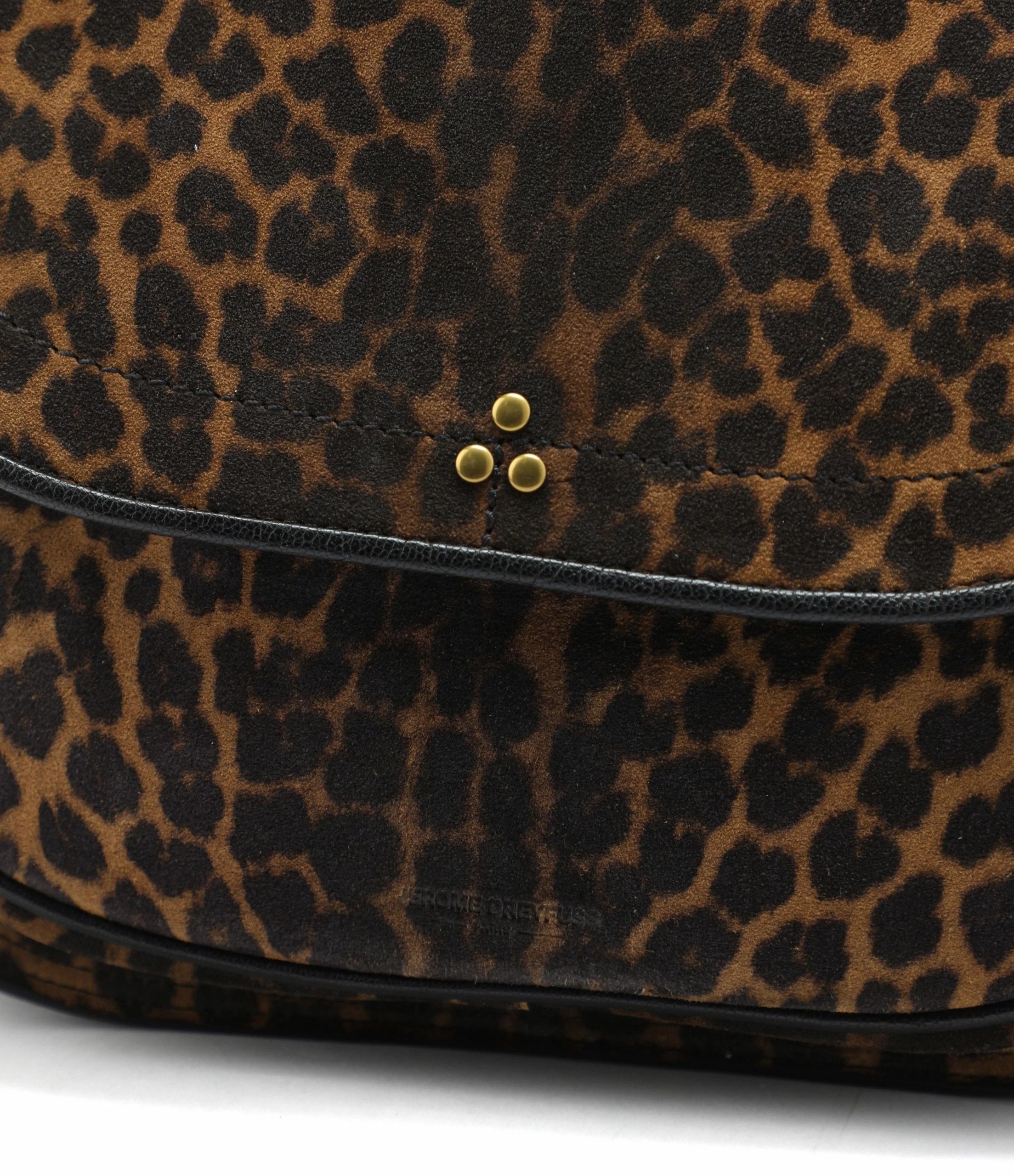 Sac besace en cuir suédé imprimé léopard. Une anse réglable en deux longueurs. Intérieur en cuir, un grand compartiment et une poche plaquée sous le rabat.