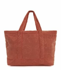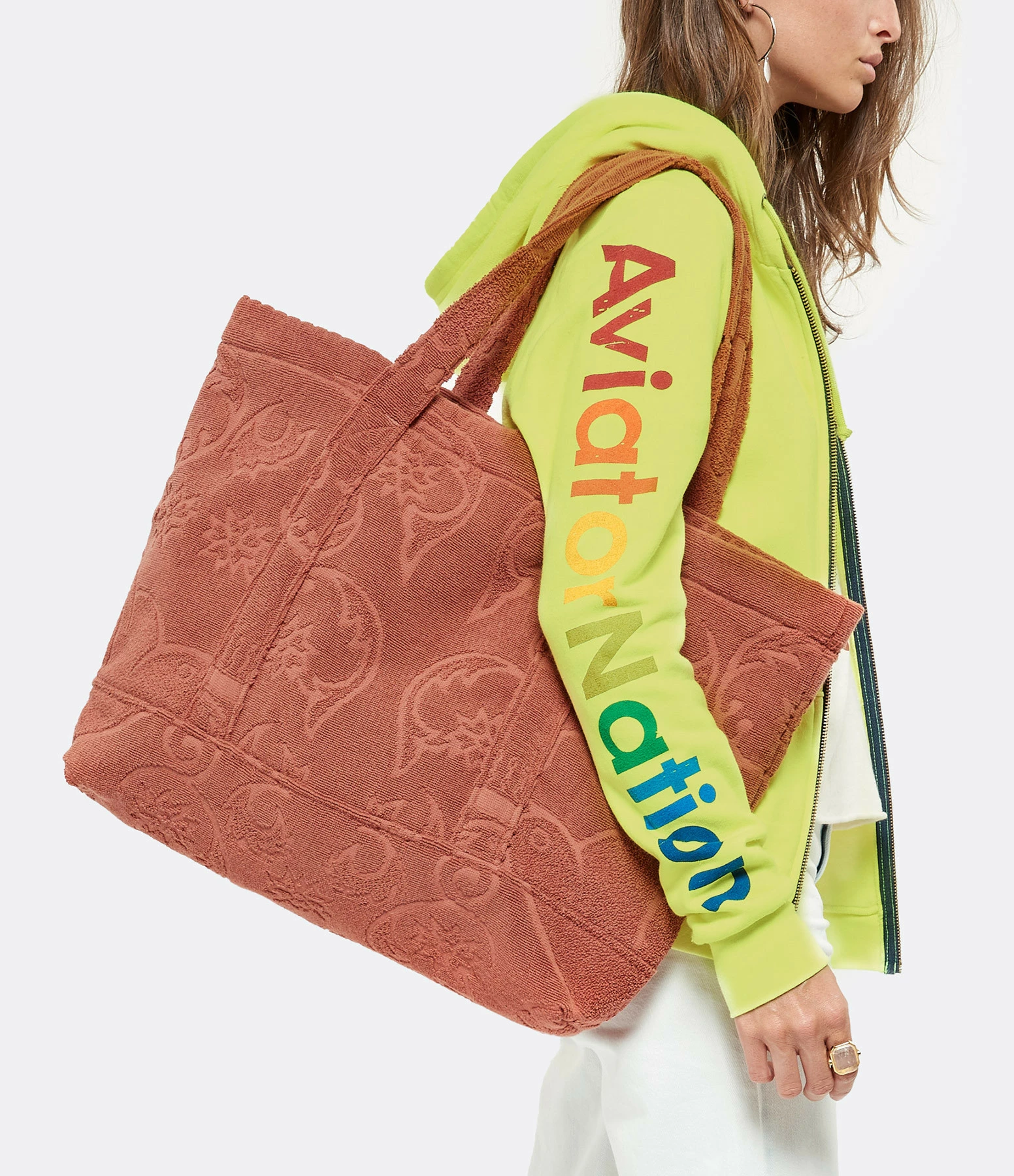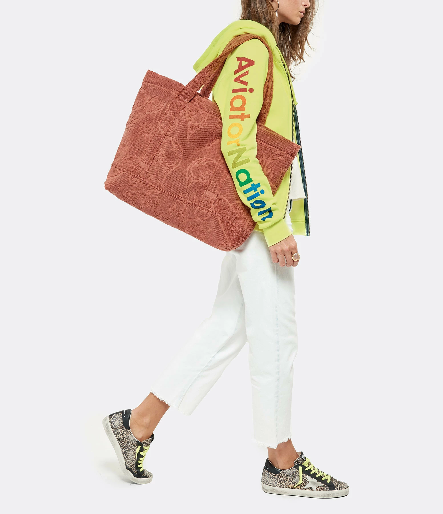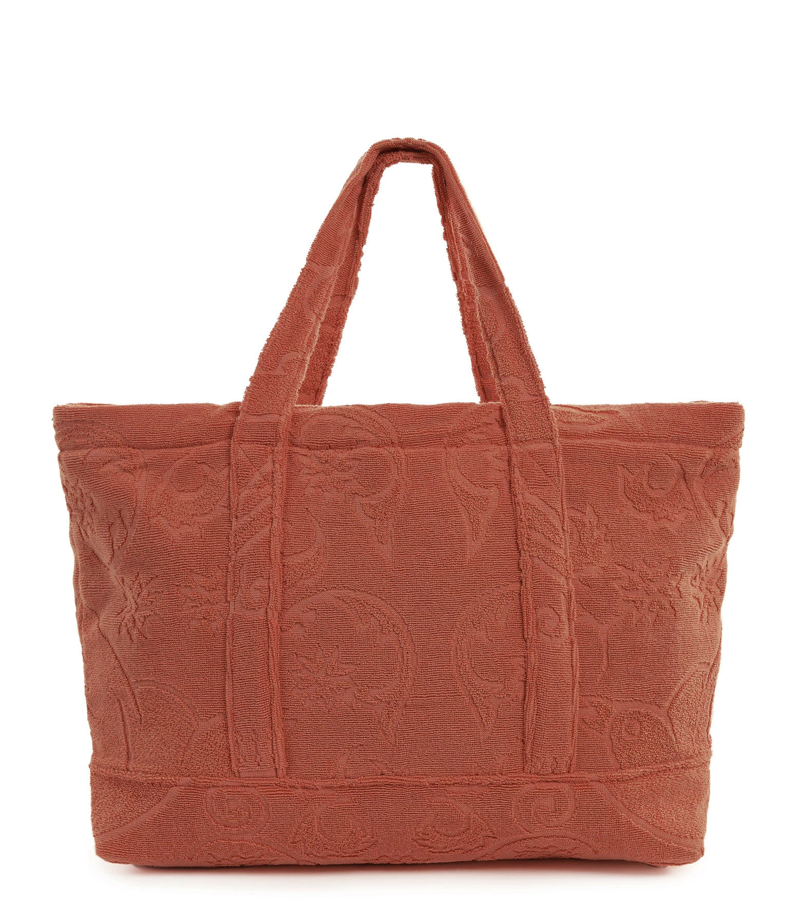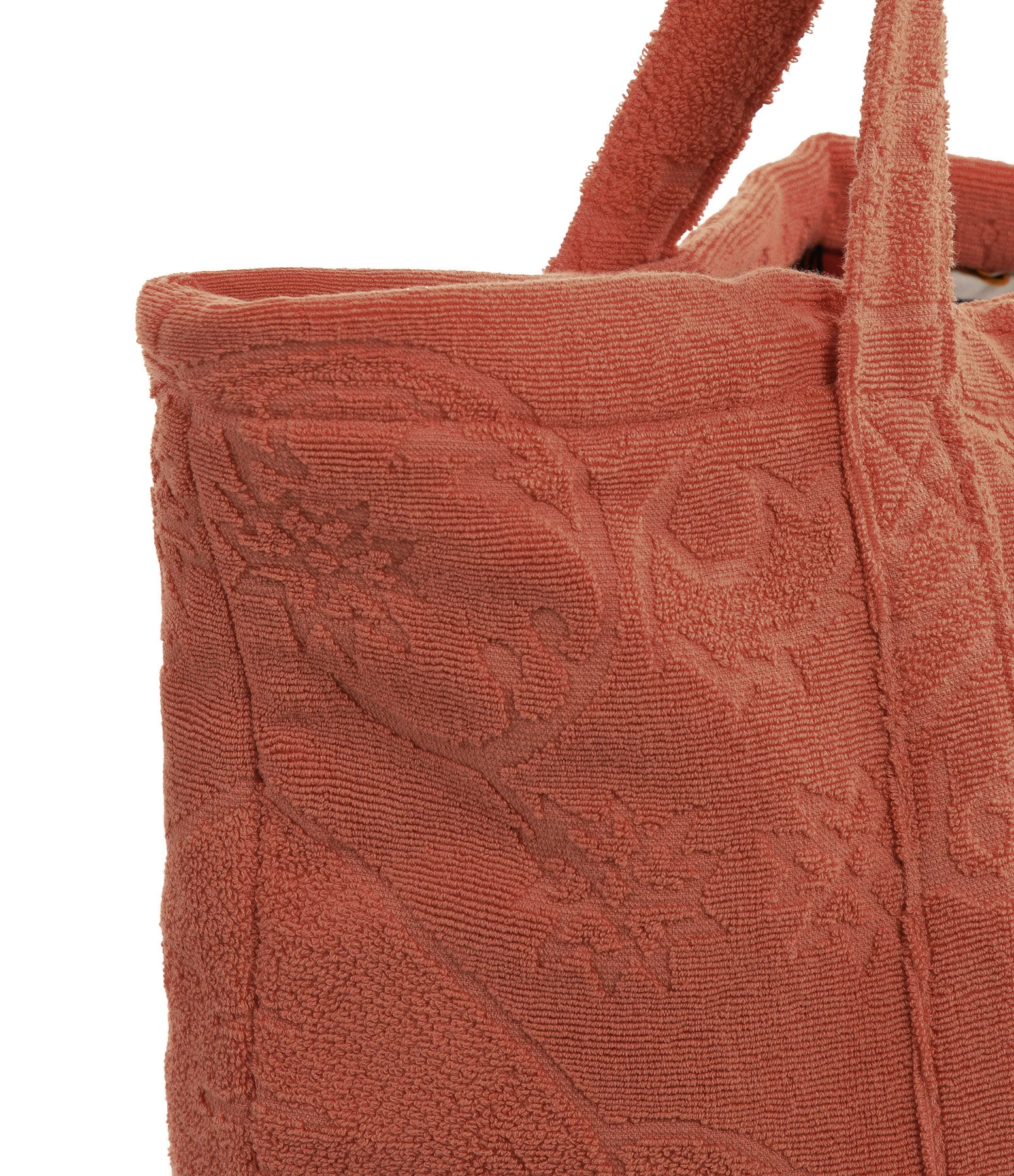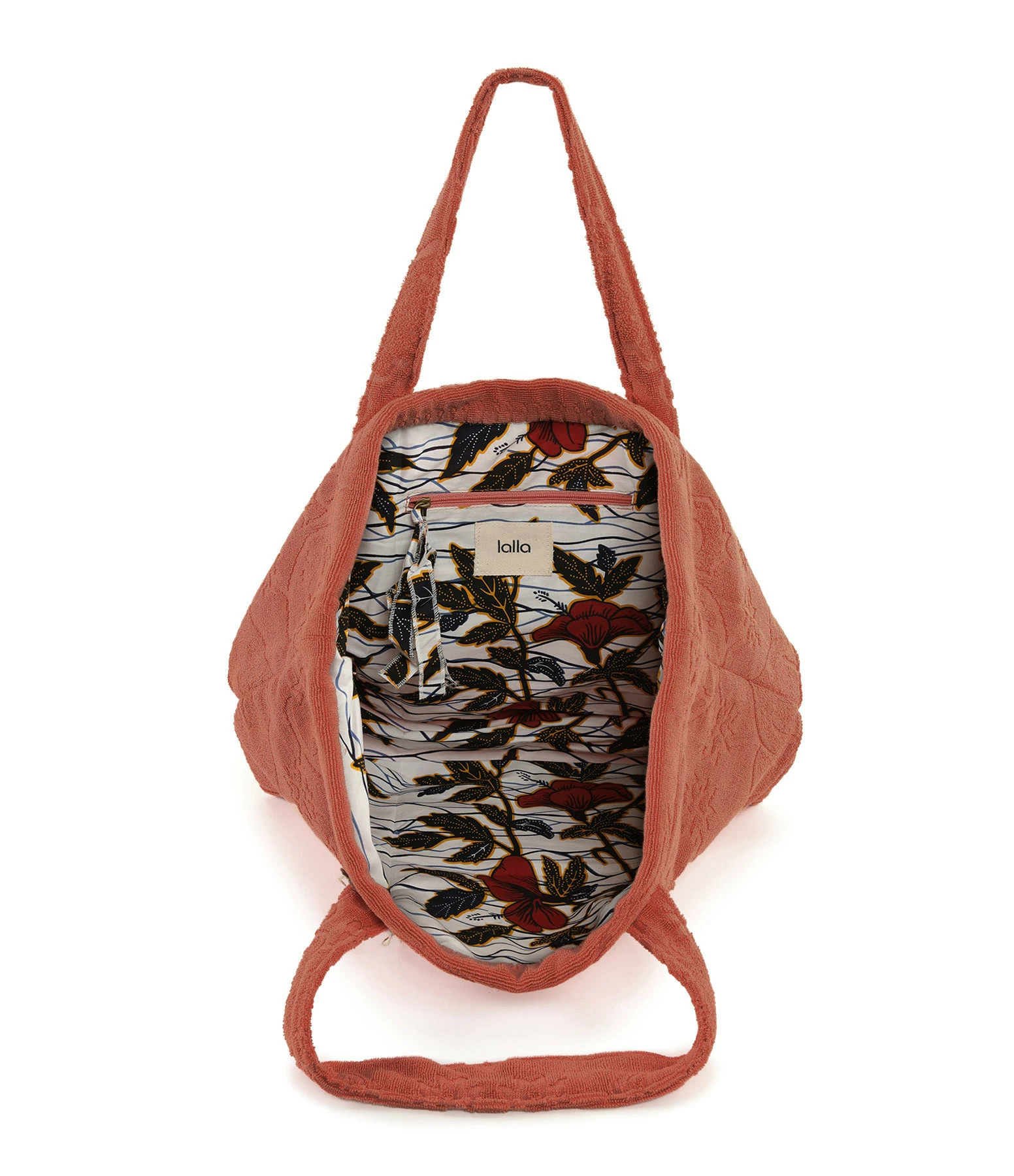 Sac terracotta en serviette éponge à motifs texturés. Intérieur doublé en tissu à imprimé wax (motifs africains).