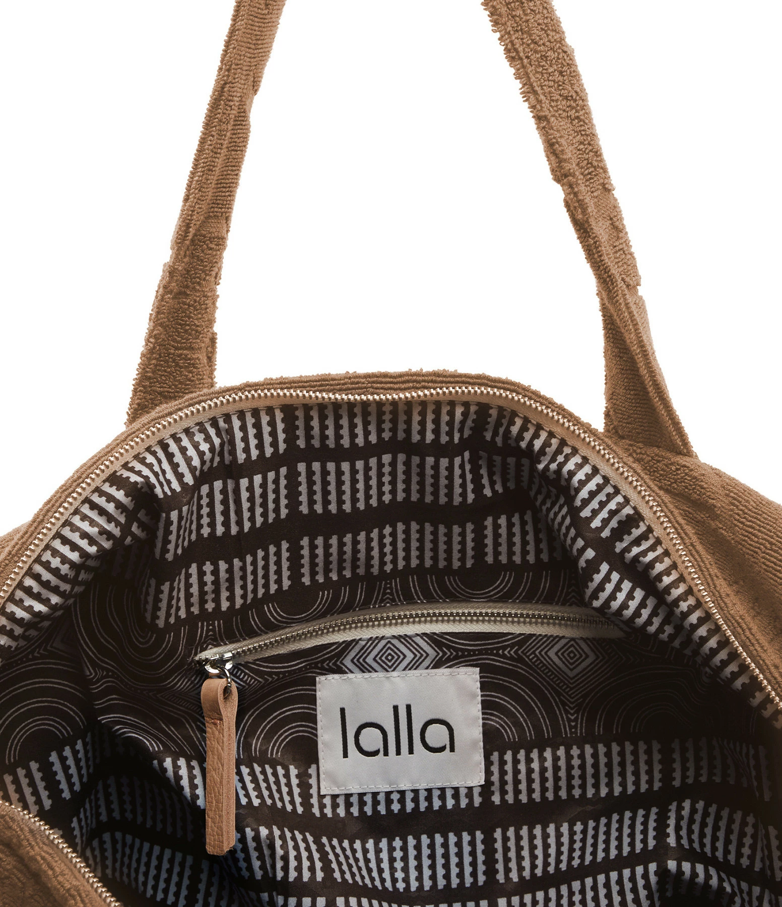 Sac de plage marron en serviette éponge à motifs texturés. Fermeture par un zip avec languette en cuir. Intérieur doublé en tissu à imprimé wax (motifs africains).