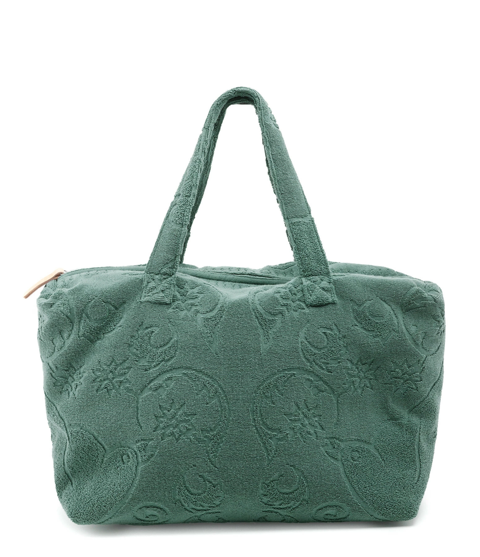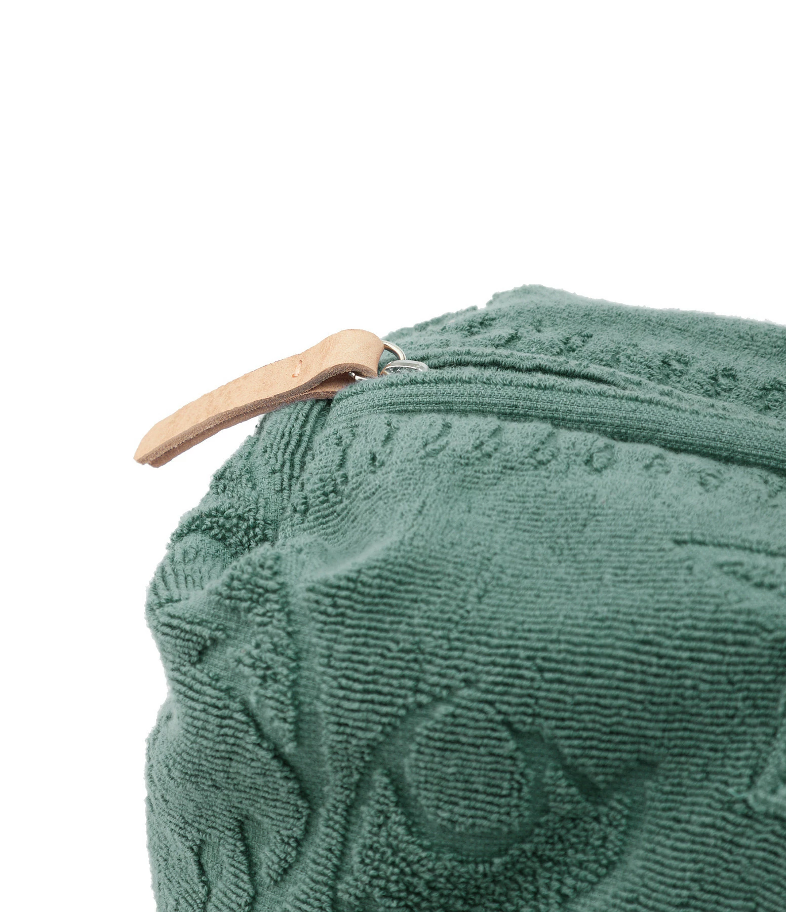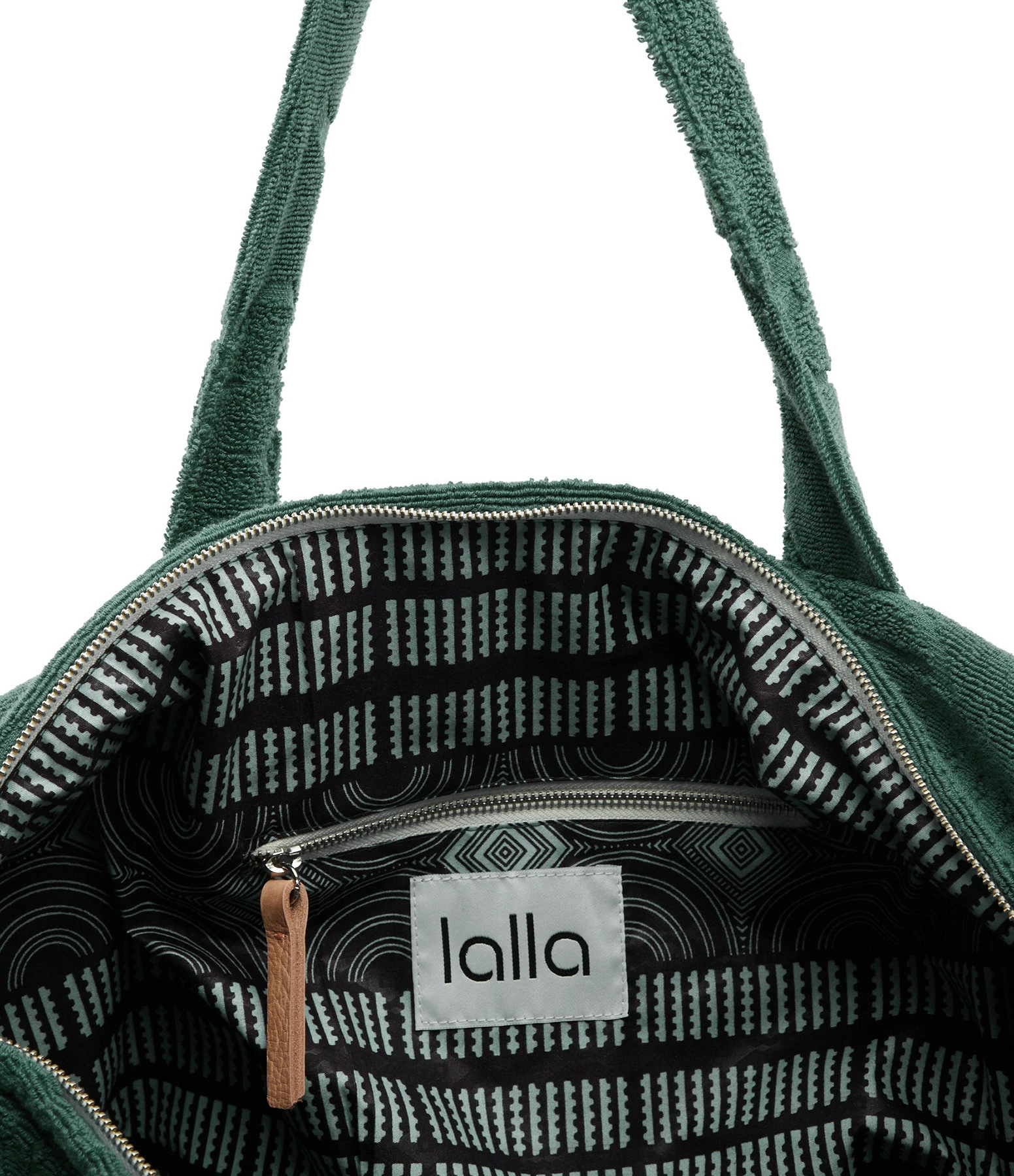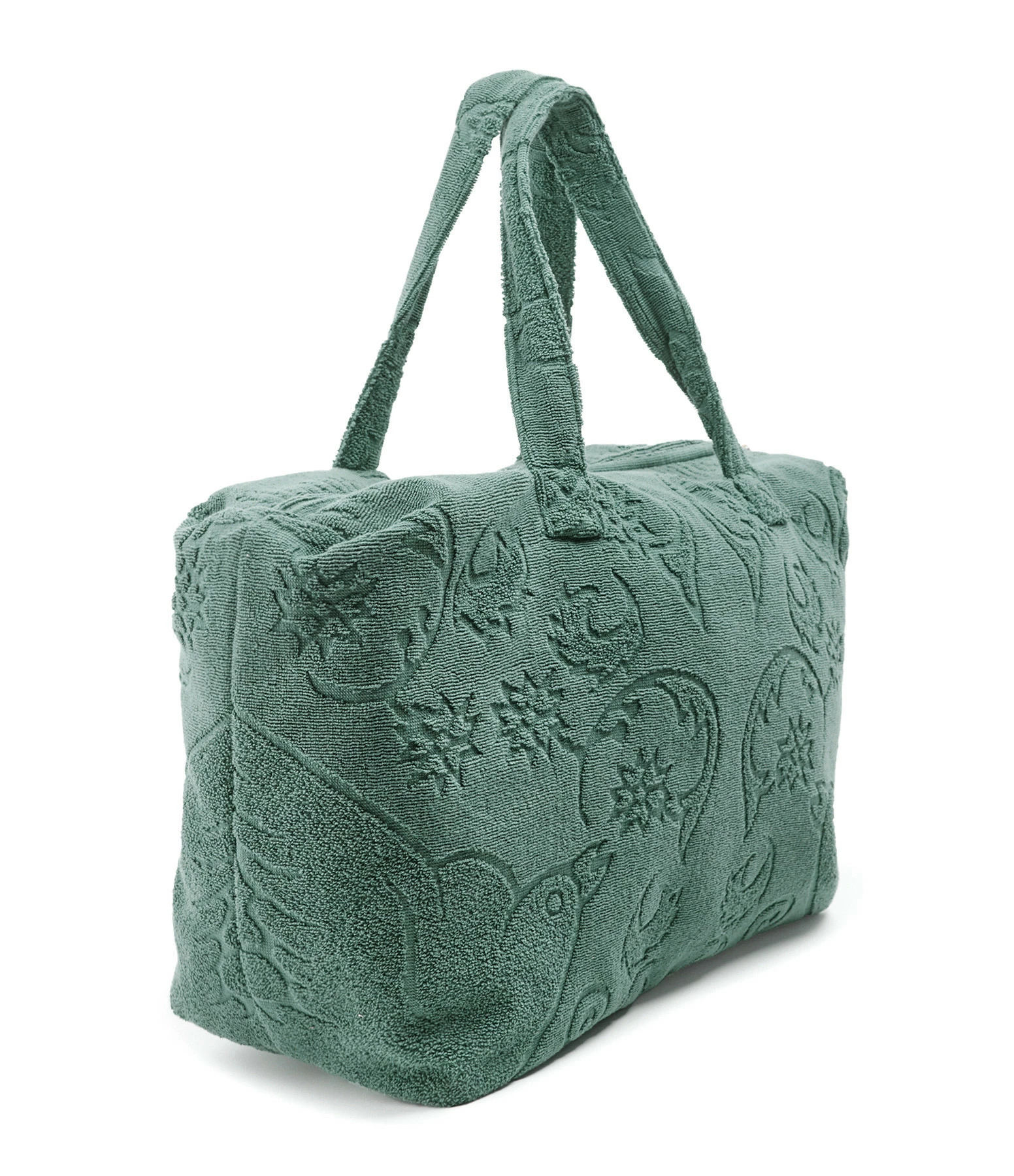 Sac de plage vert en serviette éponge à motifs texturés. Fermeture par un zip avec languette en cuir. Intérieur doublé en tissu à imprimé wax (motifs africains).