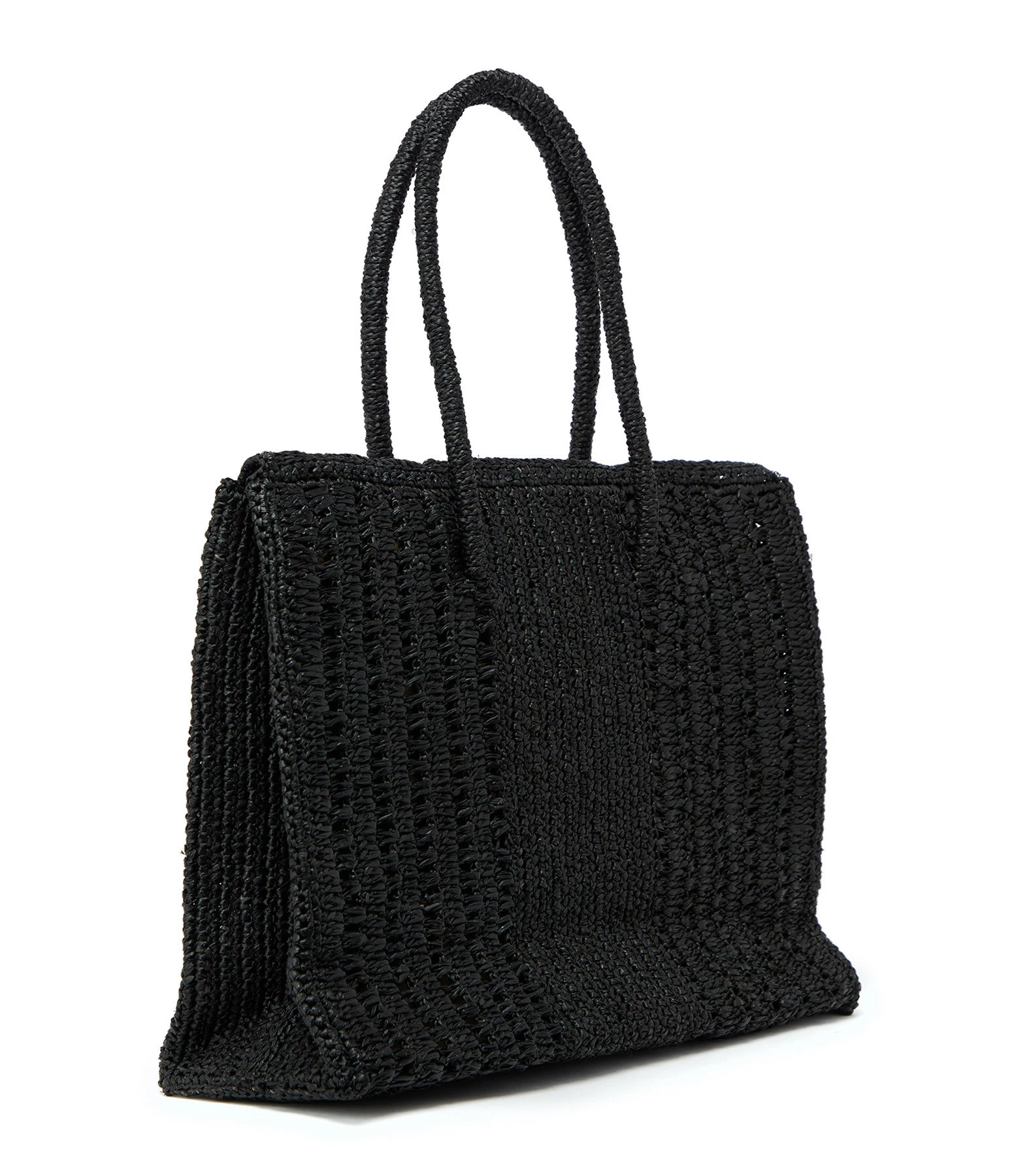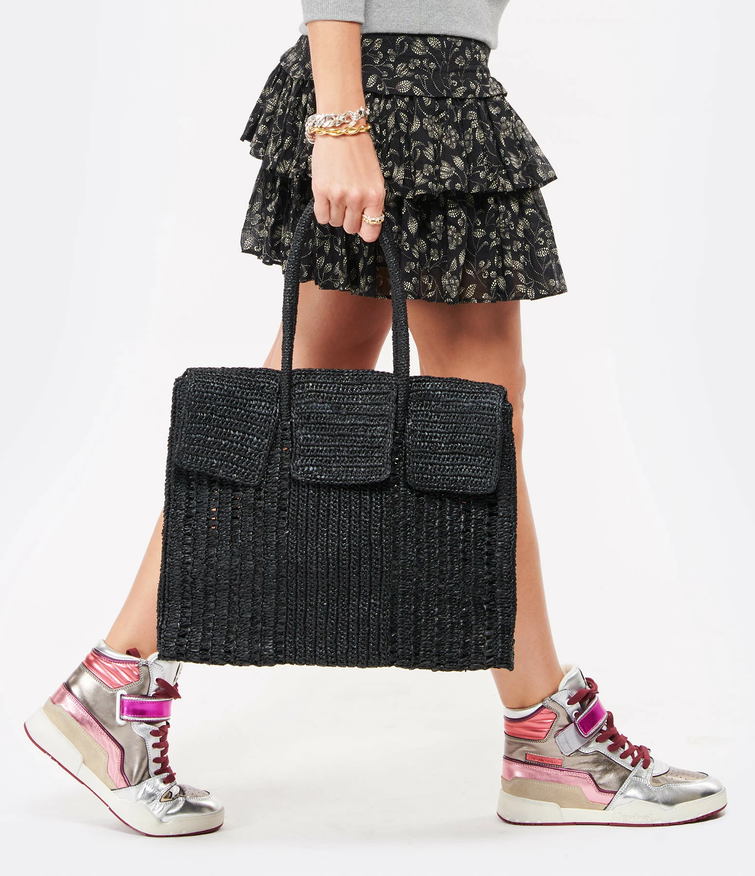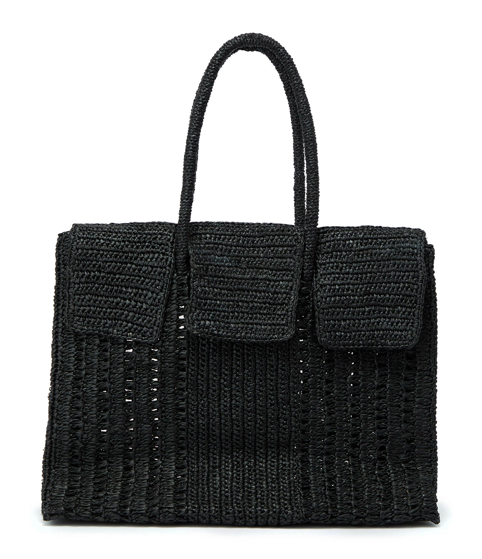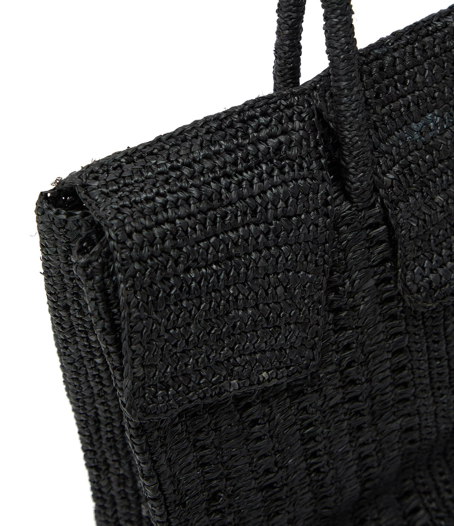 Sac à main avec 3 rabats en raphia noir. Deux anses roulotées en raphia. Une poche plaquée en raphia.