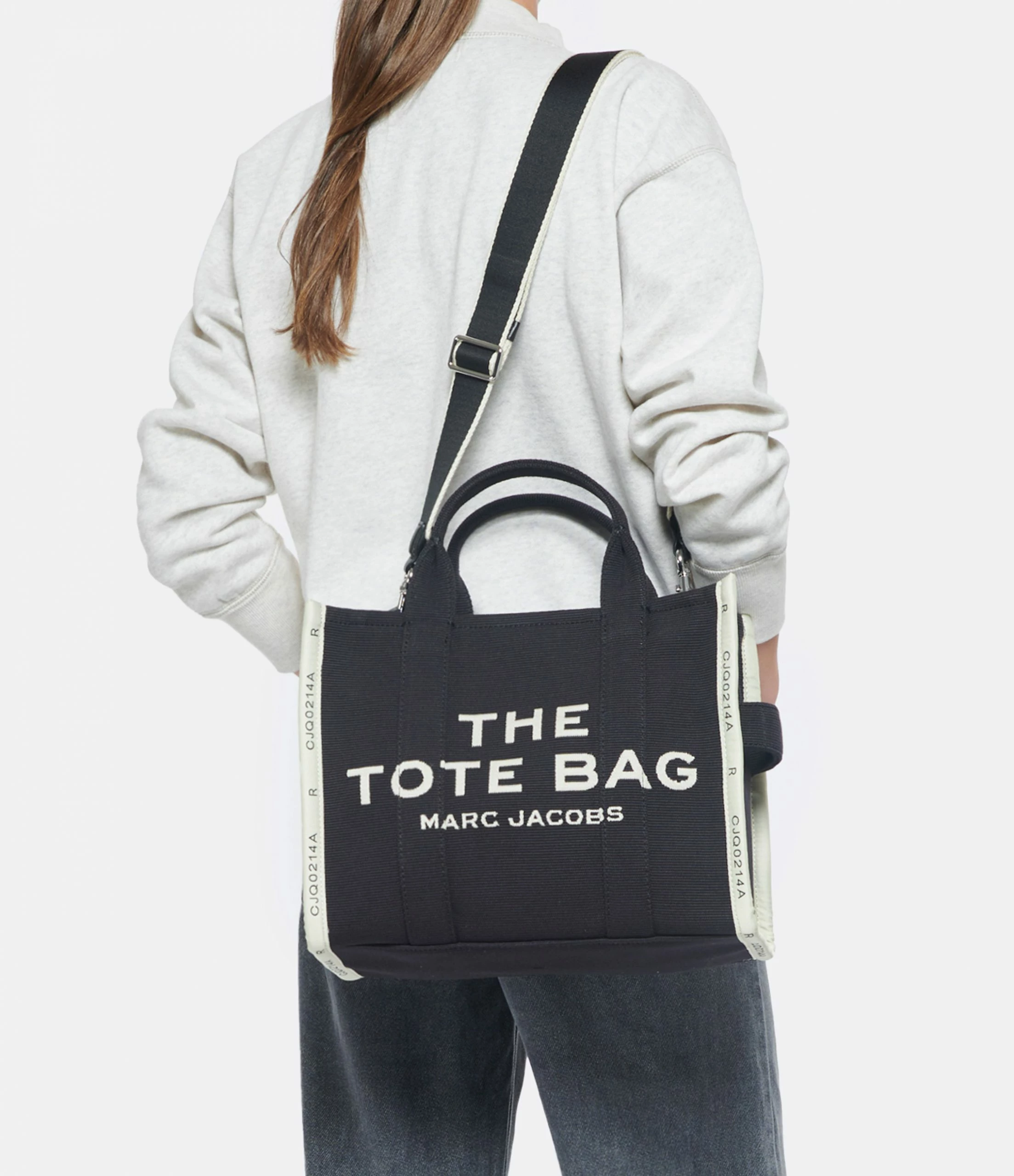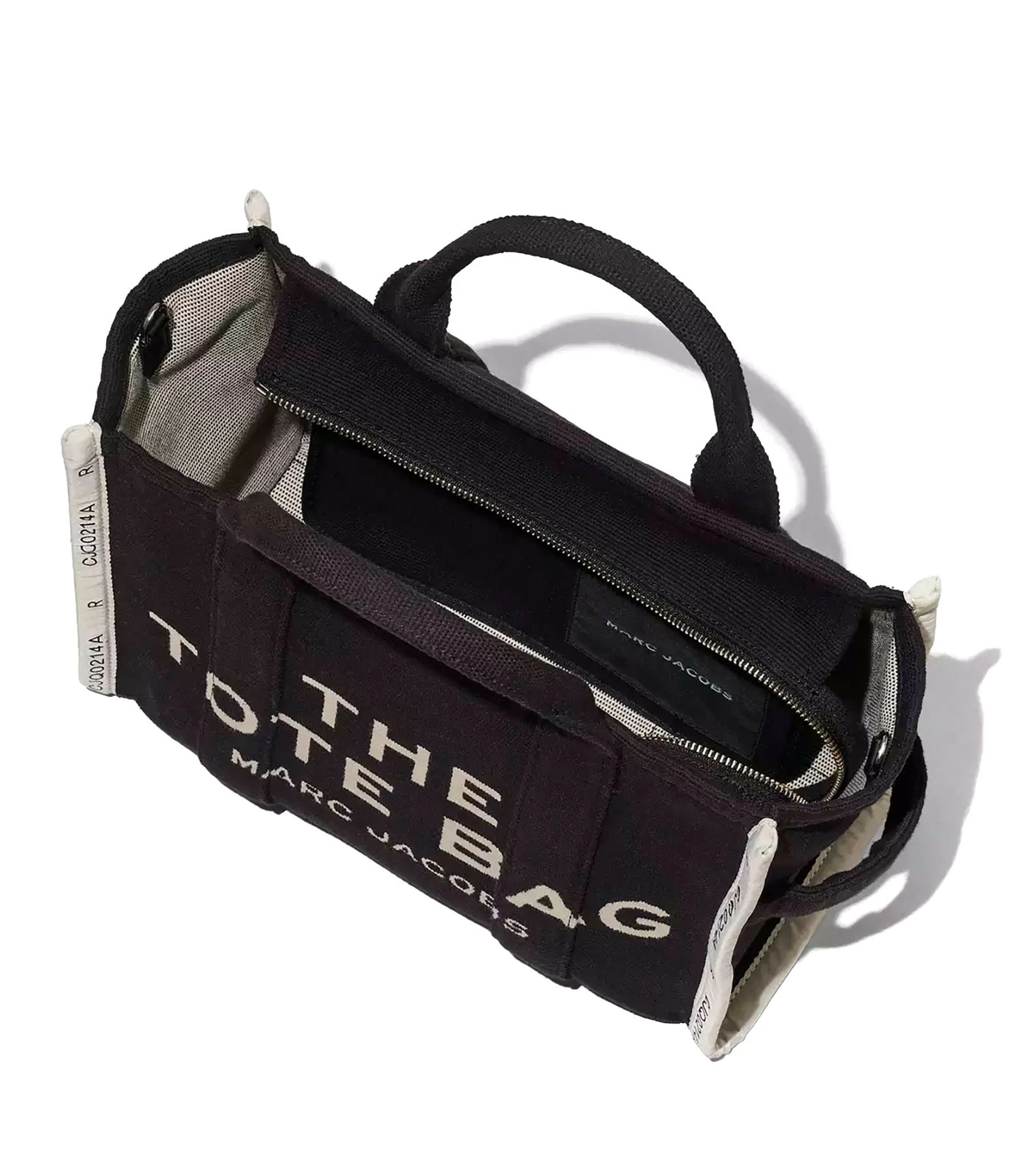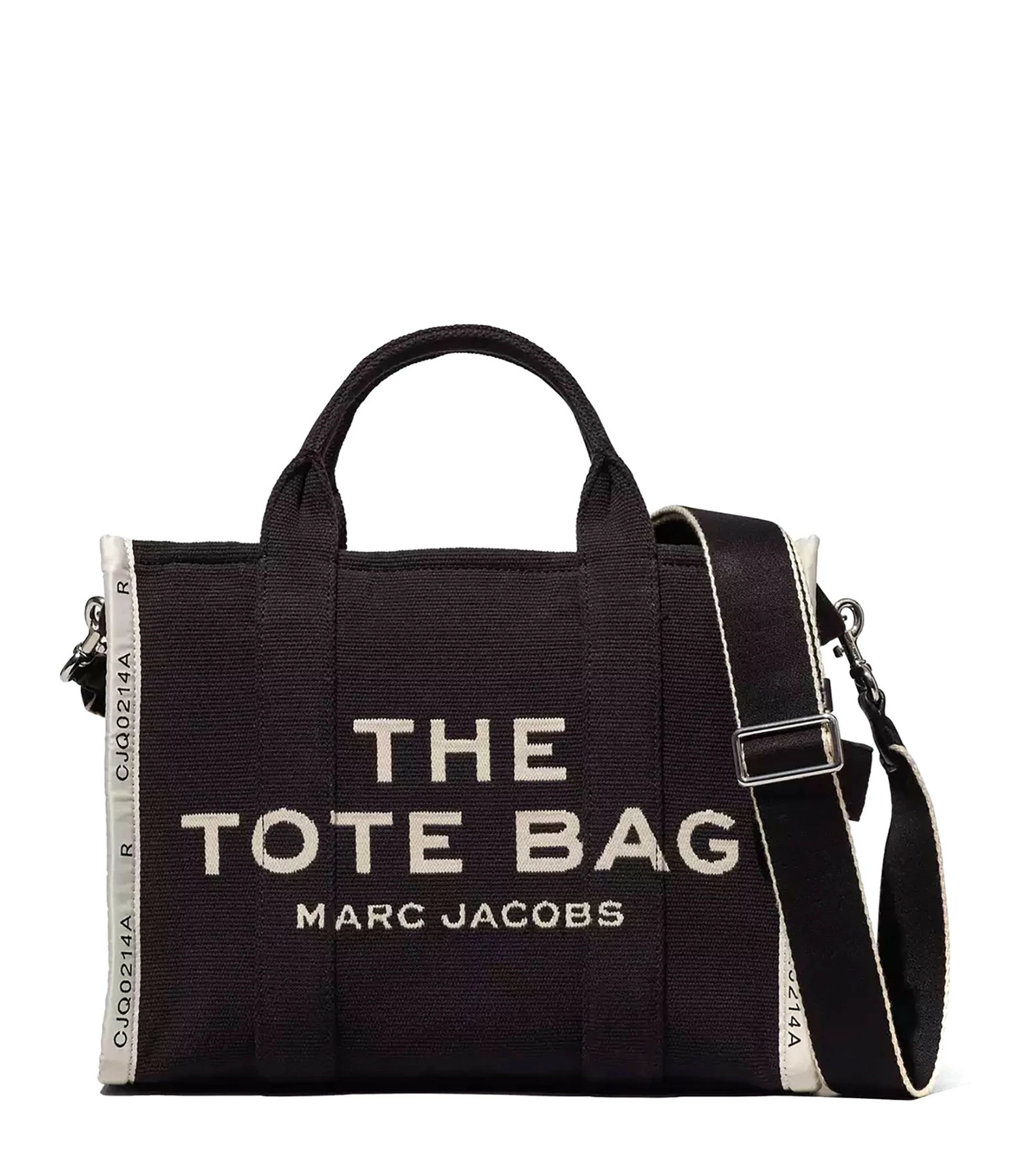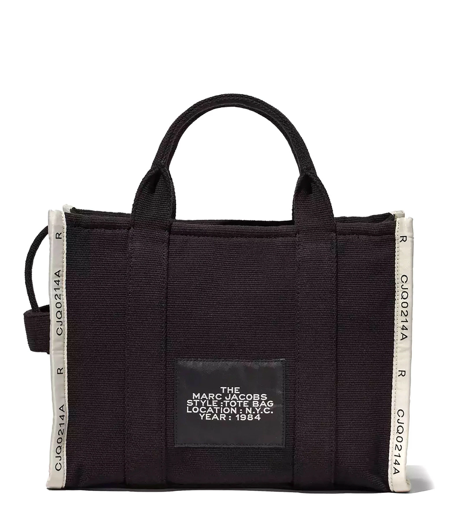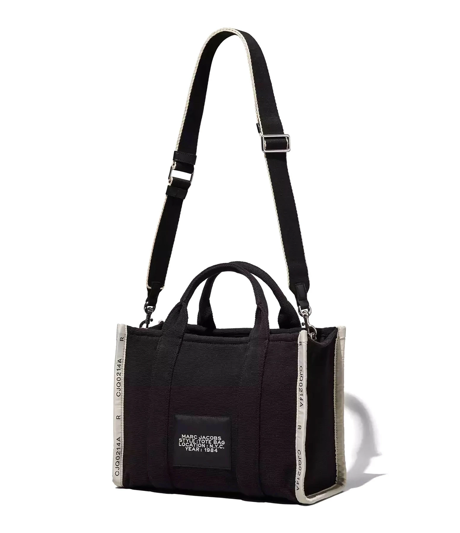 Sac cabas petit format en jacquard de coton noir. Deux anses et une bandoulière amovible et ajustable par mousqueton. Inscription “THE TOTE BAG MARC JACOBS” tissée en beige sur le devant. Fermeture zippée. Un patch noir cousu dans le dos avec l’inscription “MARC JACOBS STYLE : THE TOTE BAG LOCATION : N.Y.C. YEAR : 1984” brodée en beige. Une anse sur le côté. Intérieur organisé en un grand compartiment avec une poche zippée et deux poches plaquées. Un patch noir avec l’inscription “THE MARC JACOBS” brodée en beige sur une des poches plaquées intérieures.