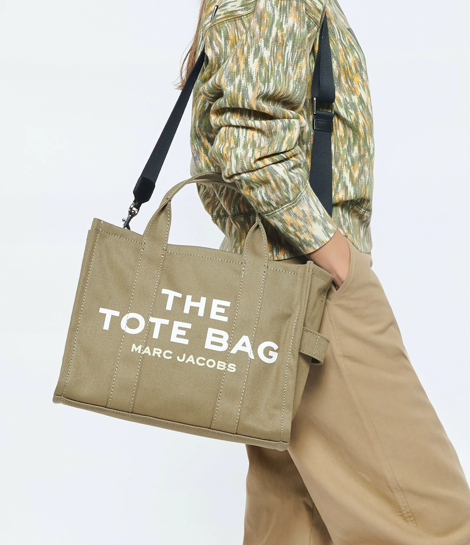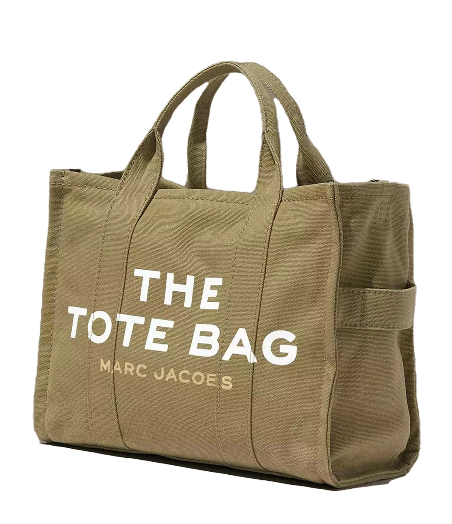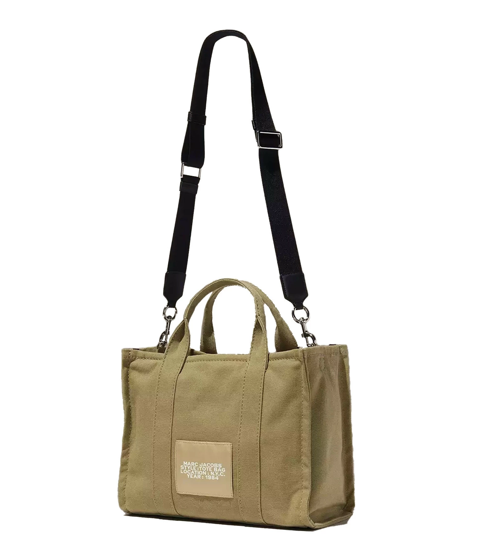 Sac cabas petit format en jacquard de coton kaki. Deux anses et une bandoulière noire amovible et ajustable par mousqueton. Inscription “THE TOTE BAG MARC JACOBS” sérigraphiée en blanc et vert clair sur le devant. Fermeture zippée. Un patch vert clair cousu dans le dos avec l’inscription “MARC JACOBS STYLE : THE TOTE BAG LOCATION : N.Y.C. YEAR : 1984” brodée en blanc. Une anse sur le côté. Intérieur organisé en un grand compartiment avec une poche zippée et deux poches plaquées. Un patch noir avec l’inscription “THE MARC JACOBS” brodée en blanc sur une des poches plaquées intérieures.