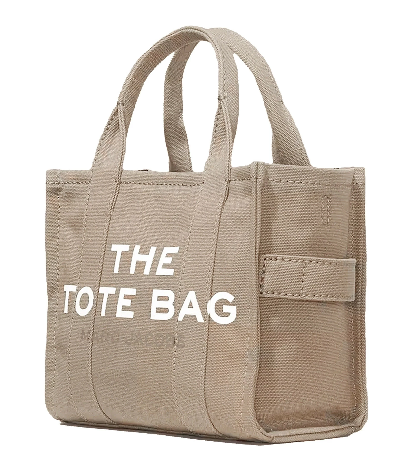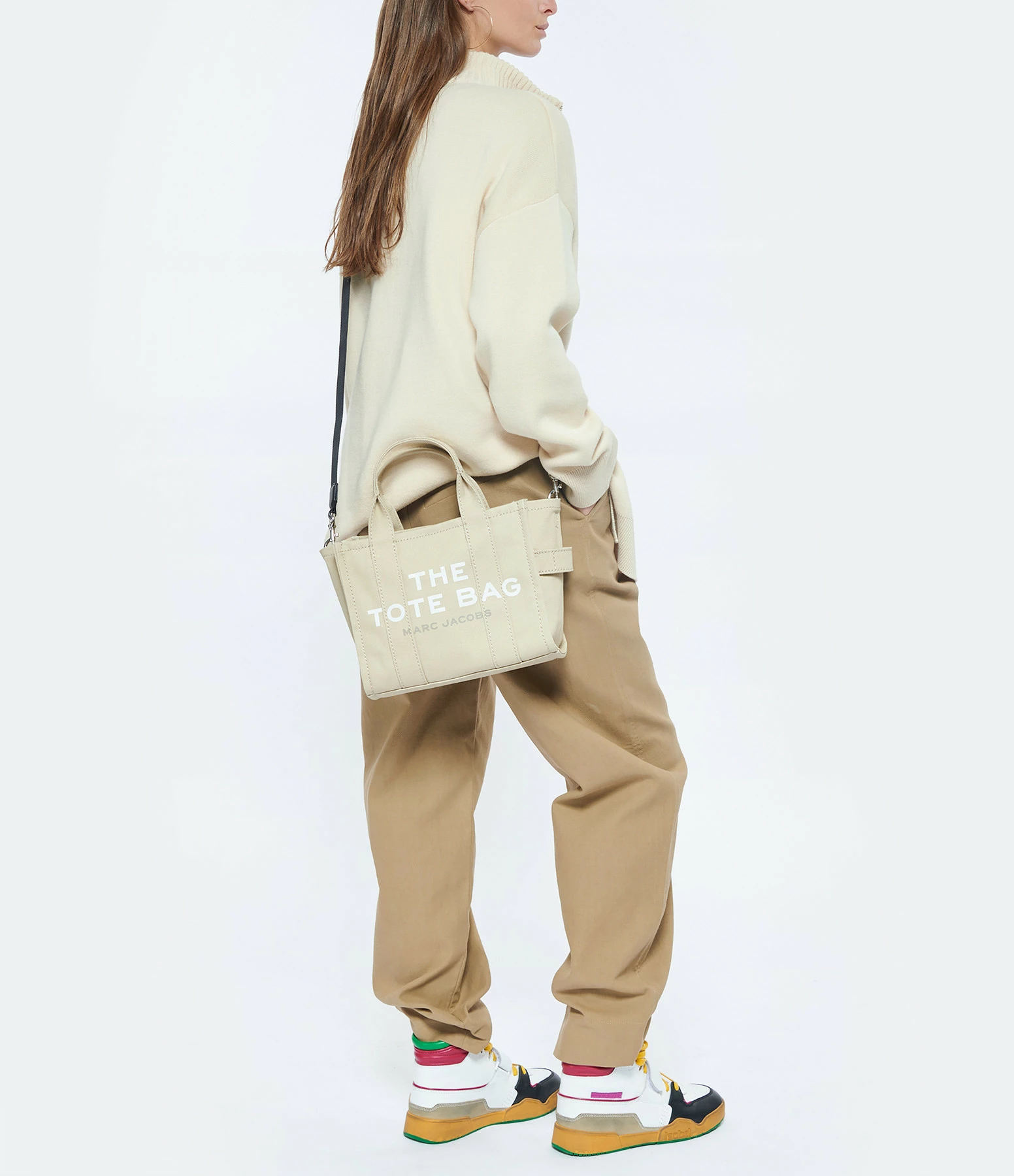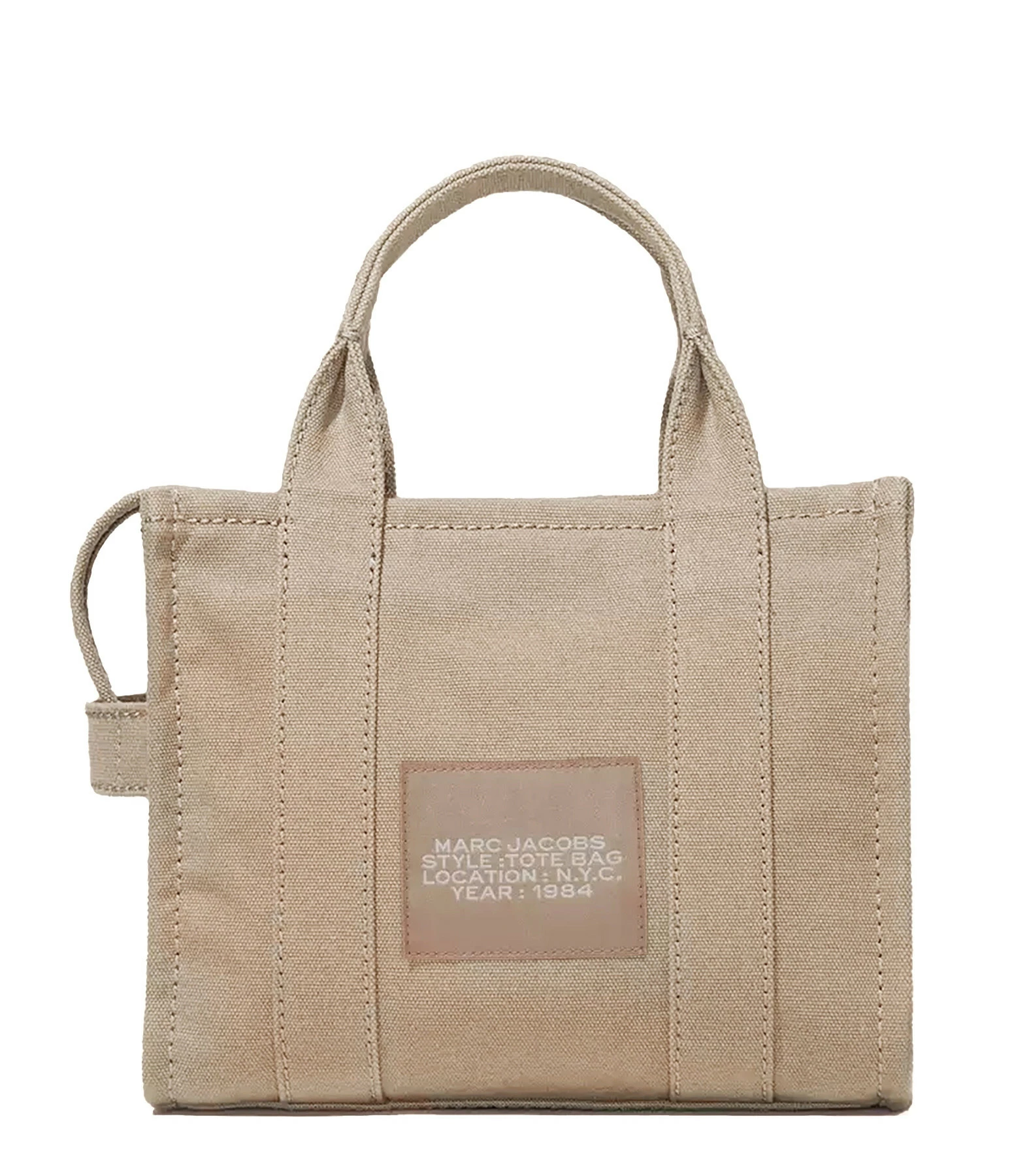 Mini sac cabas en jacquard de coton beige. Deux anses et ne bandoulière noire ajustable et amovible par mousqueton. Inscription “THE TOTE BAG MARC JACOBS” sérigraphiée en blanc et gris sur le devant. Fermeture zippée. Un patch beige foncé cousu dans le dos avec l’inscription “MARC JACOBS STYLE : THE TOTE BAG LOCATION : N.Y.C. YEAR : 1984” brodée en blanc. Une anse sur le côté. Intérieur organisé en un grand compartiment.