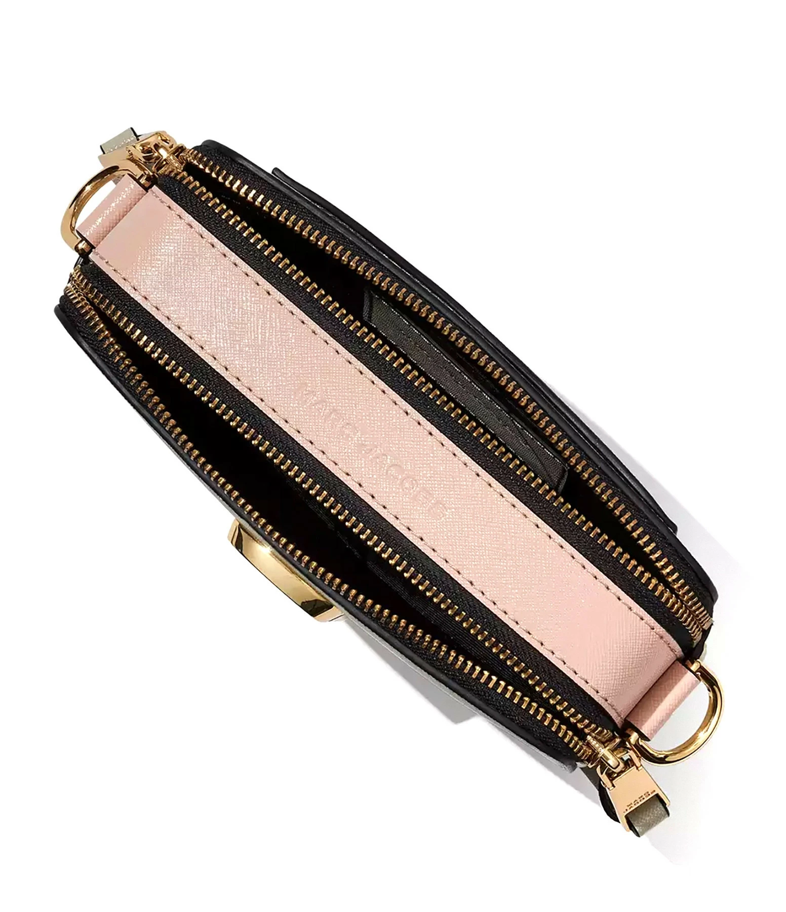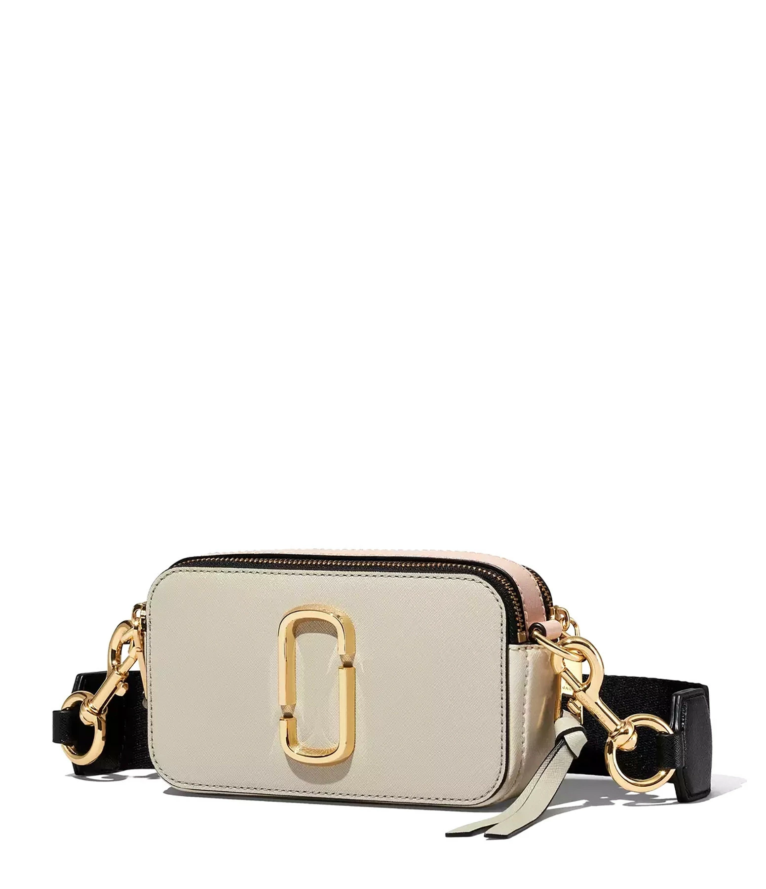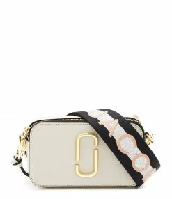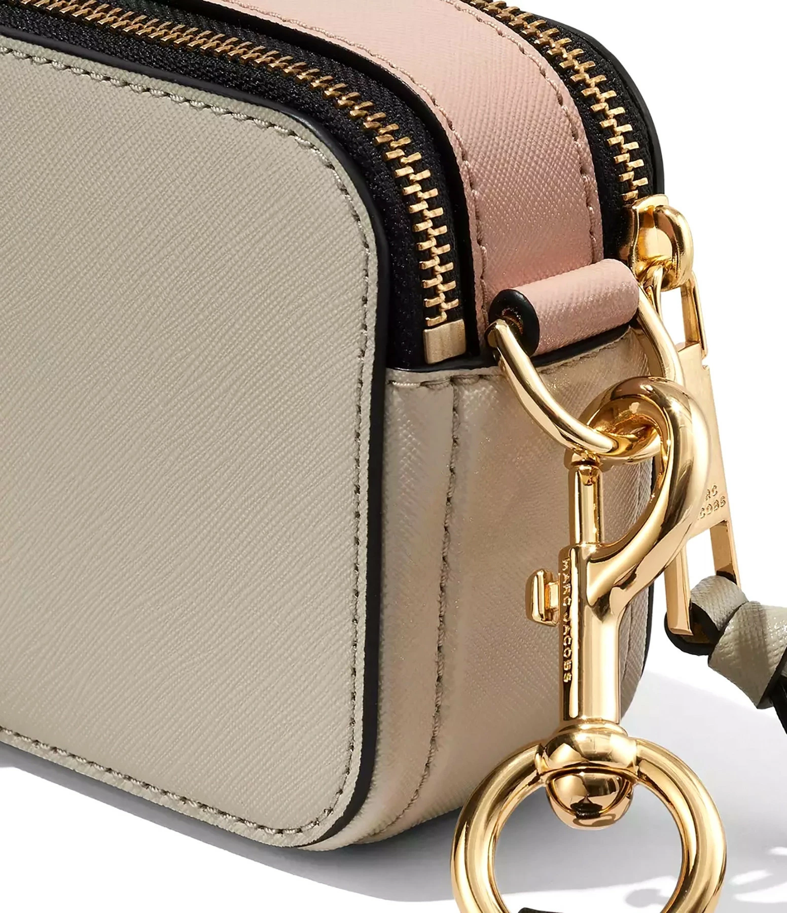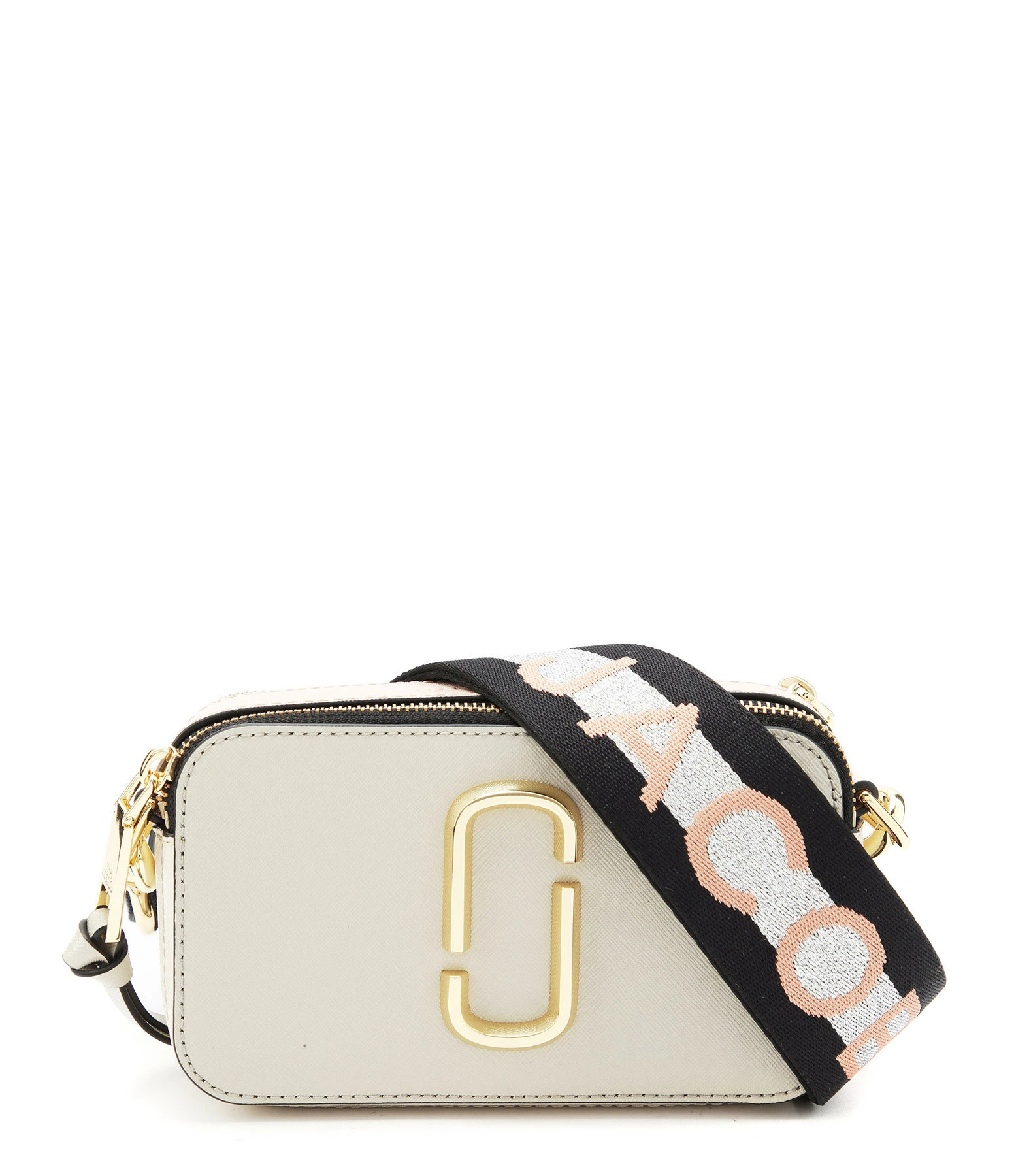Sac bandoulière en cuir Saffiano vernis gris, beige et rose. Porté épaule ou croisé. Bandoulière noire avec l’inscription “THE MARC JACOBS” tissée sur une bande argentée, ajustable et amovible par mousqueton doré. Deux compartiments zippés doré dont un contenant une poche plaquée avec un patch en cuir gris cousu dessus embossé de l’inscription ” THE SNAPSHOT MARC JACOBS”. Plaque logo métallique dorée sur le devant.