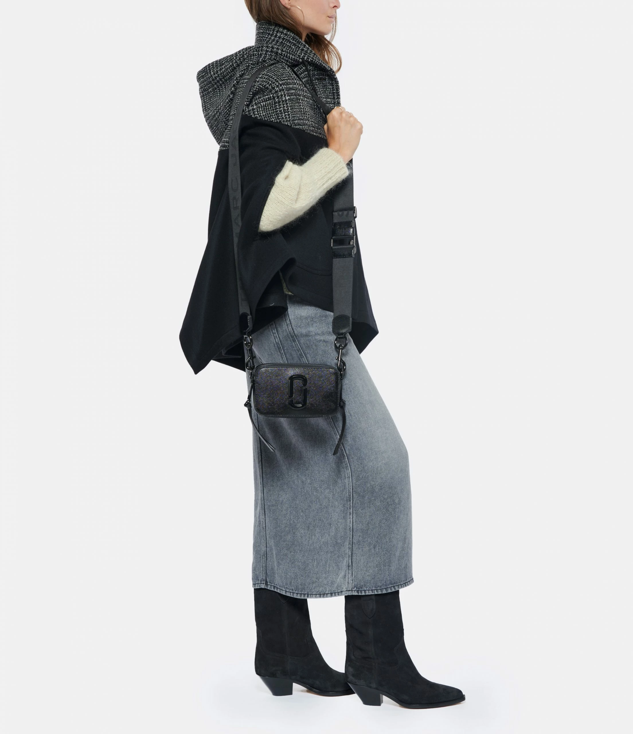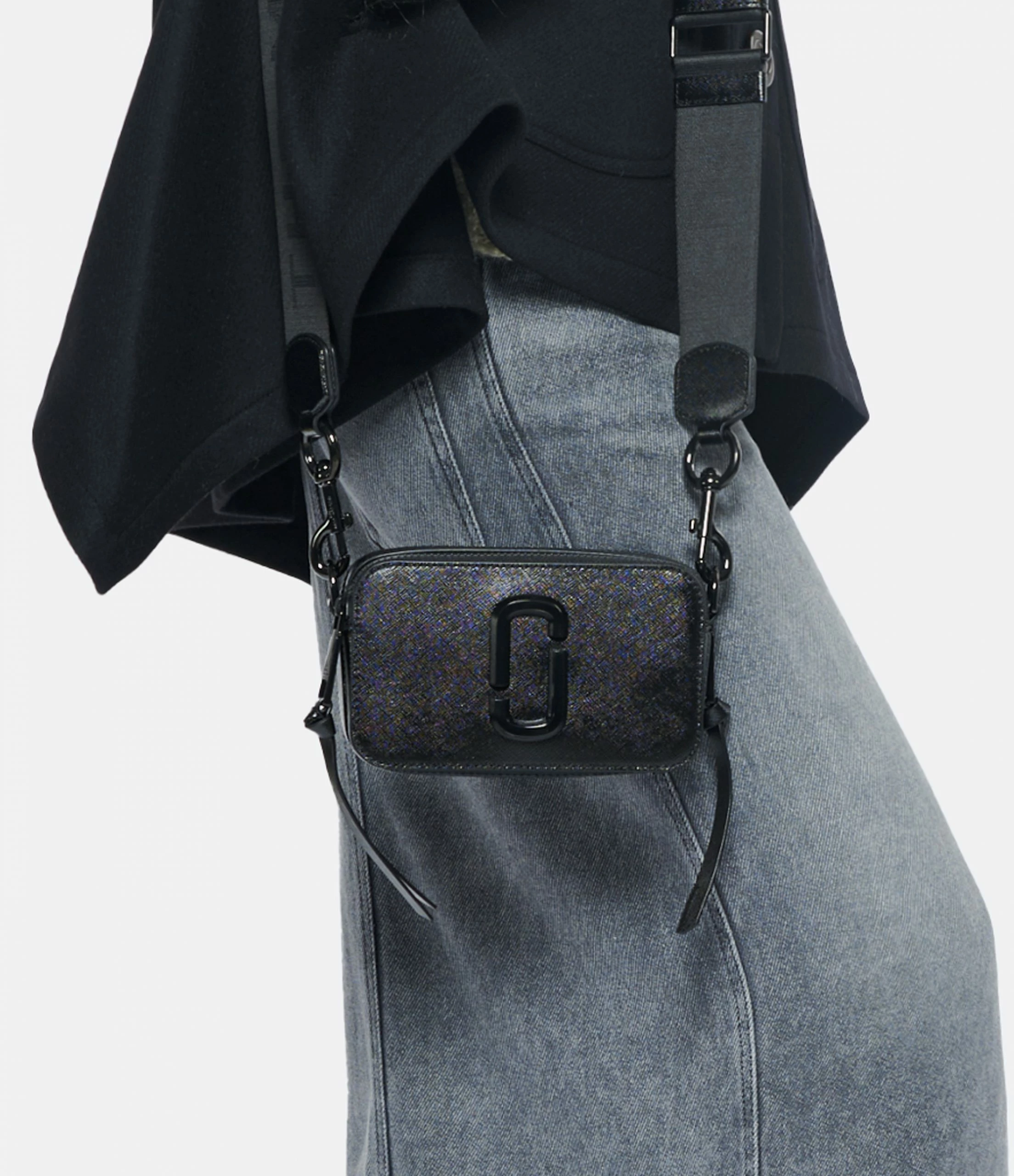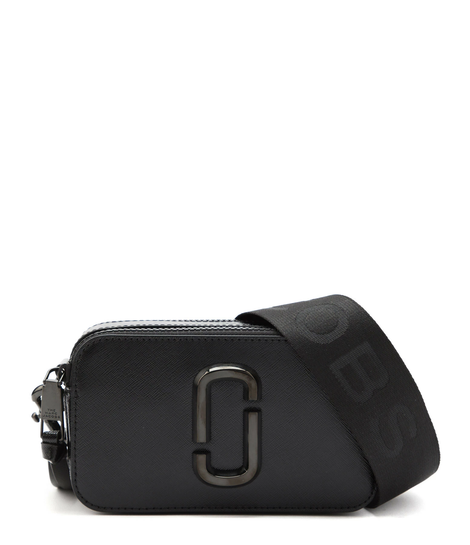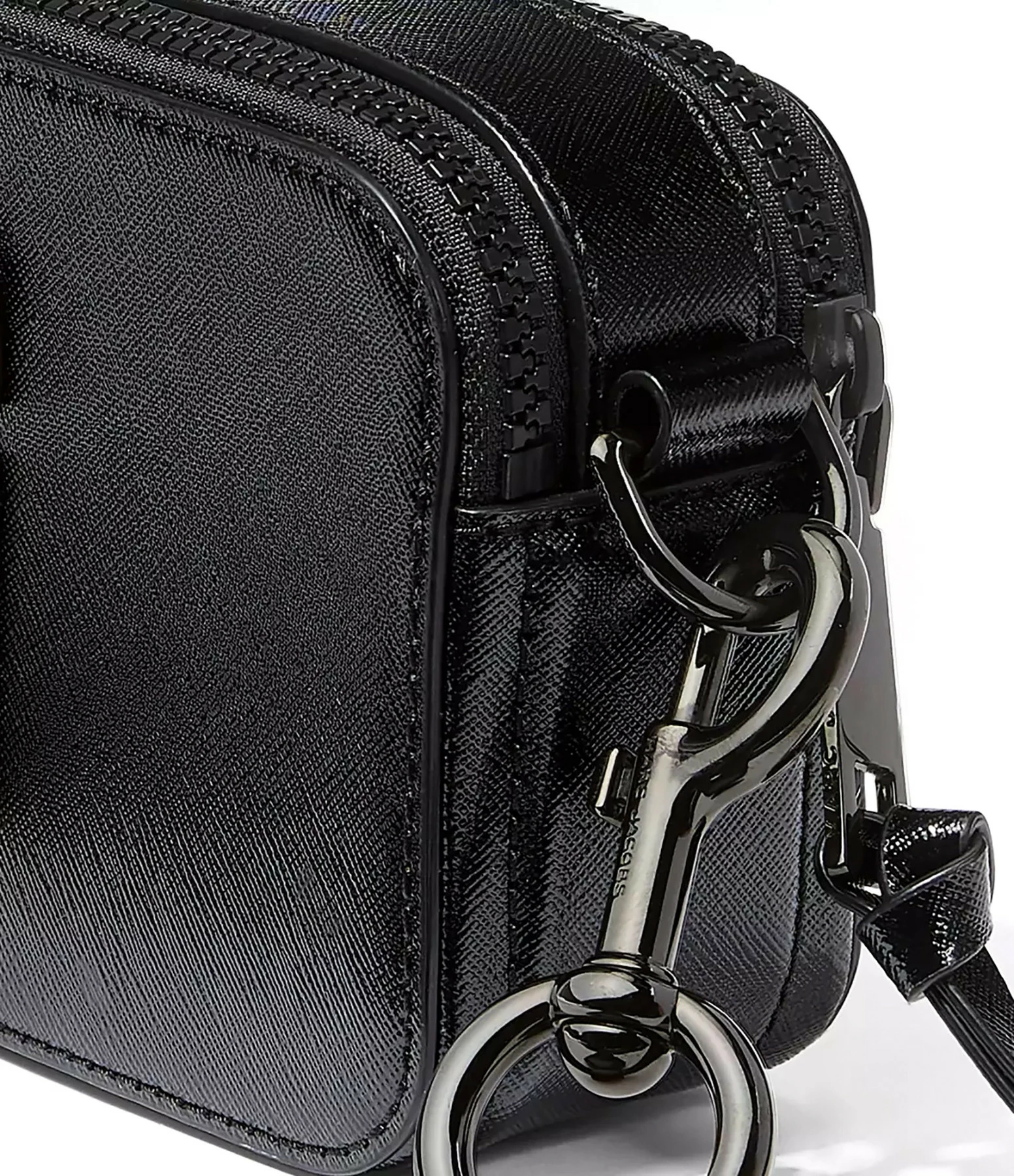 Sac bandoulière en cuir Saffiano vernis noir. Porté épaule ou croisé. Bandoulière noire avec l’inscription “THE MARC JACOBS” tissée, ajustable et amovible par mousqueton. Deux compartiments zippés dont un contenant une poche plaquée avec un patch en cuir noir cousu dessus embossé de l’inscription ” THE SNAPSHOT MARC JACOBS”. Plaque logo métallique noire sur le devant.