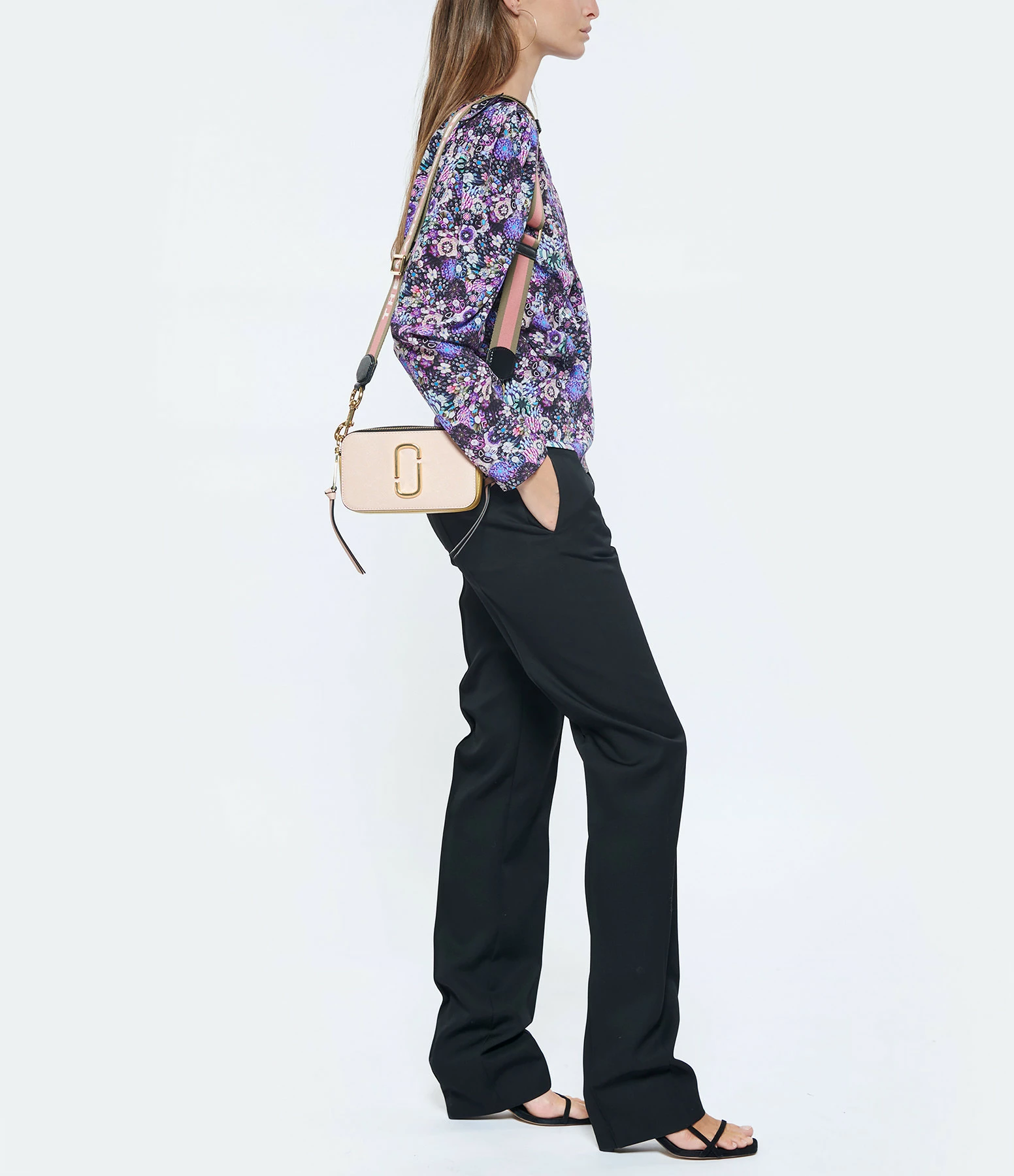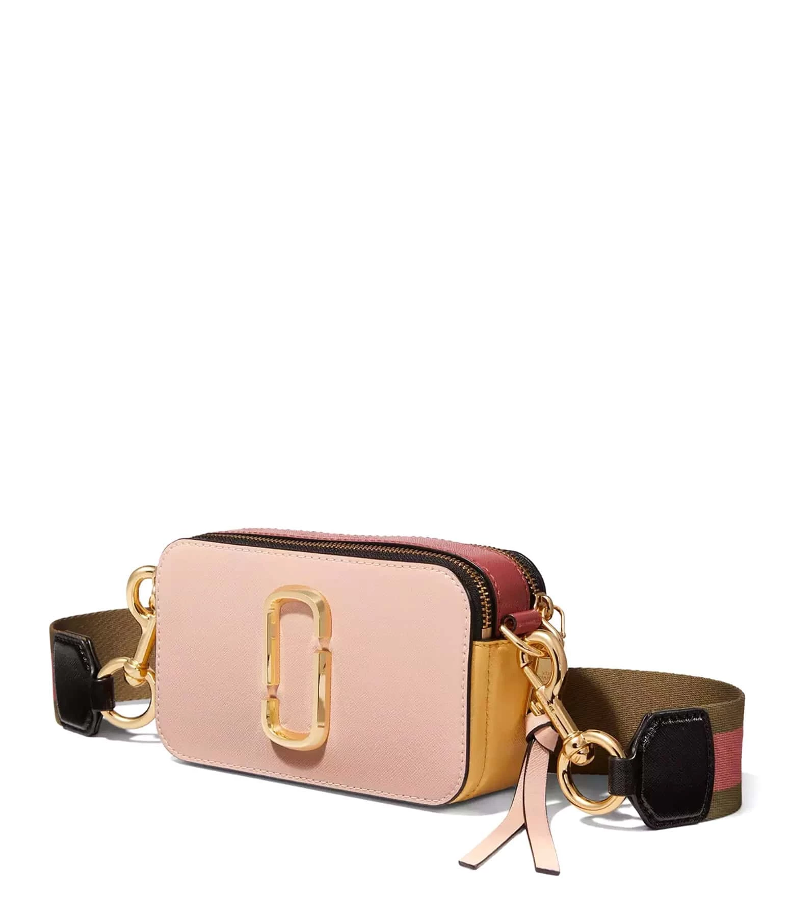 Sac bandoulière en cuir Saffiano vernis rose, jaune et fuchsia. Porté épaule ou croisé. Bandoulière verte avec l’inscription “THE MARC JACOBS” tissée en rose sur une bande fuchsia, ajustable et amovible par mousqueton doré. Deux compartiments zippés doré dont un contenant une poche plaquée avec un patch en cuir rose cousu dessus embossé de l’inscription ” THE SNAPSHOT MARC JACOBS”. Plaque logo métallique dorée sur le devant.
