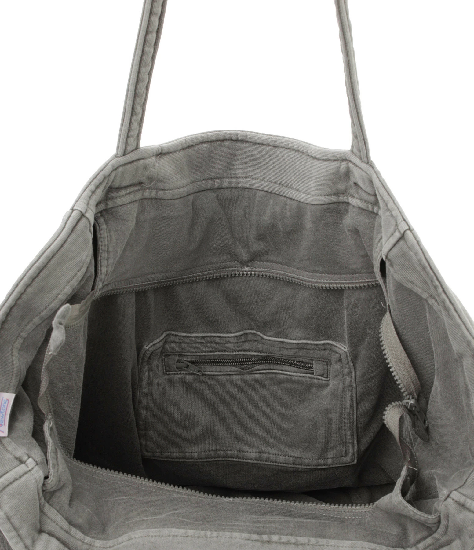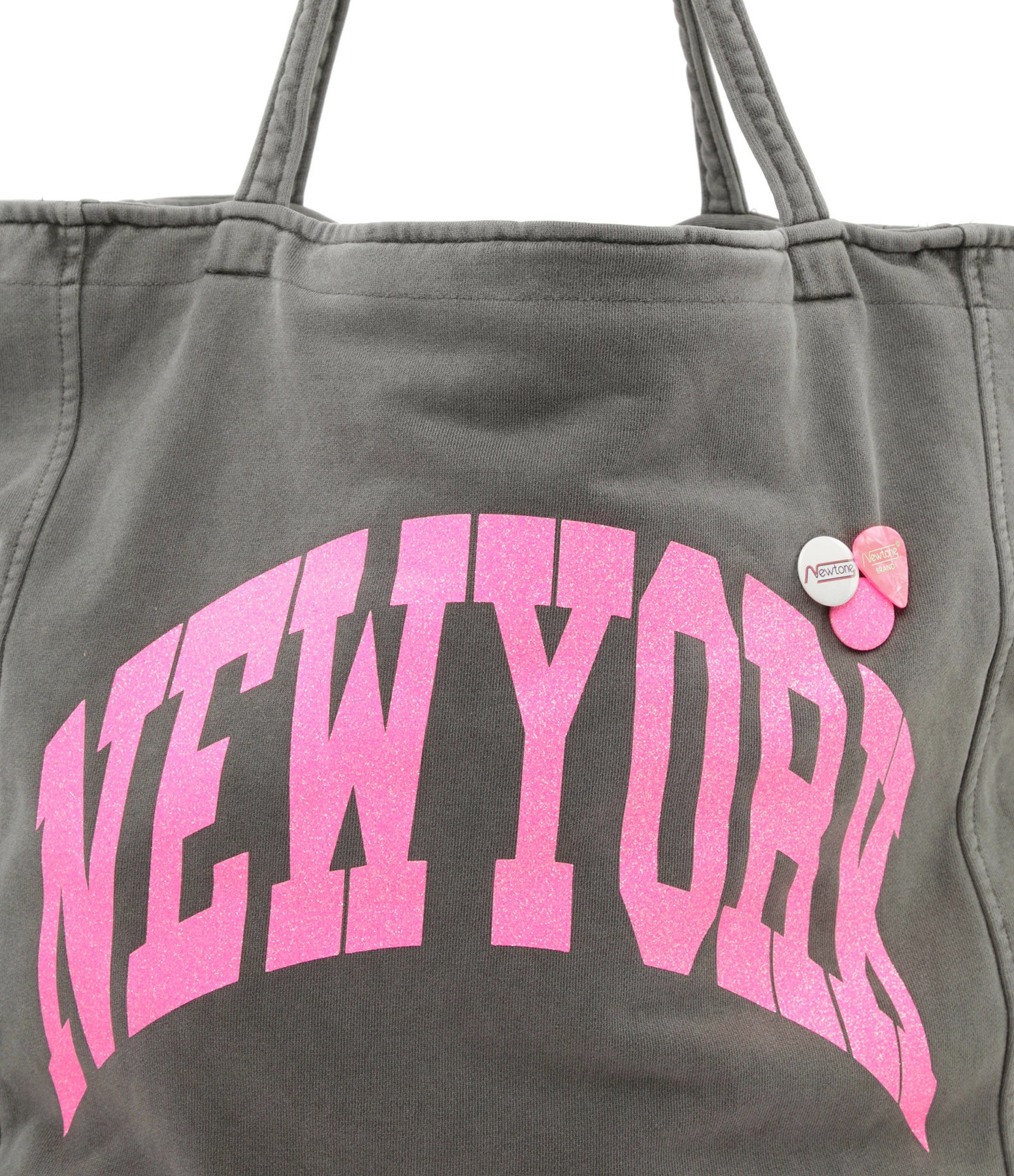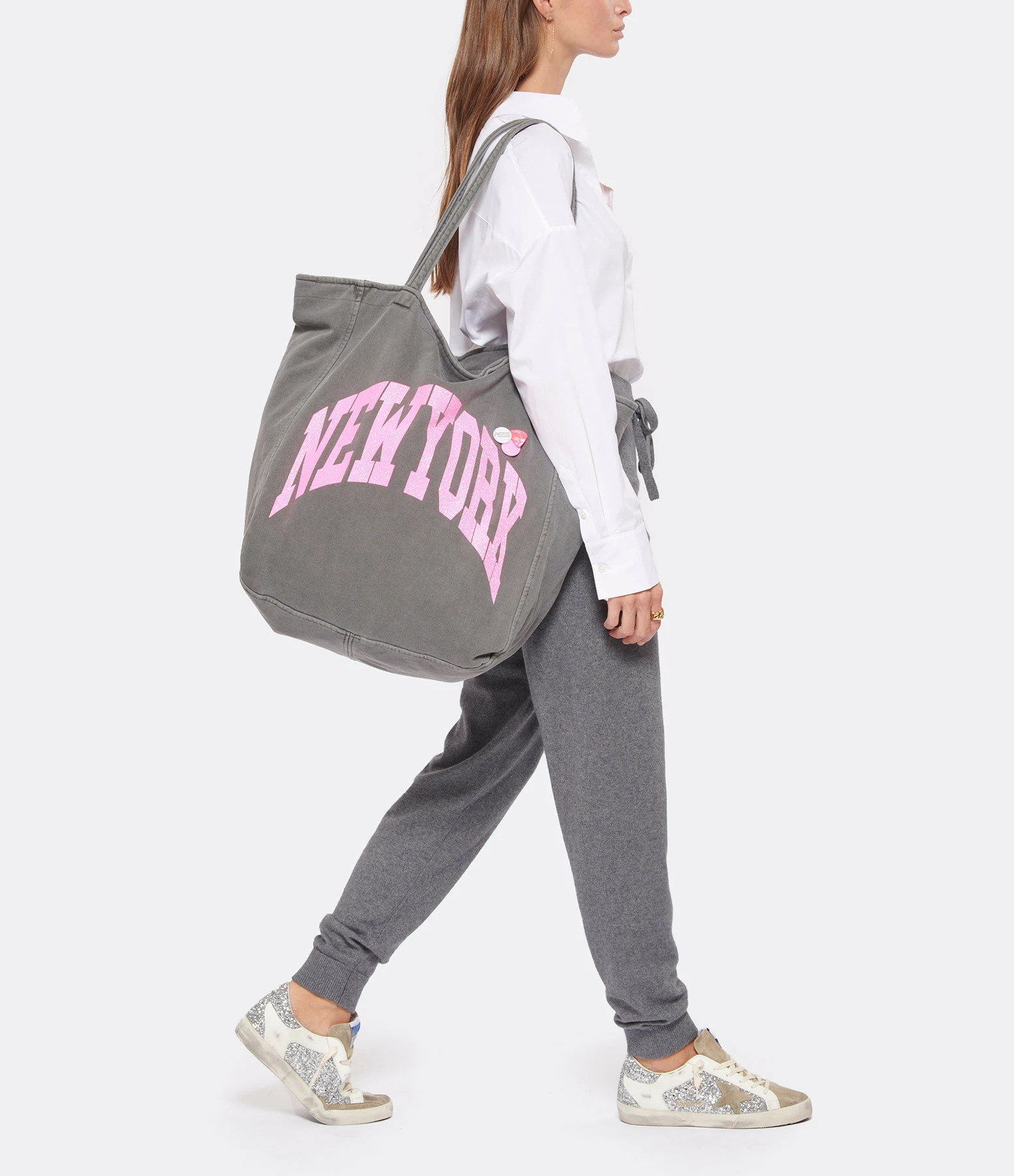 Sac cabas en coton gris orné d’une inscription “New York” flockée en rose pailleté ainsi que deux badges et un médiator. Deux anses pour porté main ou épaule. Fermeture zippée. Intérieur organisé en un grand compartiment avec une poche zippée, une poche plaquée ainsi qu’un lien porte-clé à mousqueton.