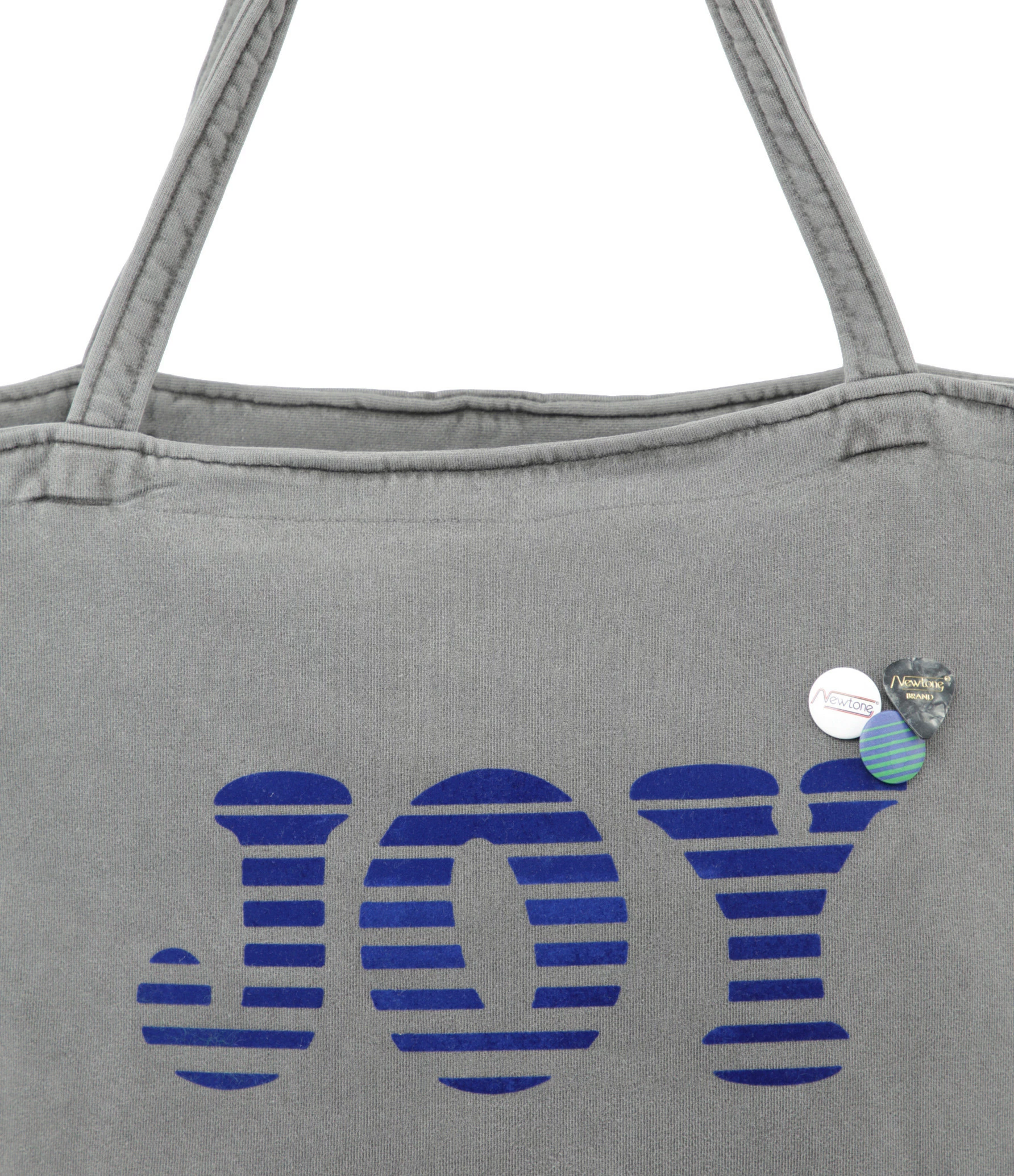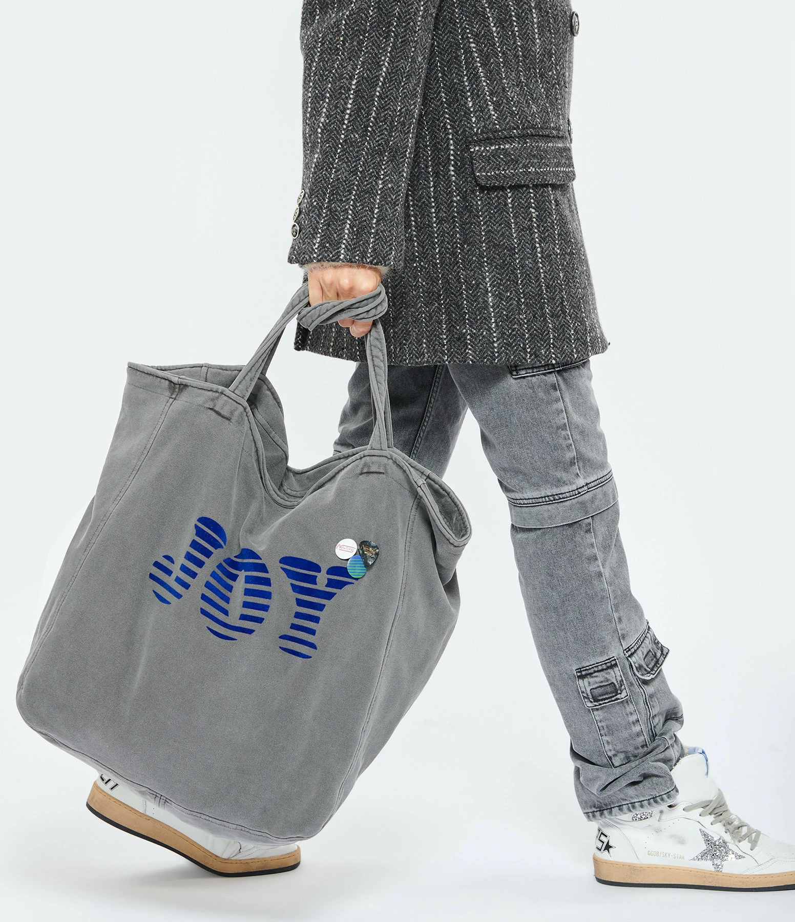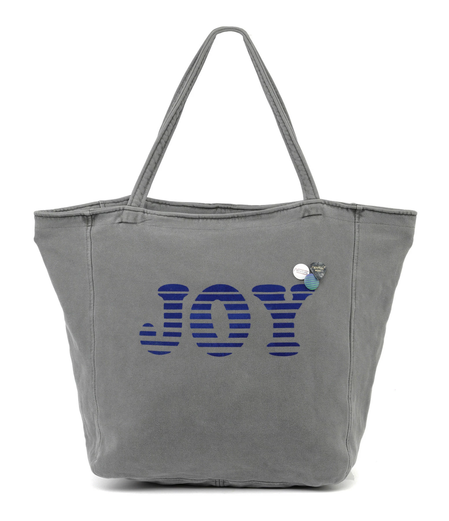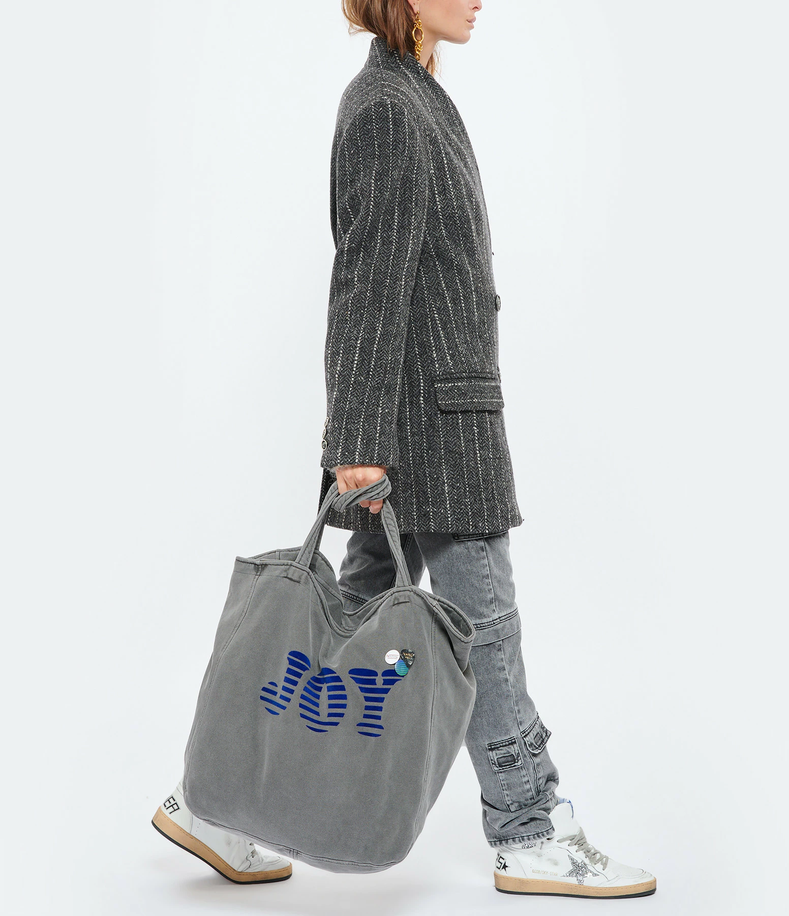 Sac cabas en coton gris orné d’une inscription “Joy” flockée velours en bleu ainsi que deux badges et un médiator. Deux anses pour porté main ou épaule. Fermeture zippée. Intérieur organisé en un grand compartiment avec une poche zippée, une poche plaquée ainsi qu’un lien porte-clé à mousqueton.