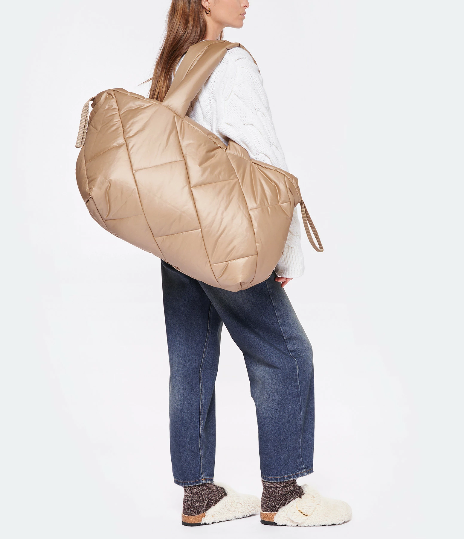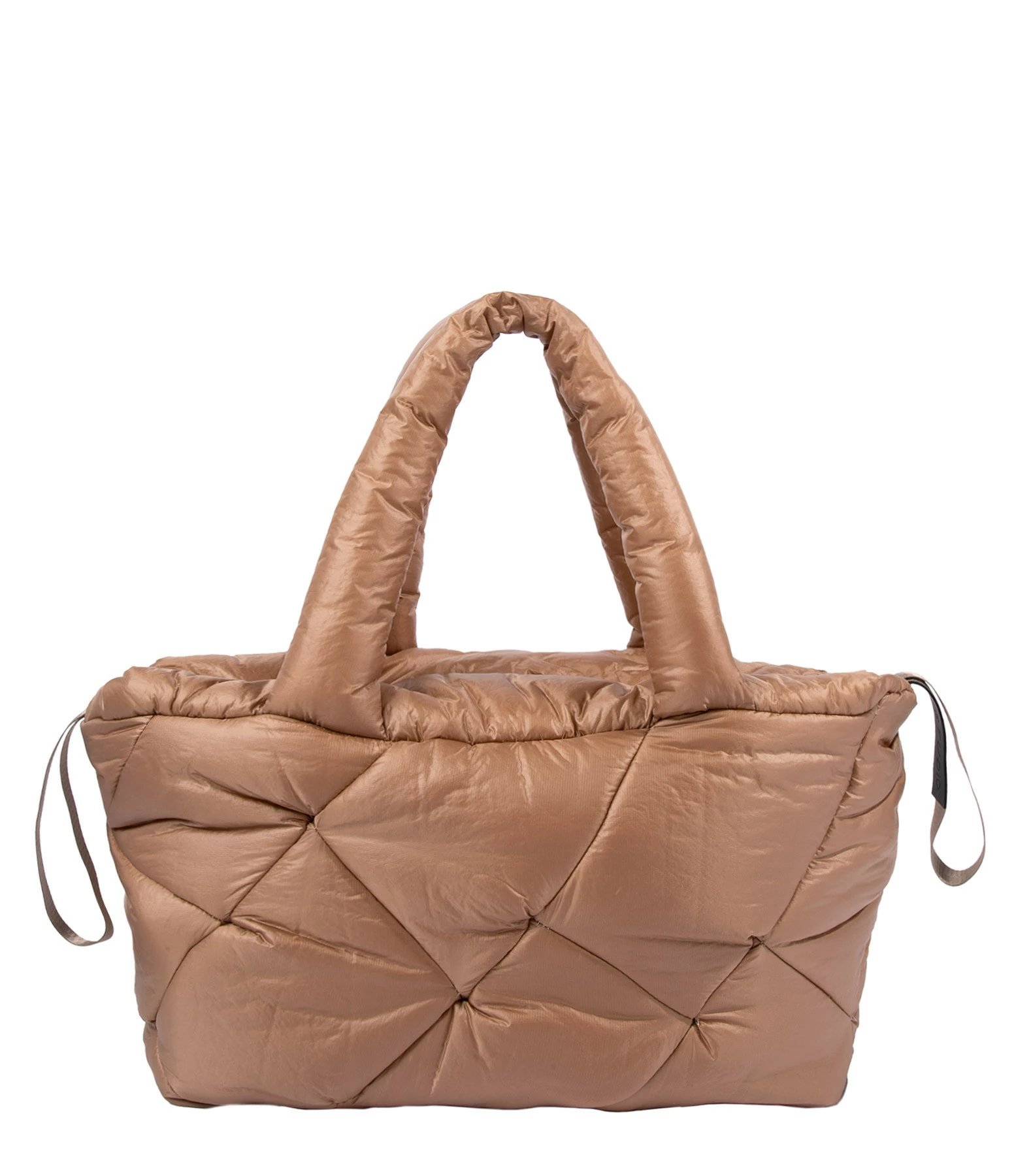 Grand sac cabas matelassé camel. Deux grandes anses. Fermeture zippée sur le dessus. Intérieur doublé organisé en un grand compartiment avec une poche zippée. Deux bandes latérales pour un ajustement différent. Une pince amovible en caoutchouc pour maintenir les deux anses ensemble.