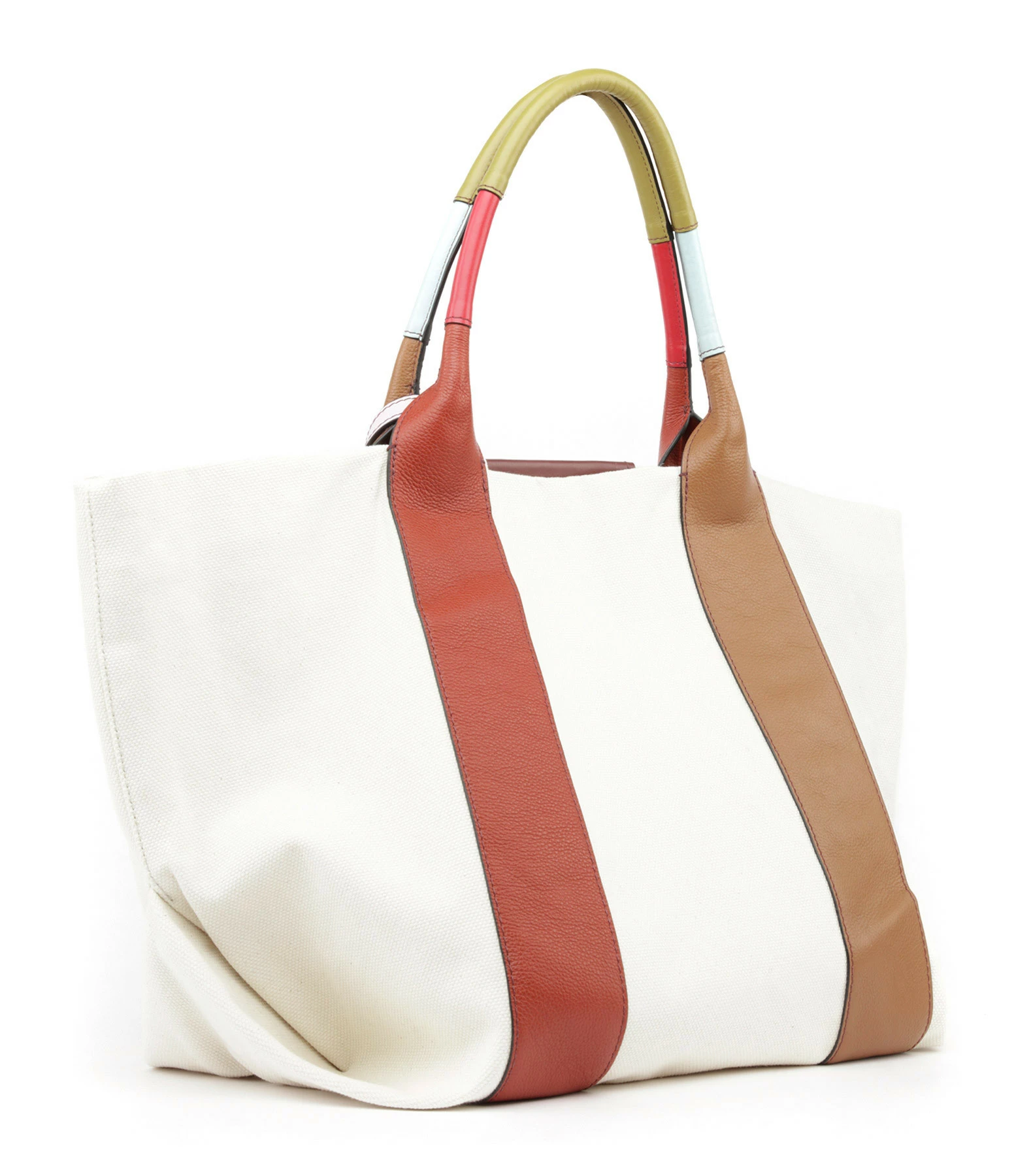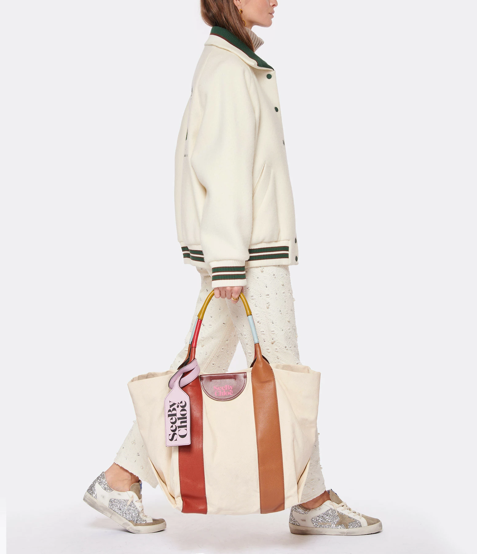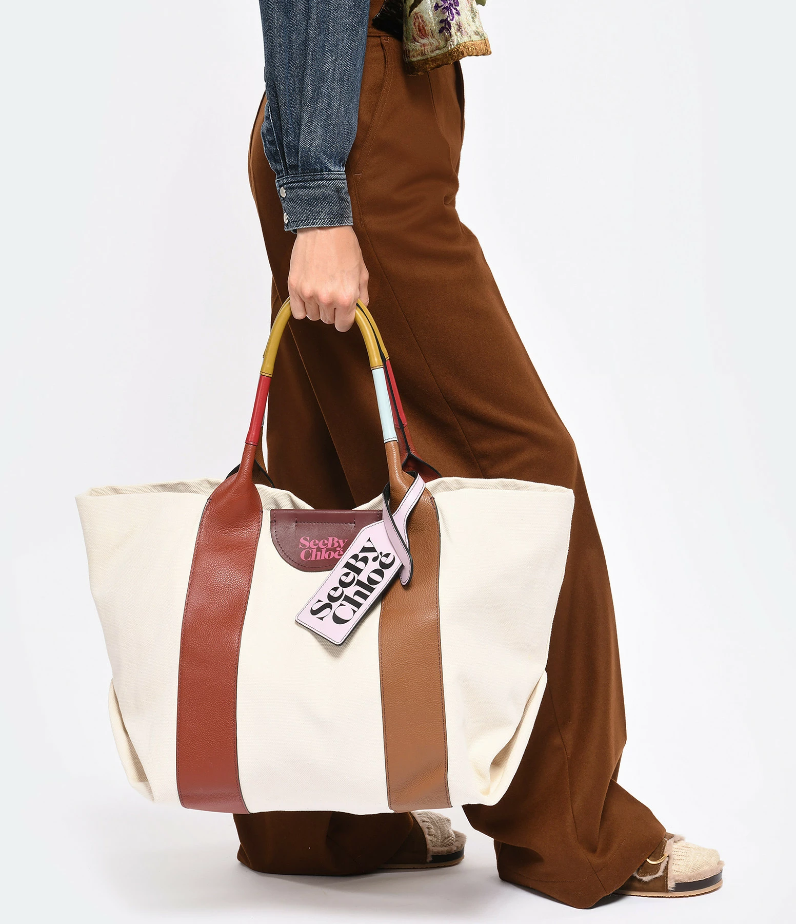 Sac cabas avec deux anses en cuir tricolore. Détail étiquette sérigraphiée “See by Chloé”. Bandoulière en cuir rouge te bleu amovible. Une poche plaquée. Fermoir pression magnétique.