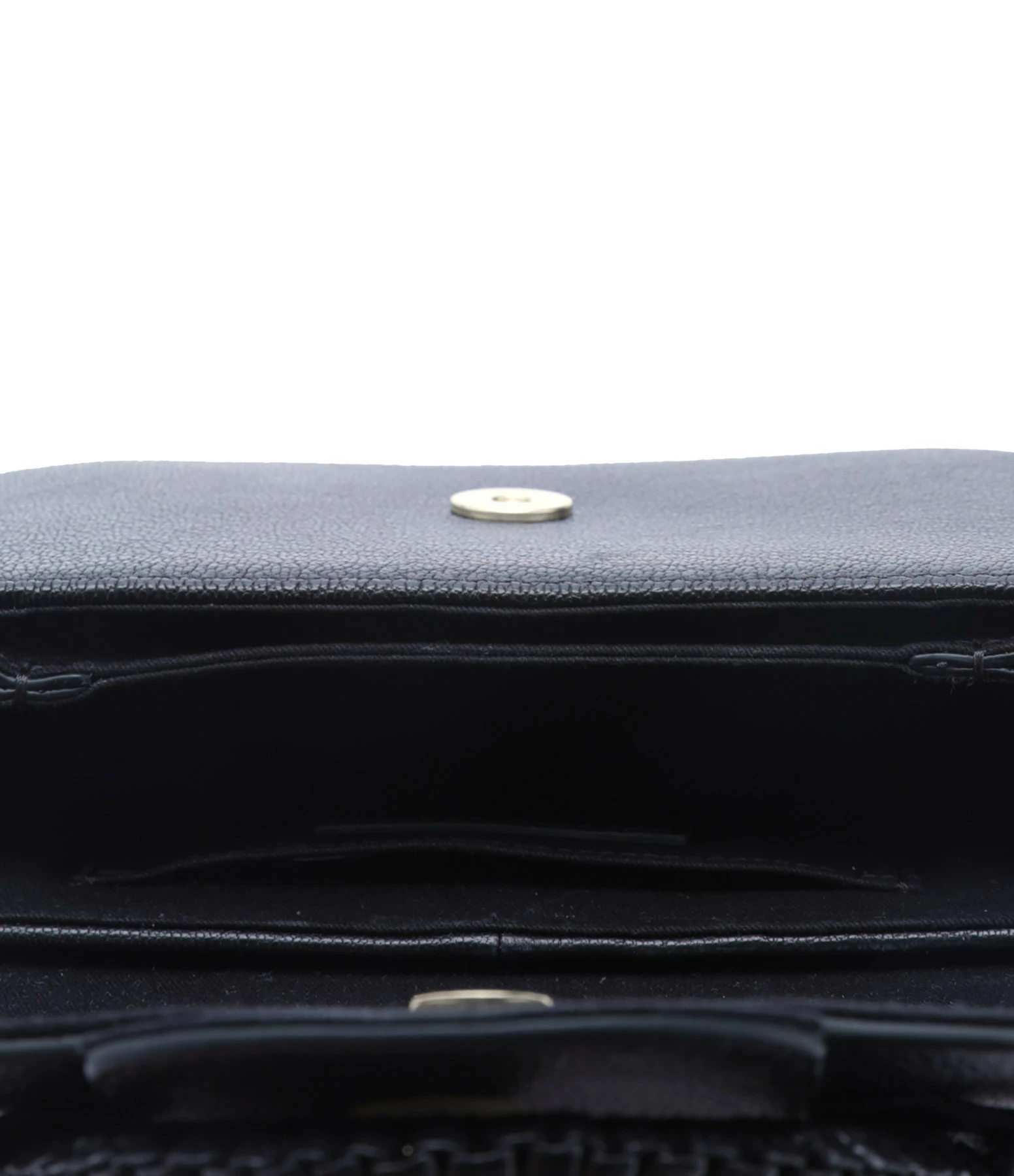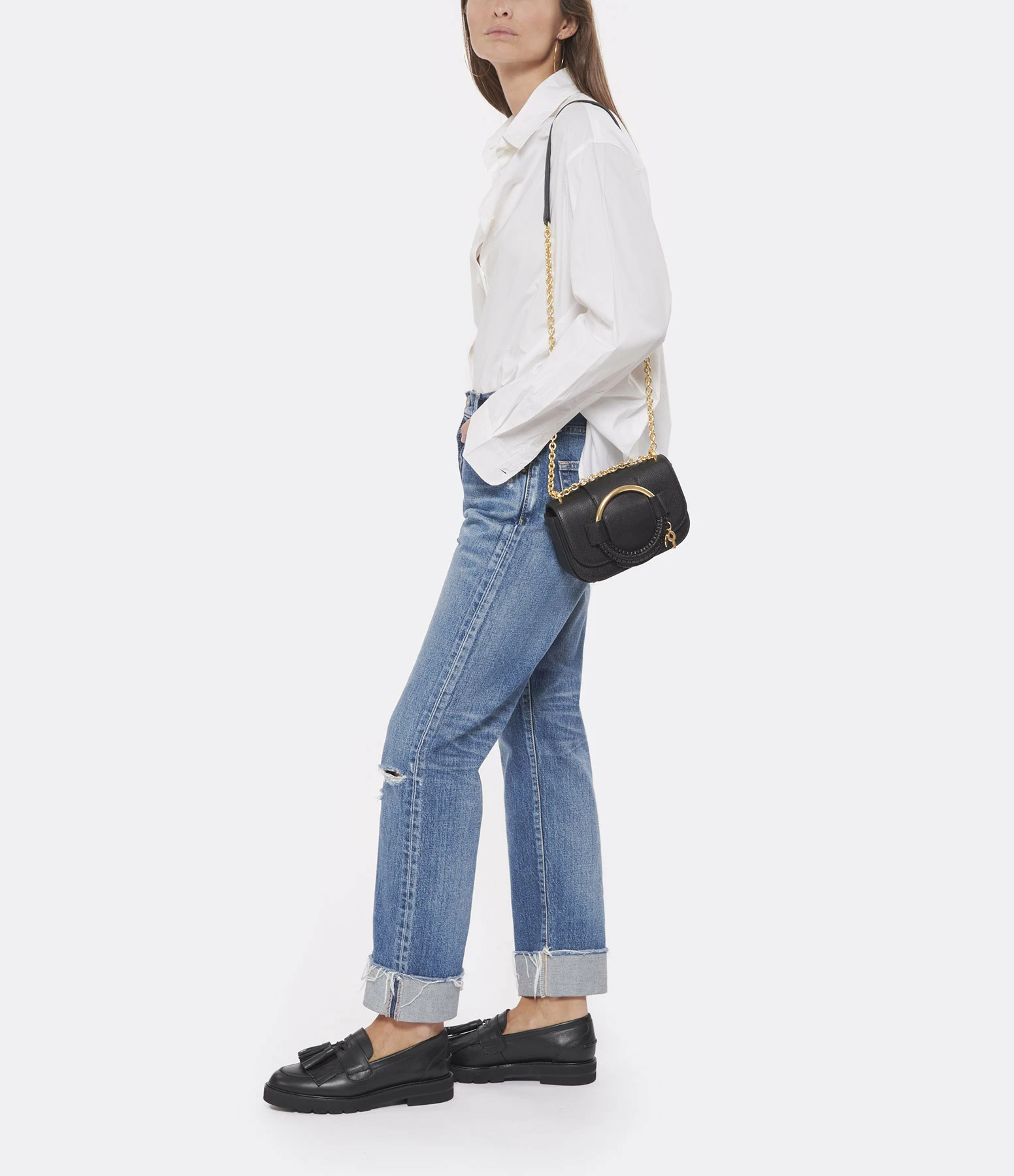 Sac en cuir grainé noir. Porté épaule ou à la main. Fermeture par rabat aimanté. Anneau en laiton doré avec détail tressé en cuir noir autour, orné d’une clé et d’un médaillon doré gravé de l’inscription “SEE BY CHLOE”. Empiècement en cuir lisse marron cousu sur le rabat, sous l’anneau. Bandoulière en cuir kaki et chaîne métallique dorée. Intérieur doublé en coton beige organisé en deux compartiments avec une poche plaquée. Patch en cuir rouge avec inscription “SEE BY CHLOE” gravée, cousu sur la poche plaquée.