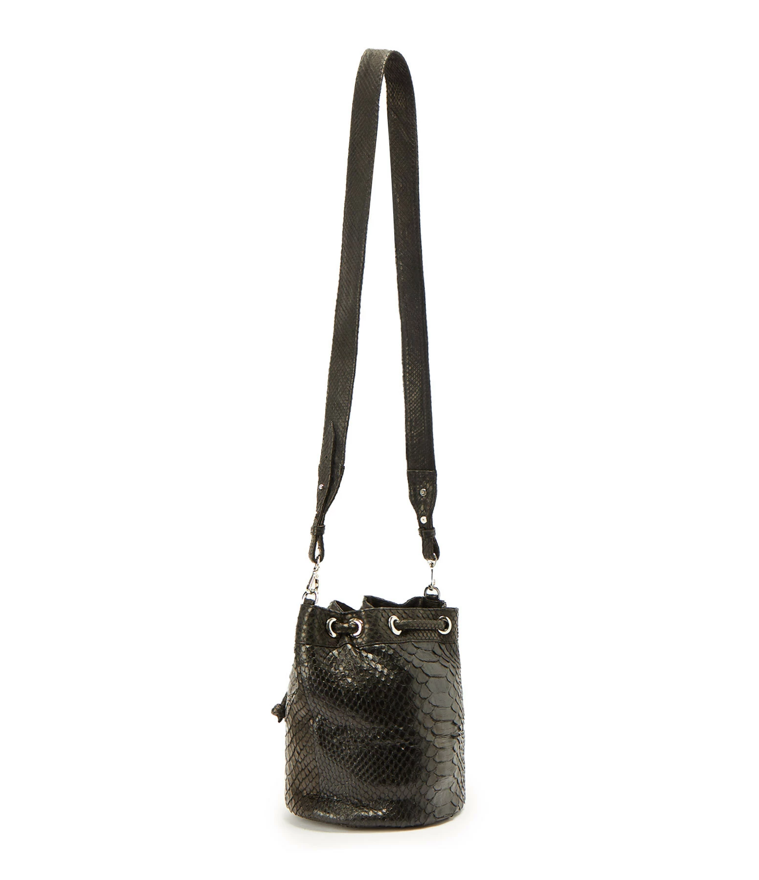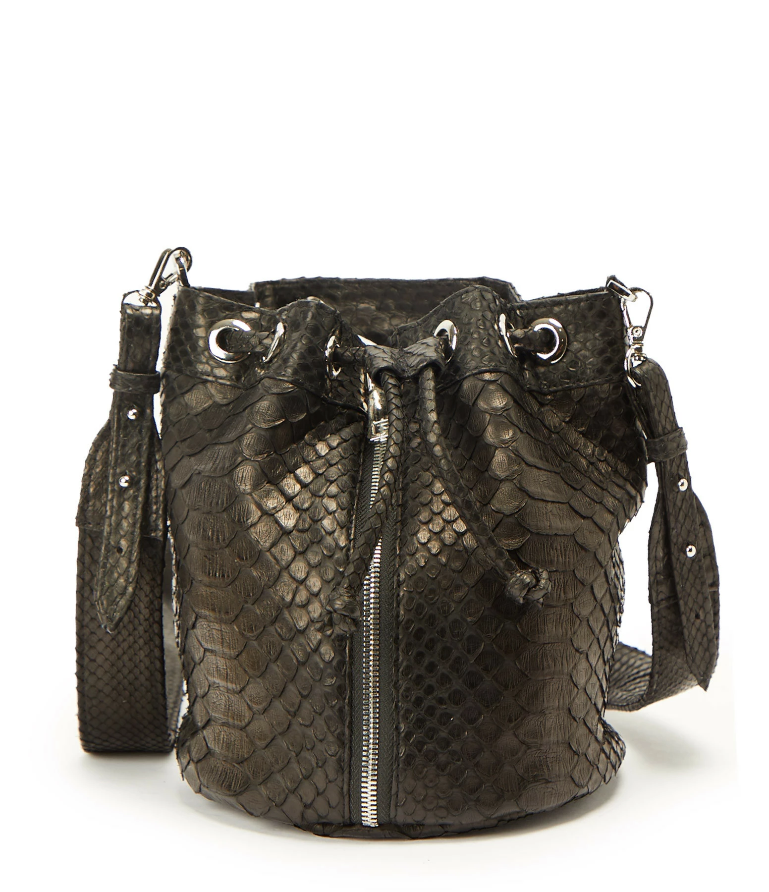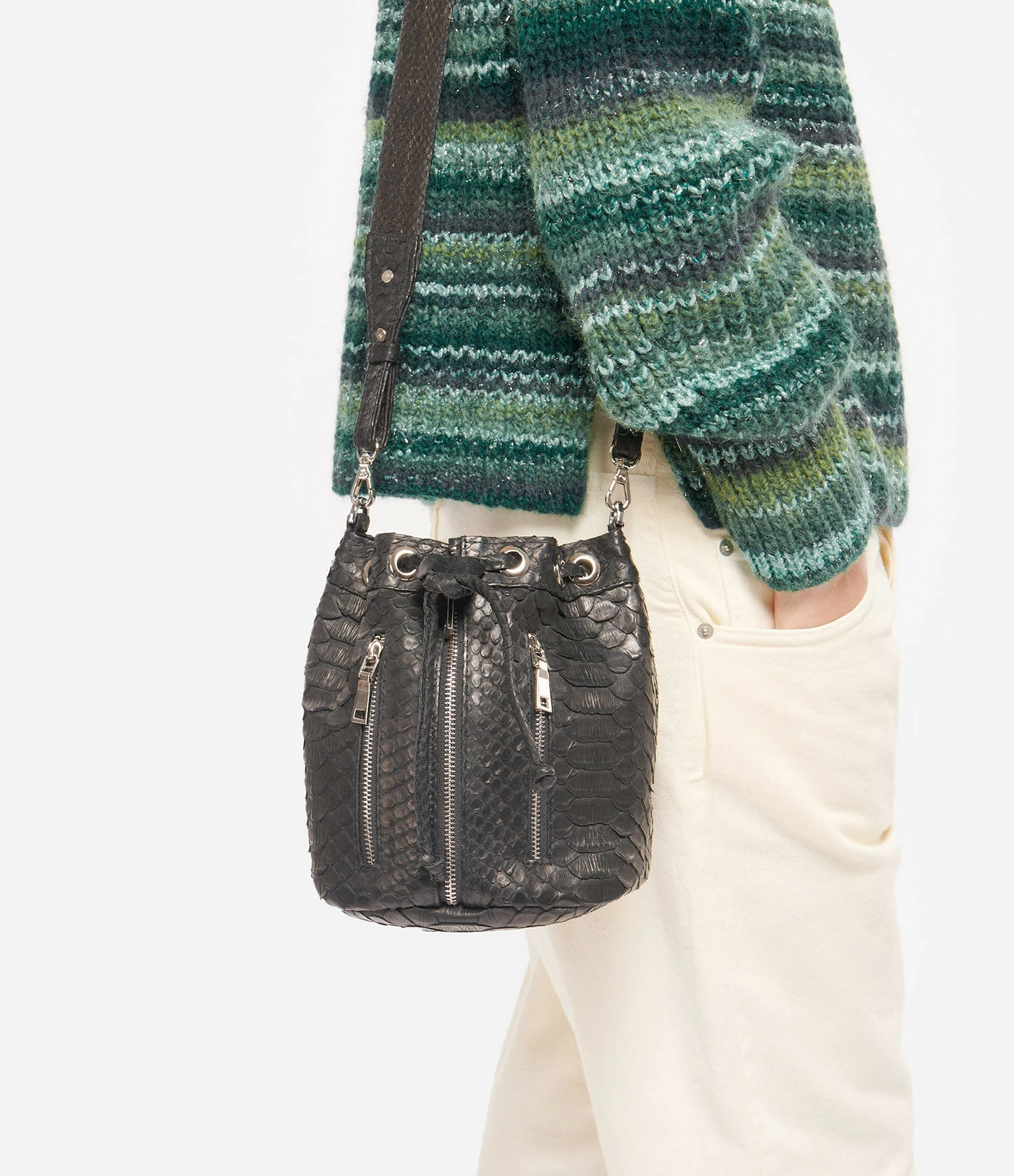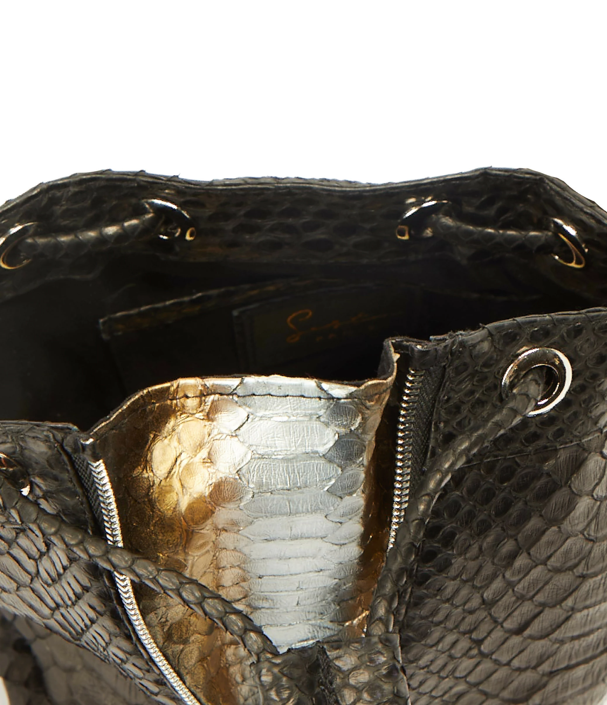 Sac bourse en python noir. Un soufflet zippé en python coloré. Fermeture par liens de serrage. Bandoulière ajustable et amovible en python. Intérieur doublé en coton avec une poche plaquée à l’intérieur.