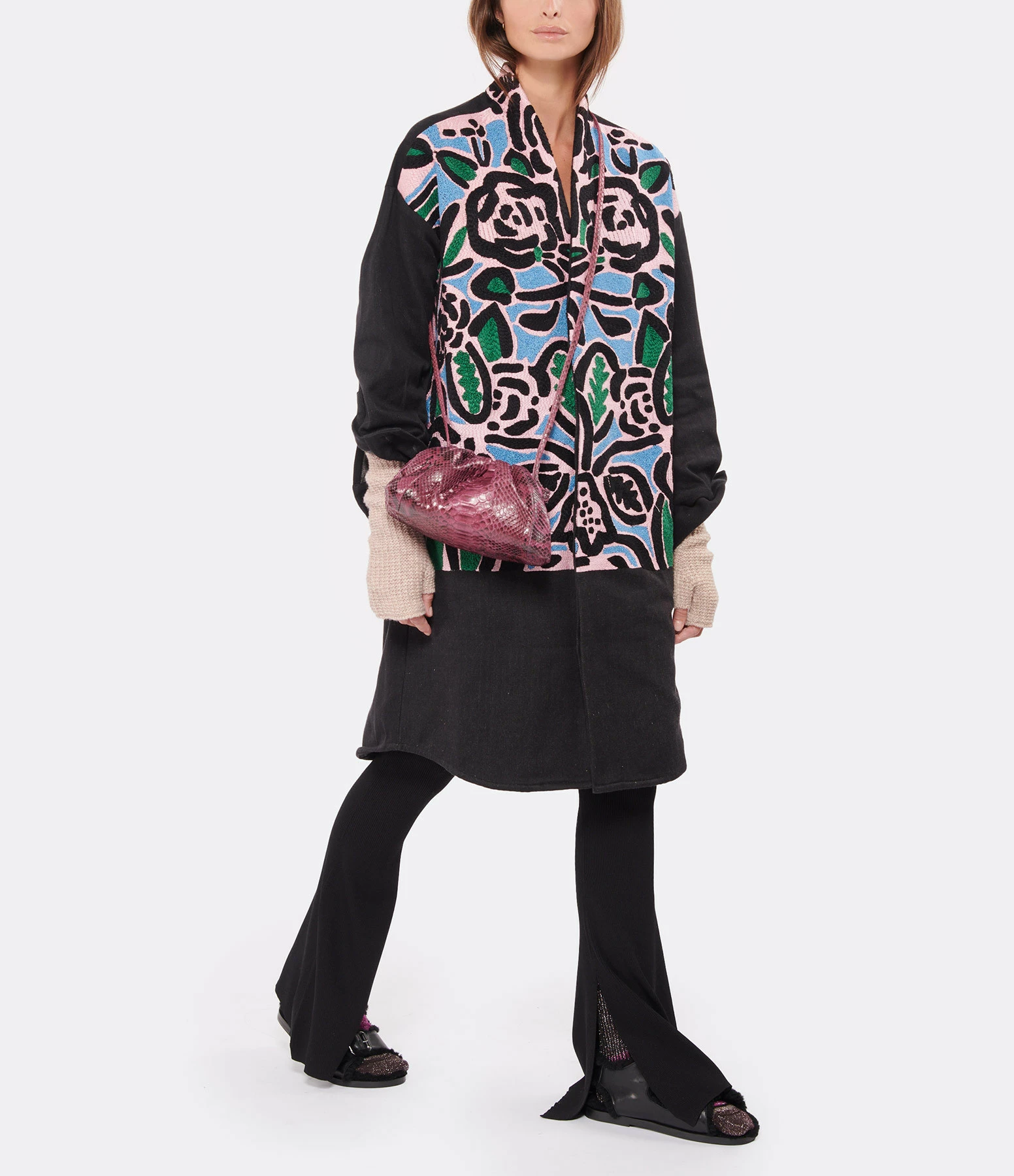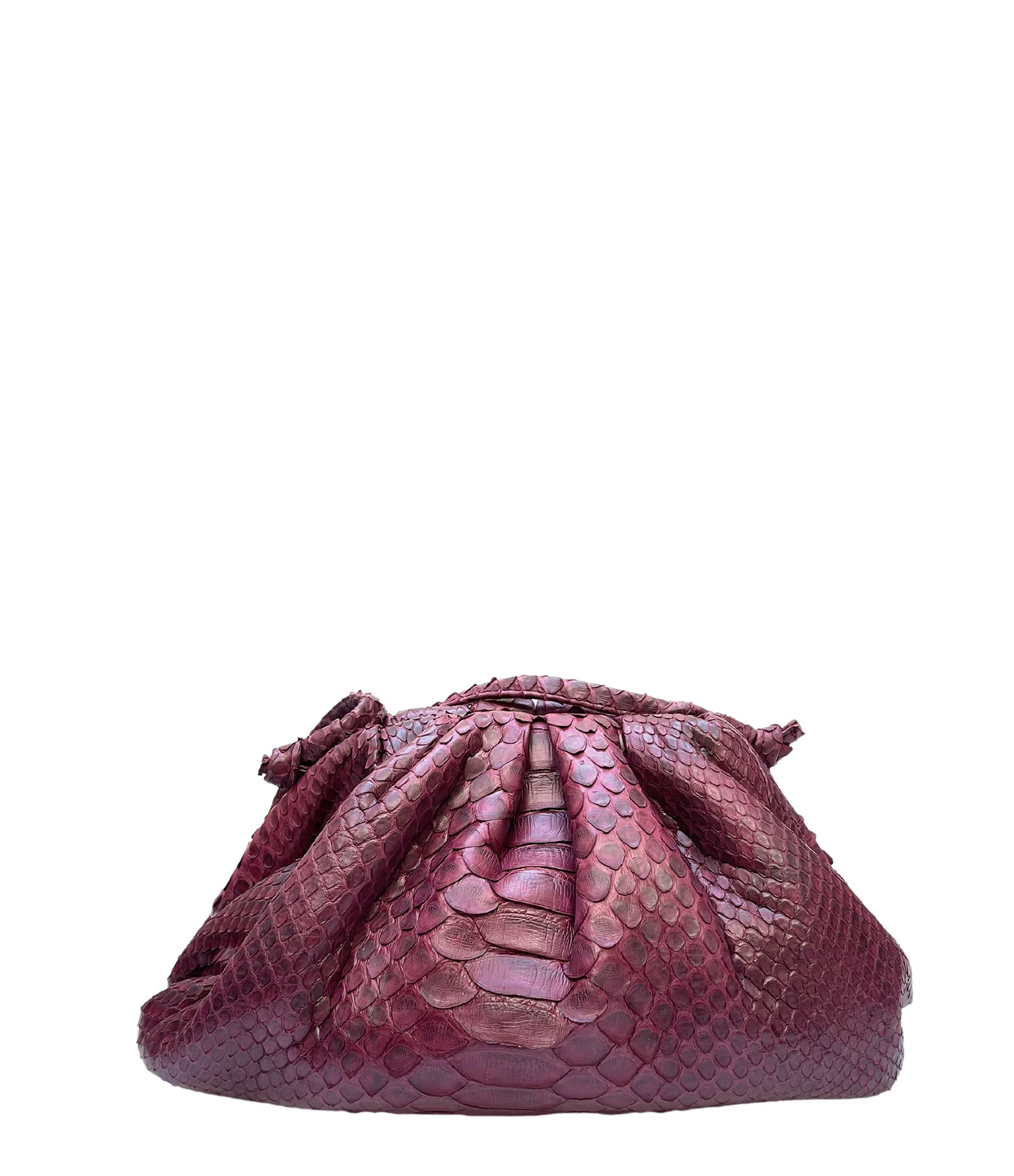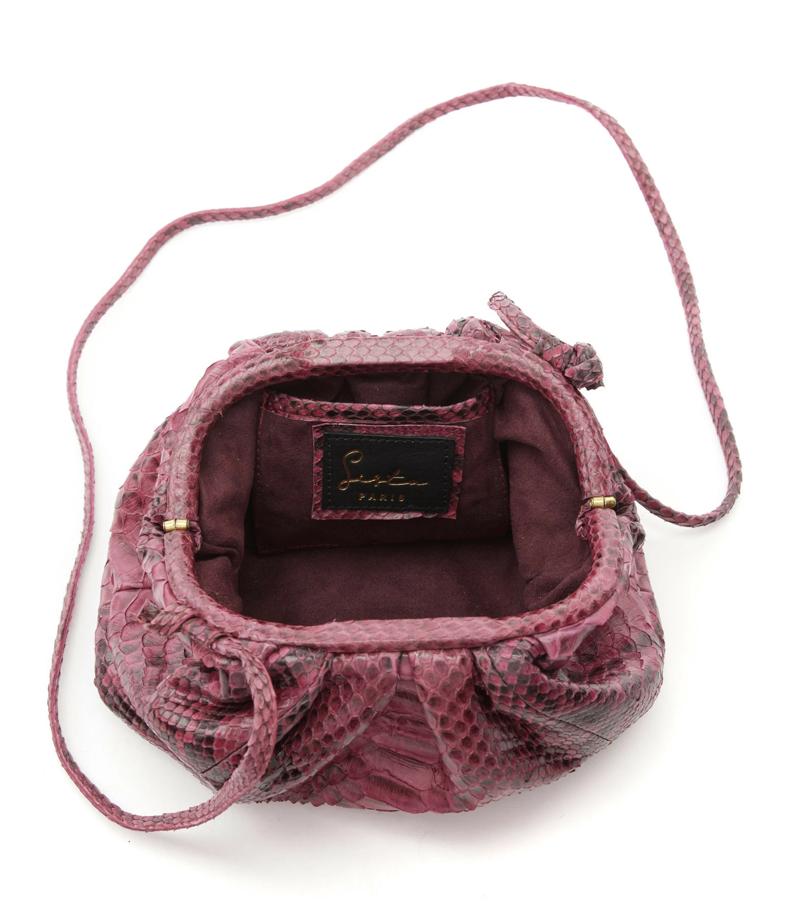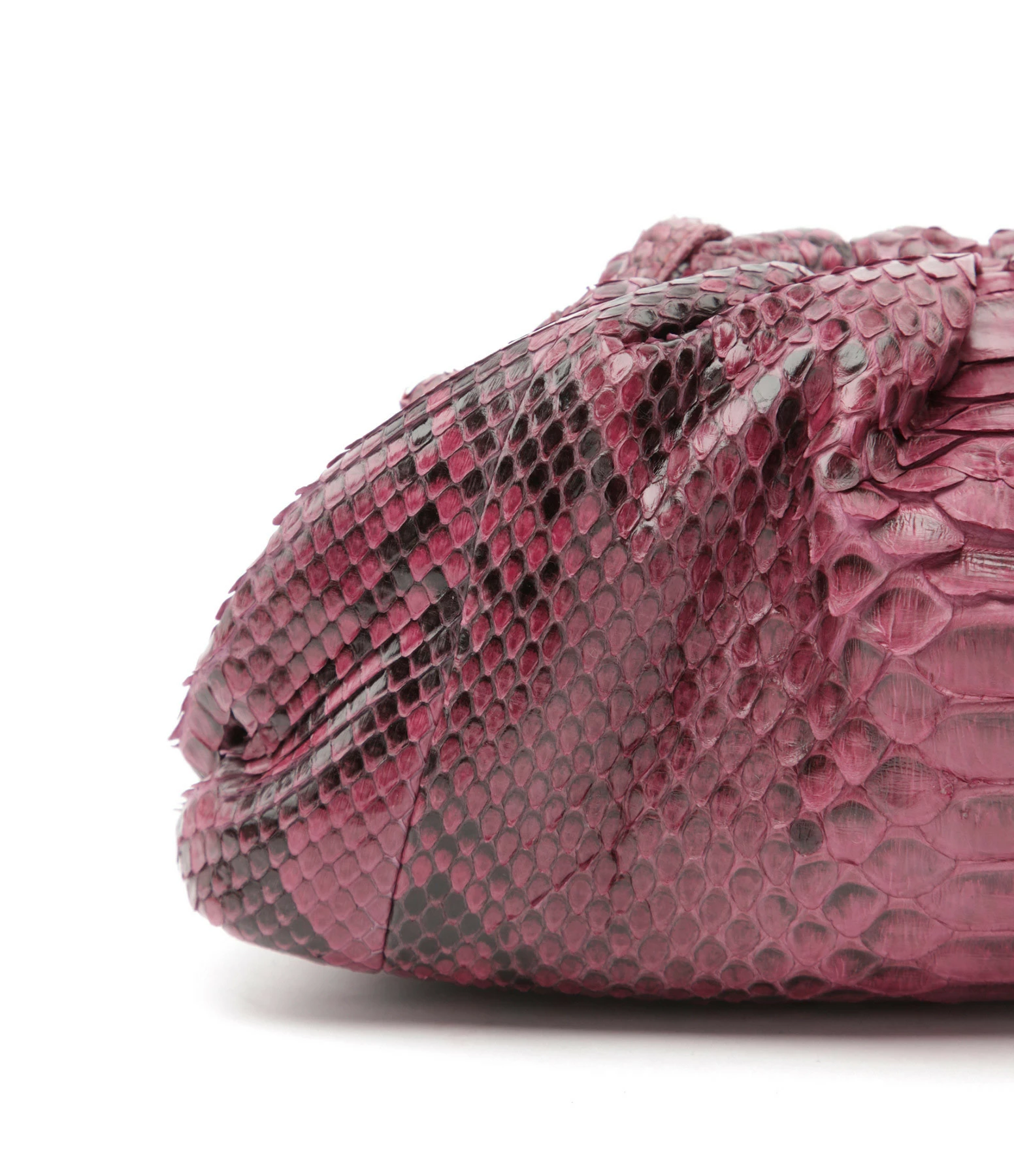 Sac bandoulière souple en python rose et noir. Une poche plaquée à l’intérieur. Fermeture par aimant.