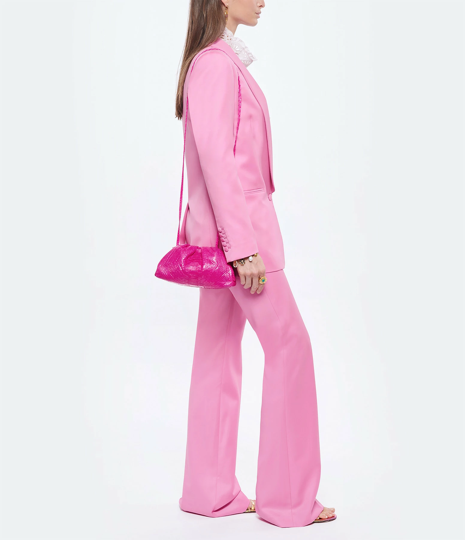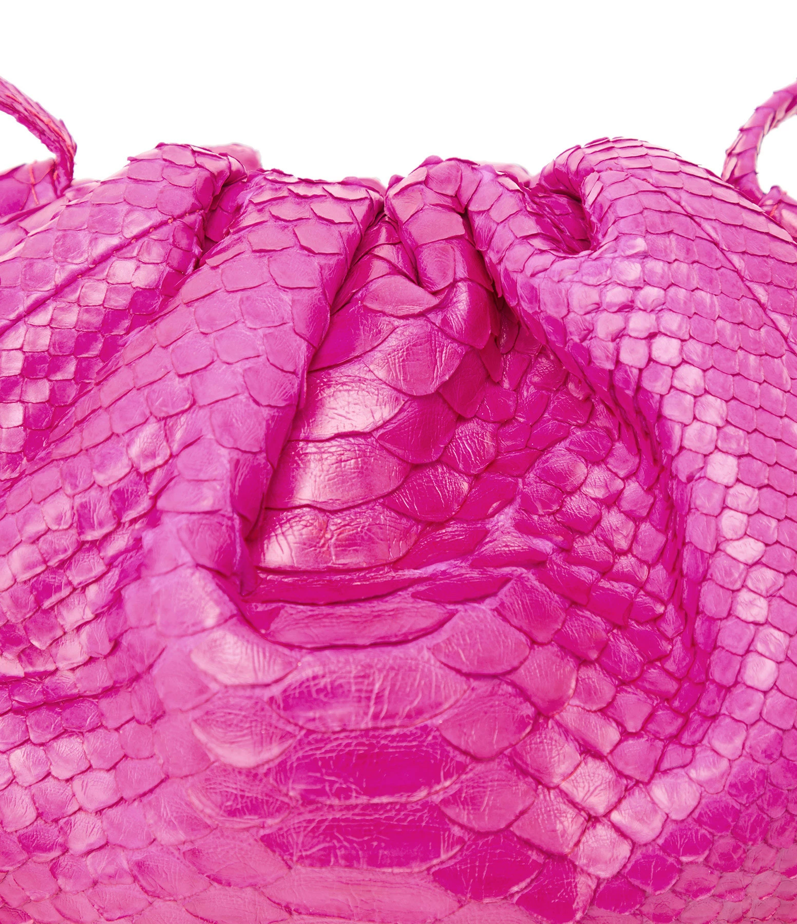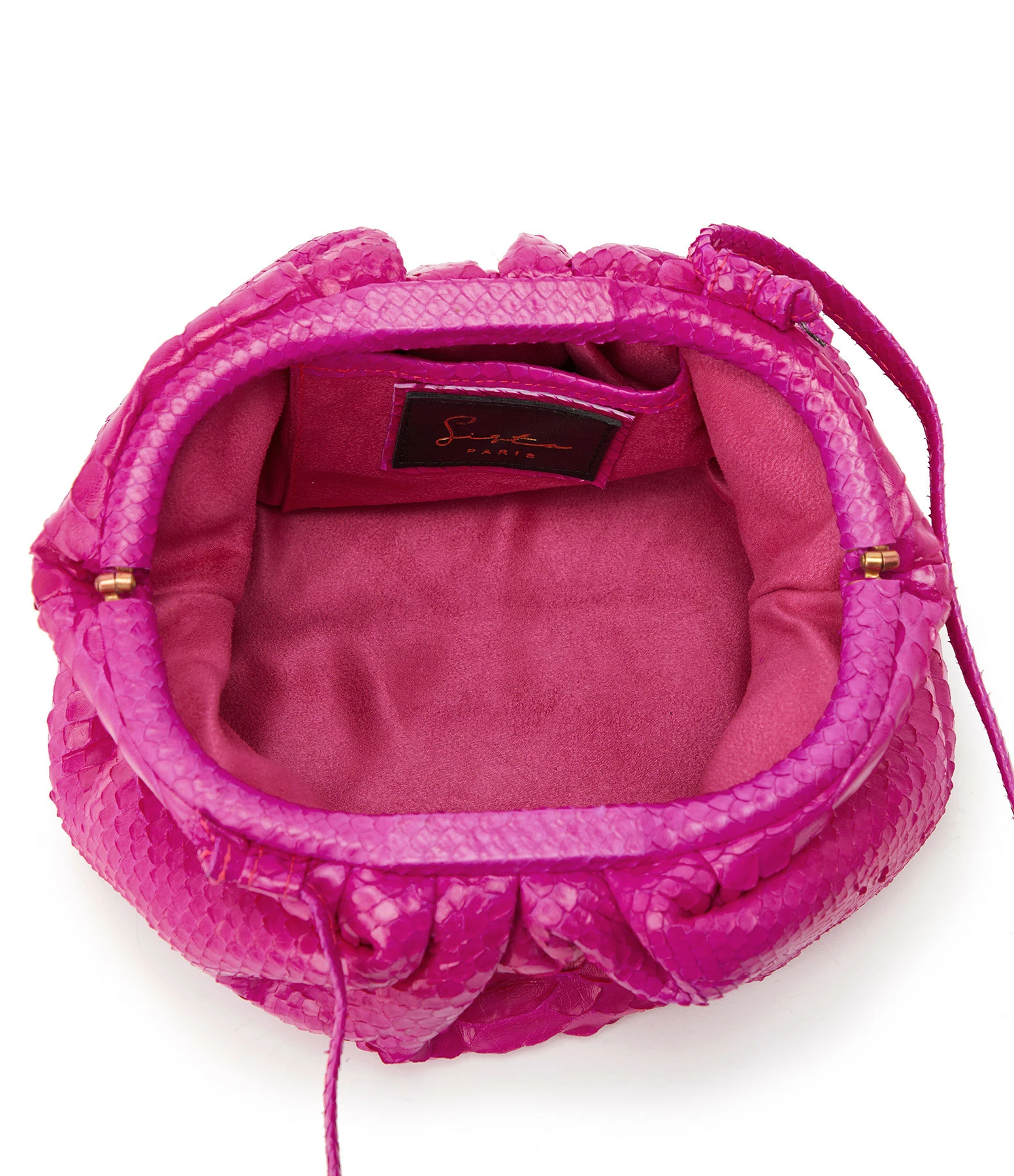 Sac bandoulière souple en python rose. Une poche plaquée à l’intérieur. Fermeture par aimant.