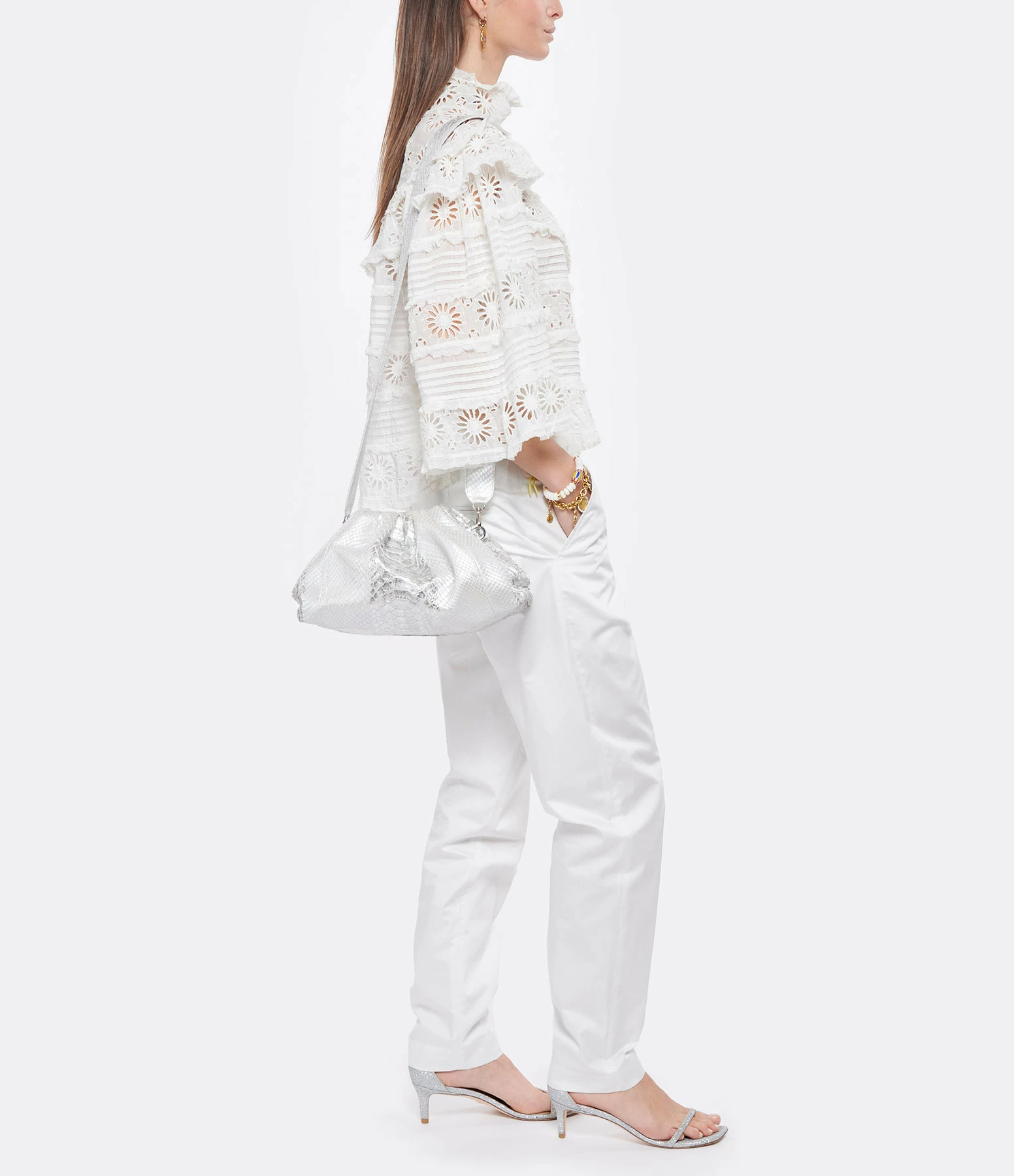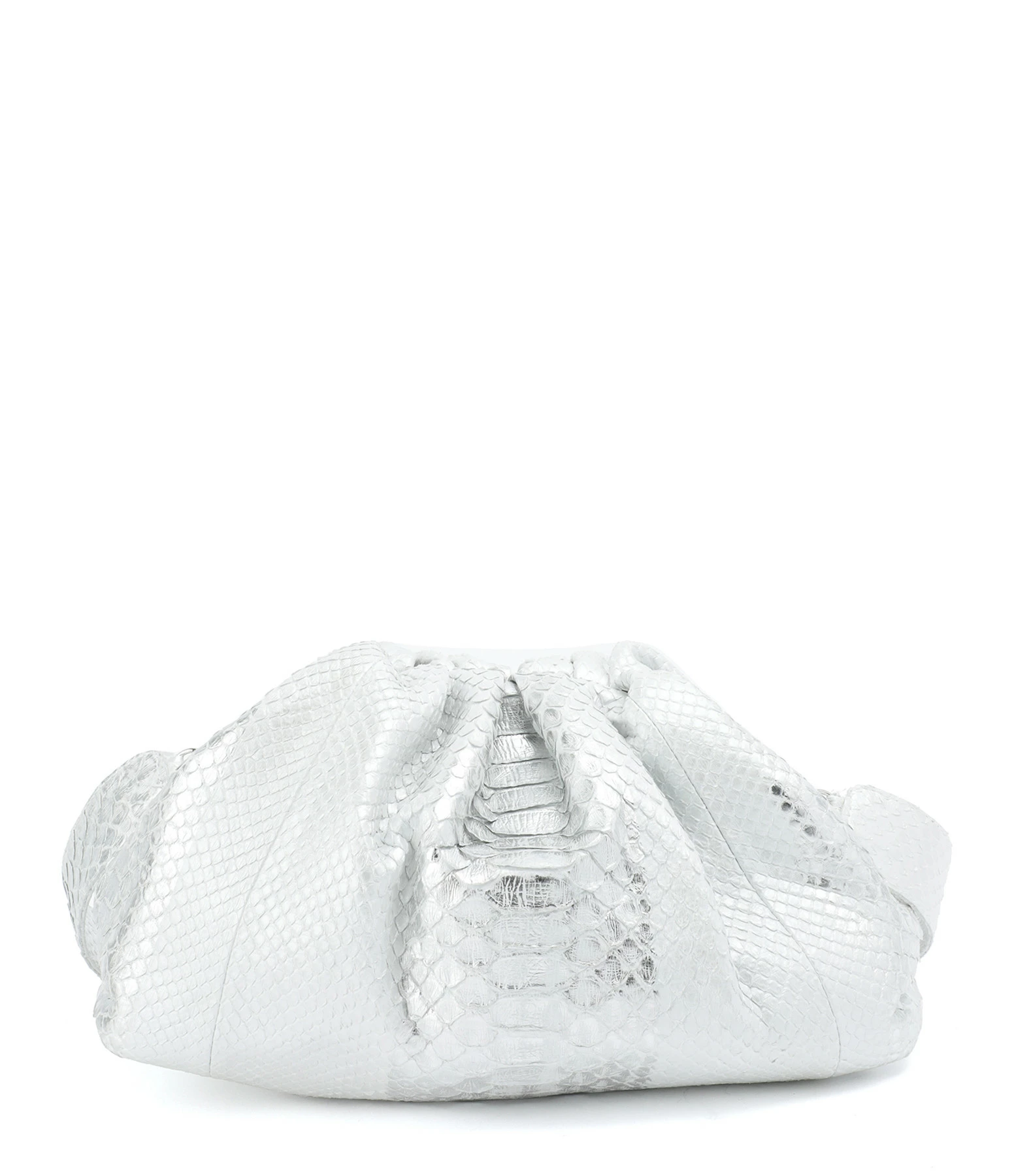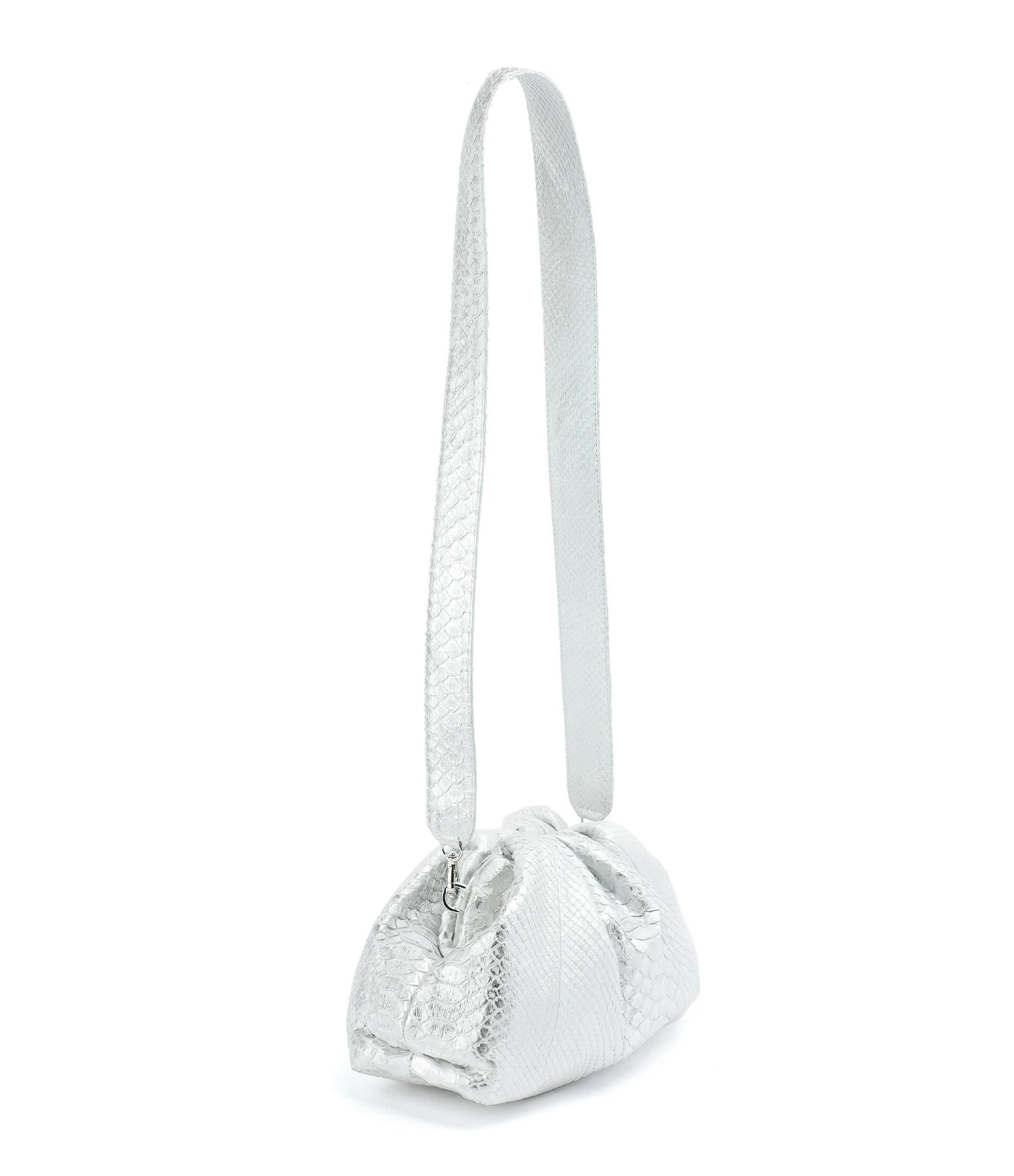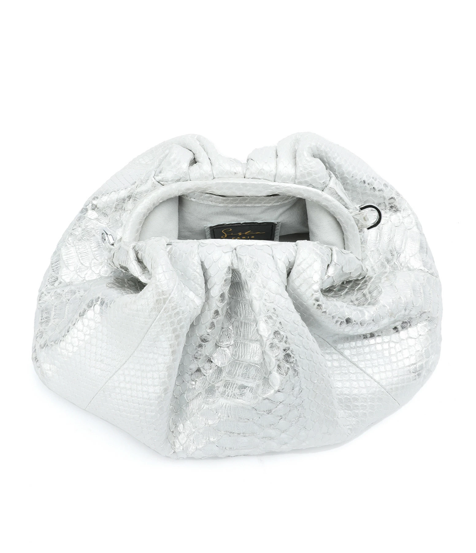 Sac souple en python argenté. Bandoulière amovible par mousquetons. Une poche plaquée à l’intérieur. Fermeture par aimant.