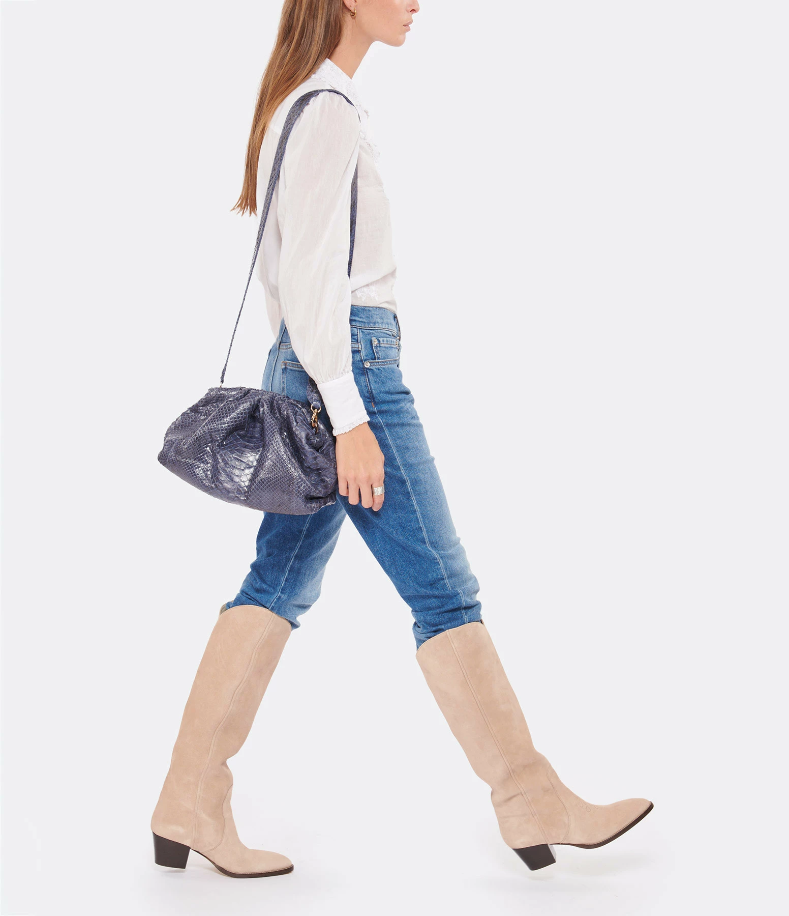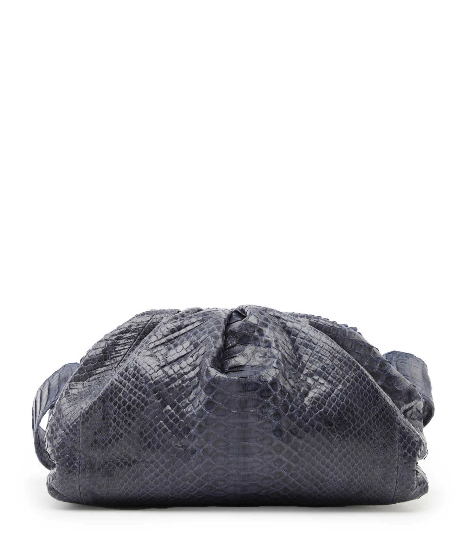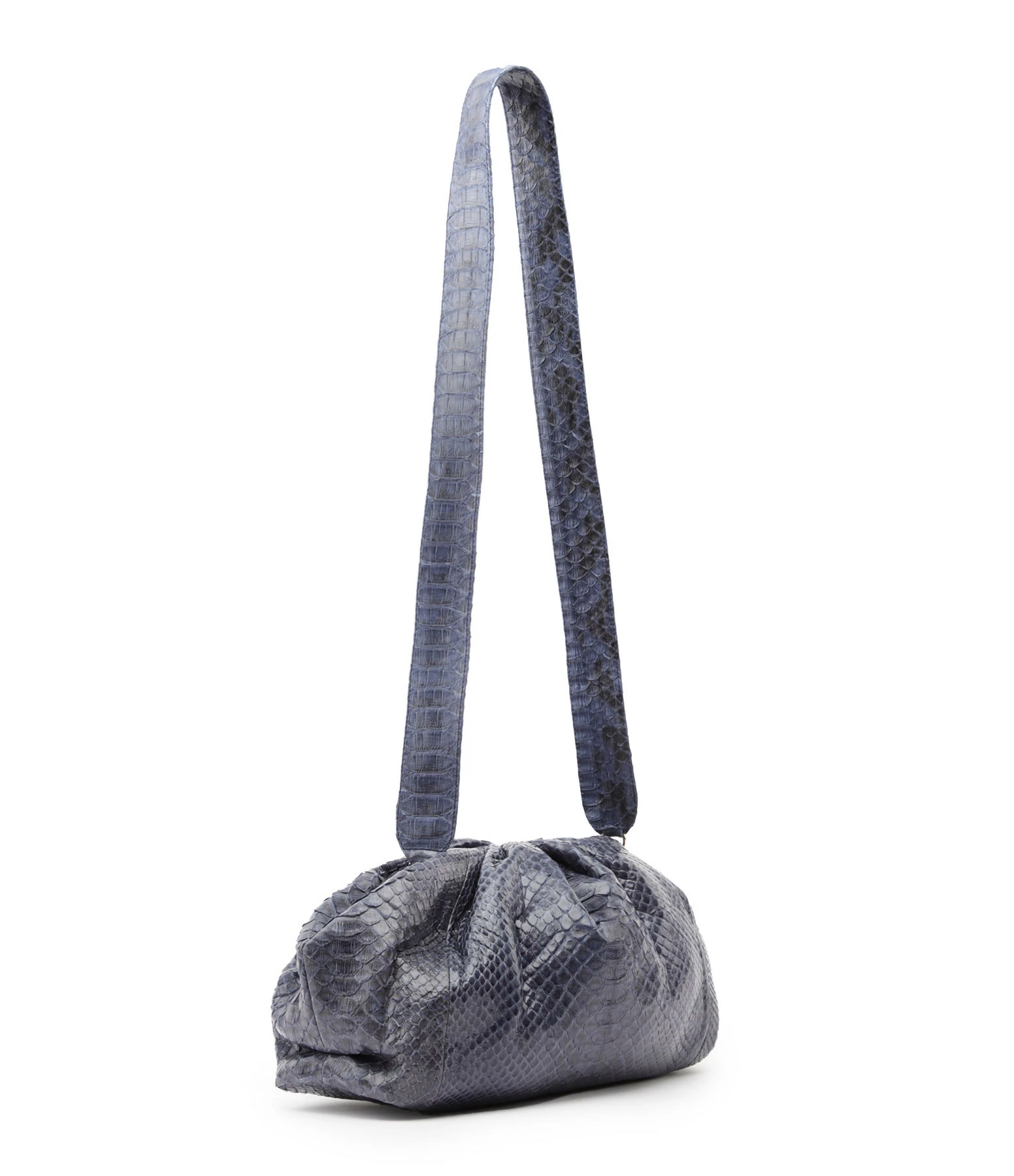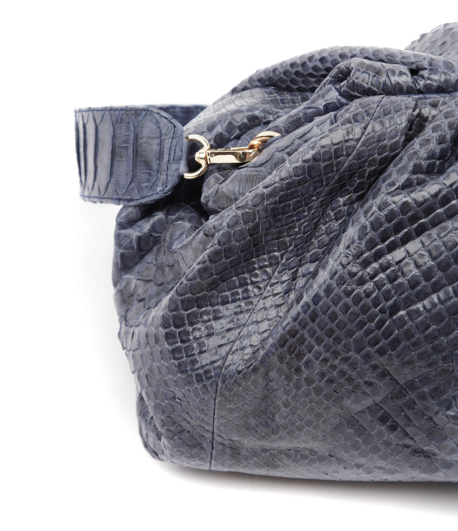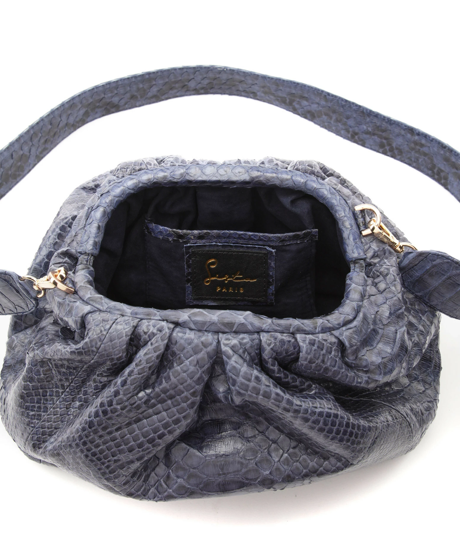 Sac souple en python bleu foncé. Bandoulière amovible par mousquetons. Une poche plaquée à l’intérieur. Fermeture par aimant.