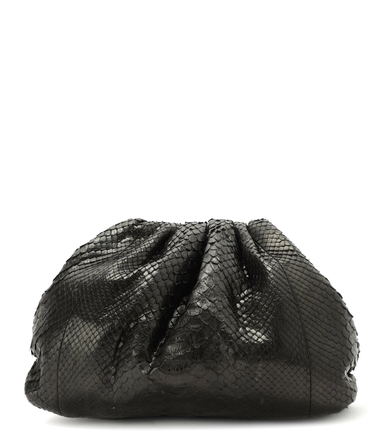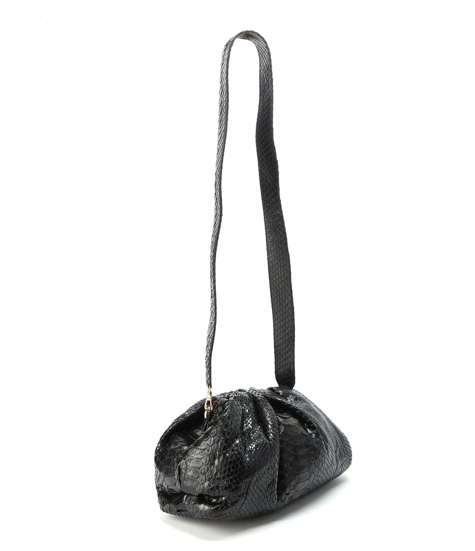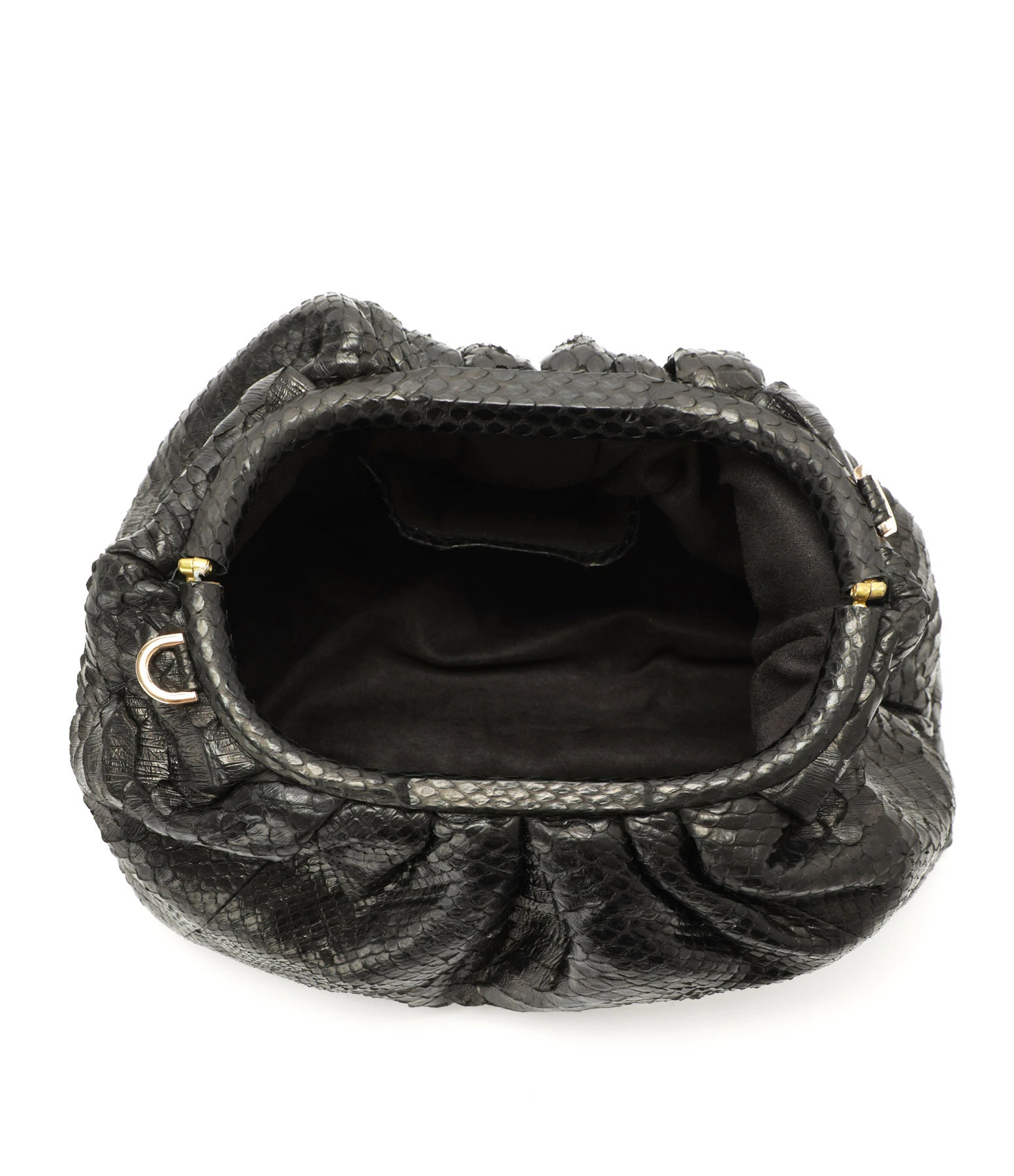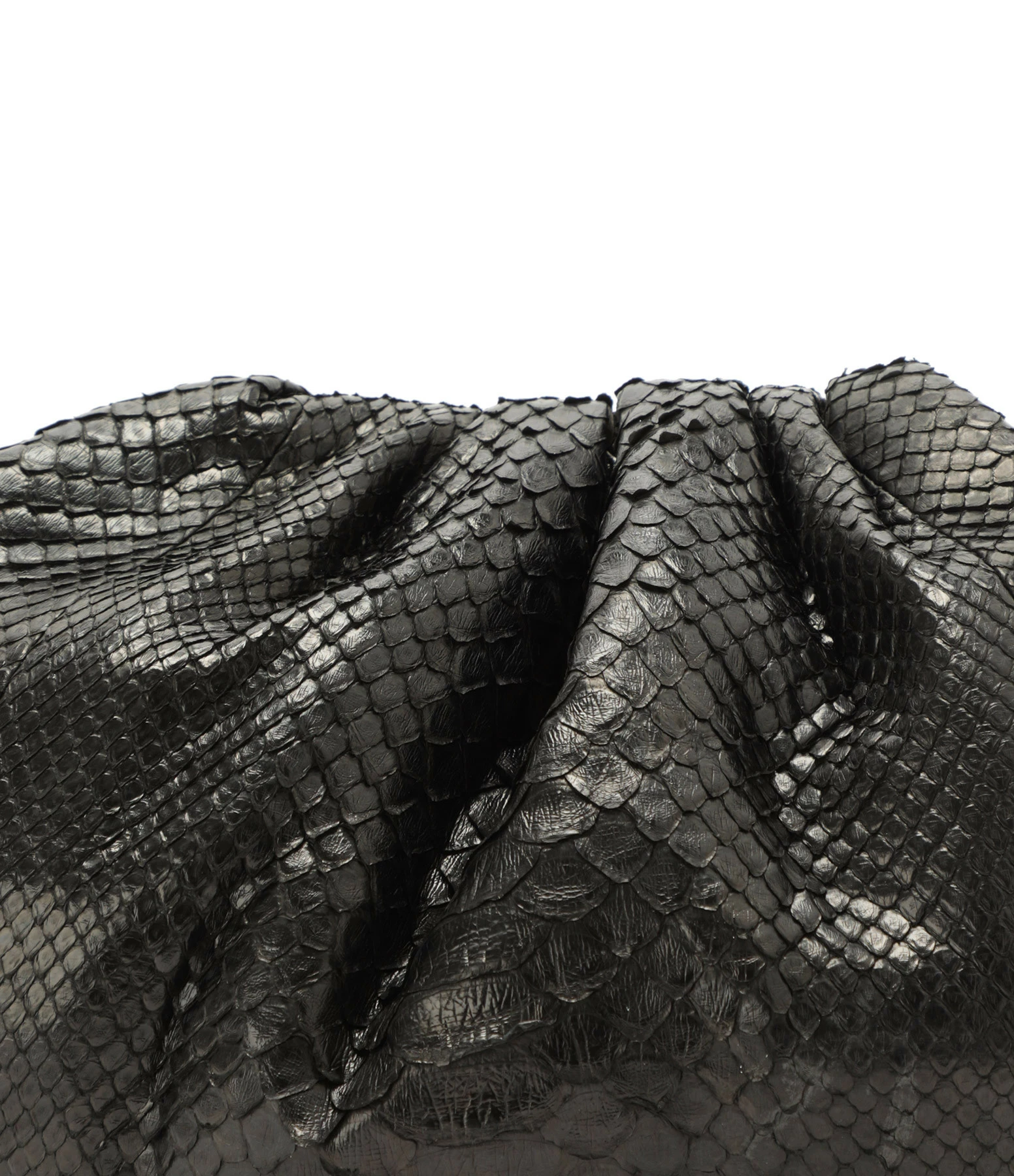Sac souple en python noir. Bandoulière amovible par mousquetons. Une poche plaquée à l’intérieur. Fermeture par aimant.
