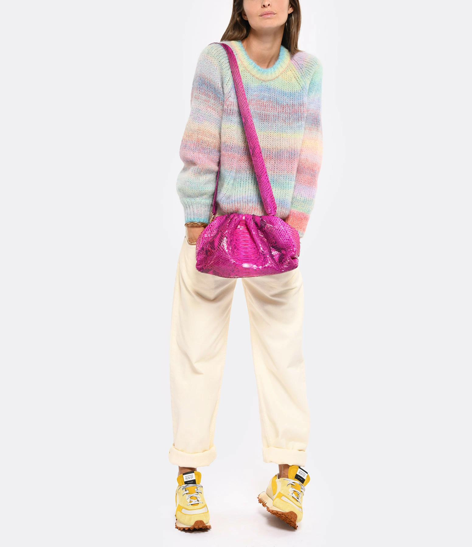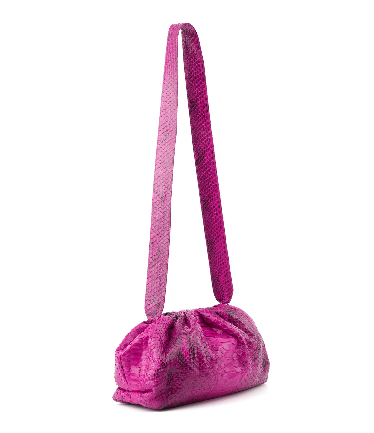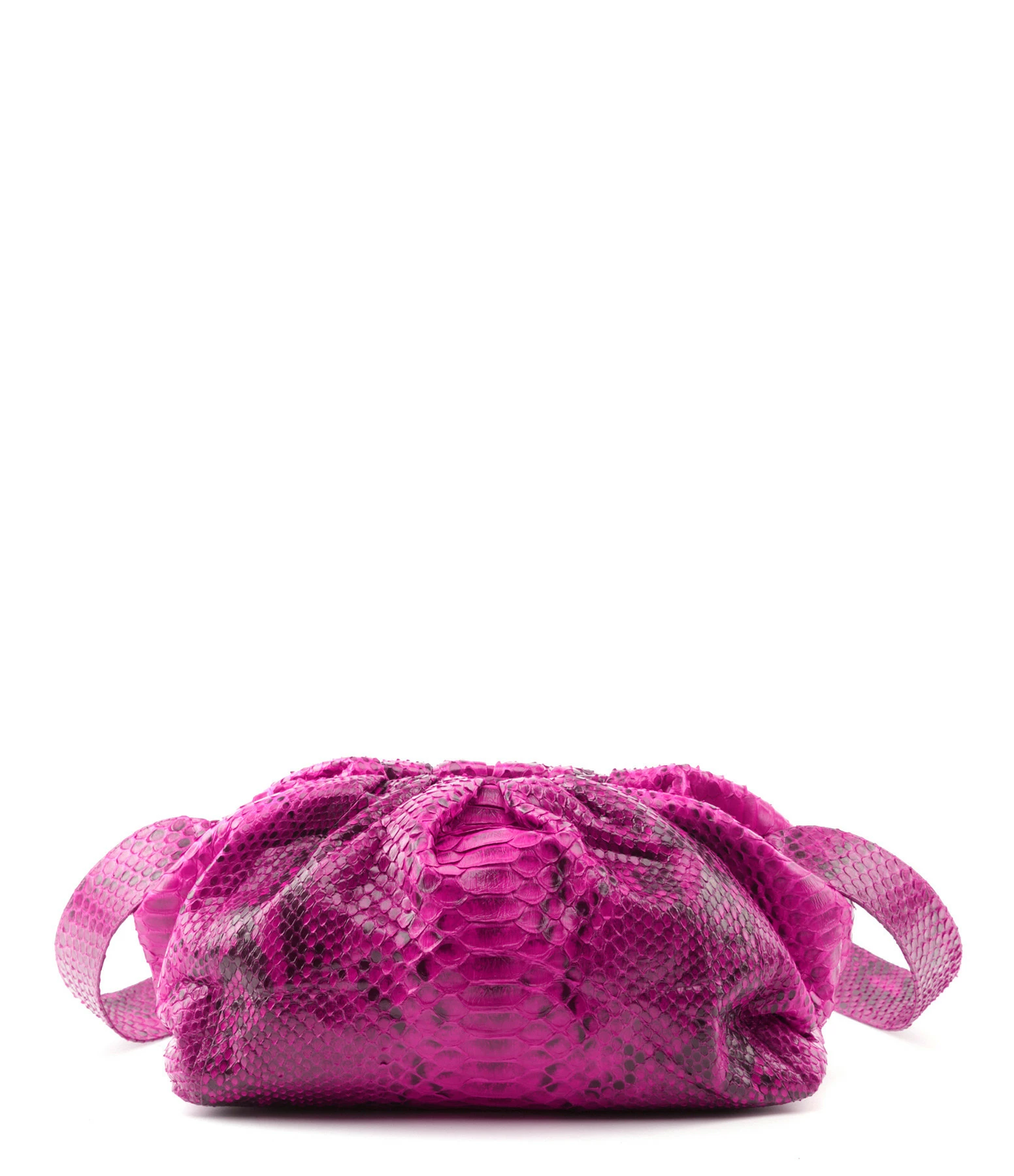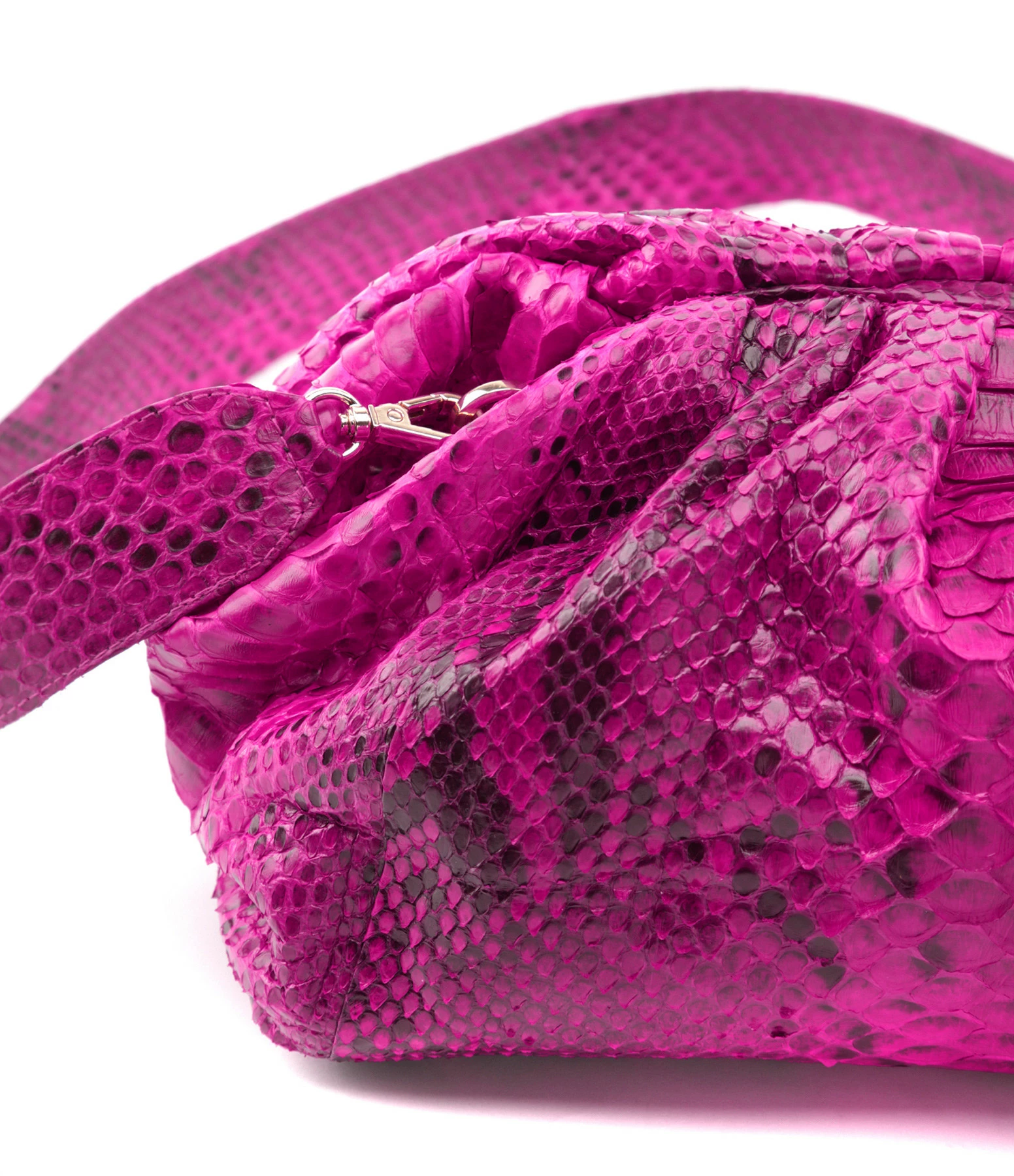 Sac souple en python rose et noir. Bandoulière amovible par mousquetons. Une poche plaquée à l’intérieur. Fermeture par aimant.