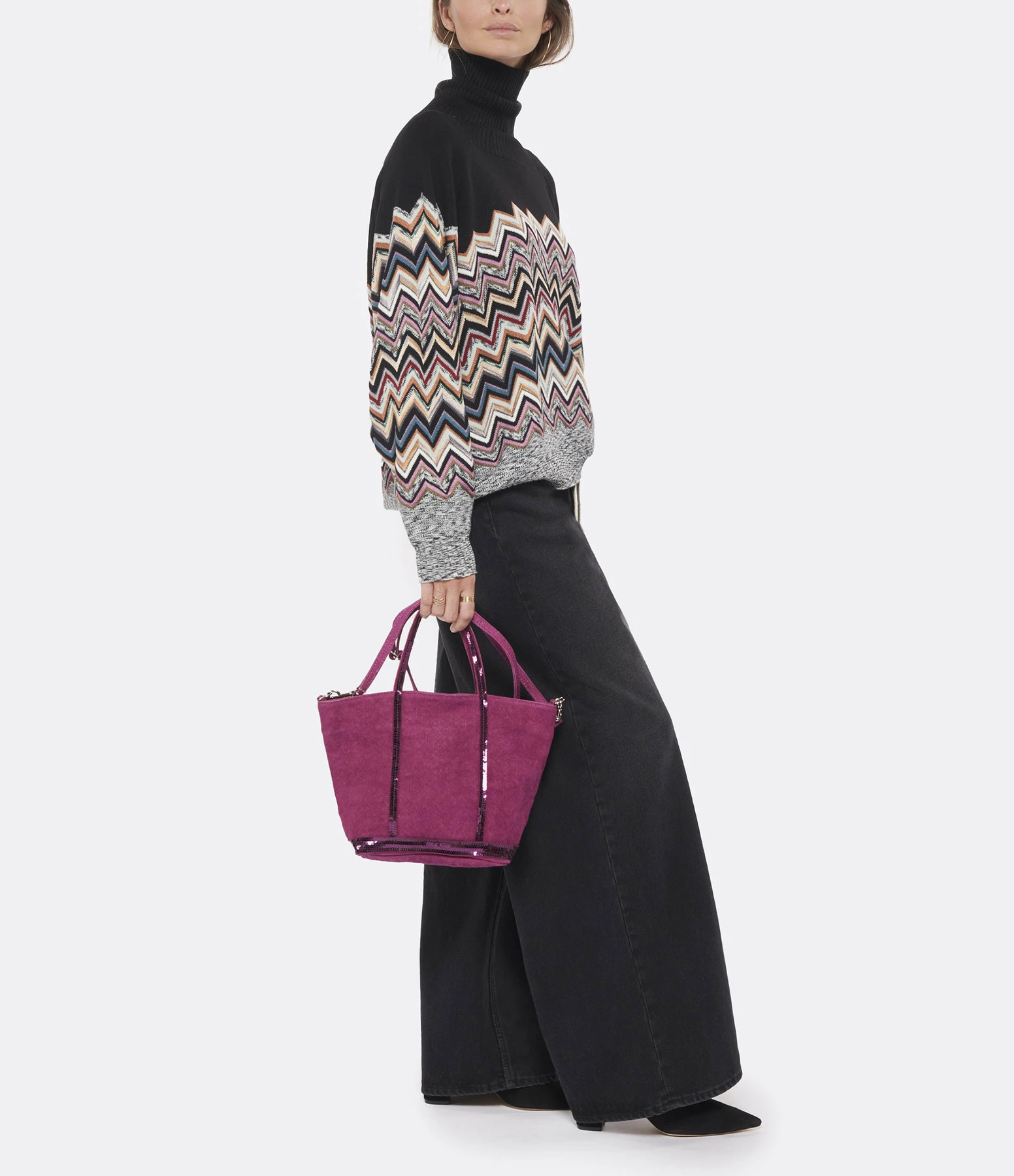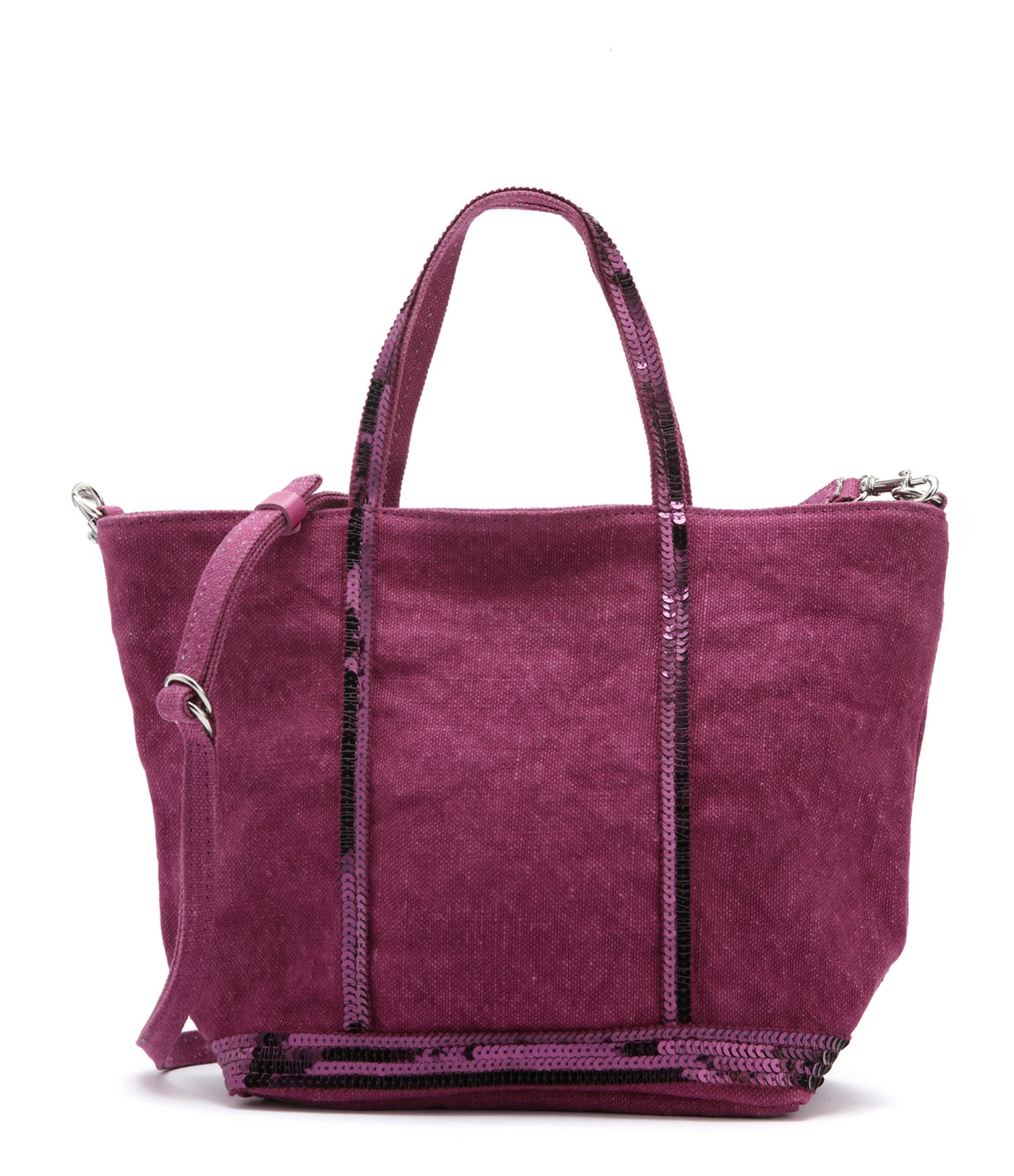 Petit sac cabas en lin violet avec bandes de sequins. Deux anses et une bandoulière réglable et amovible.