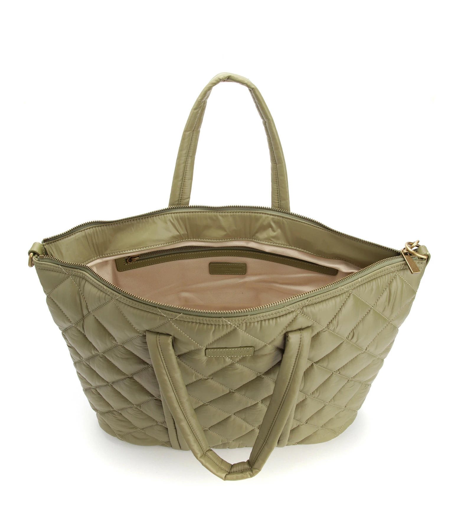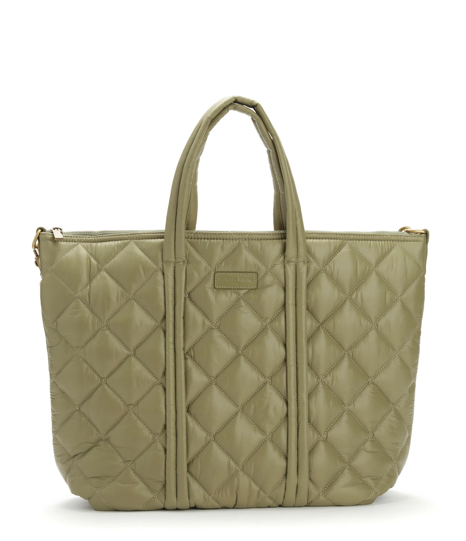 Sac effet doudoune matelassé kaki avec œillets dorés vieillis. Fermeture par zip. Bandoulière plate kaki, réglable et amovible par mousquetons. Deux anses. Intérieur doublé en coton avec une poche zippée et deux poches plates.