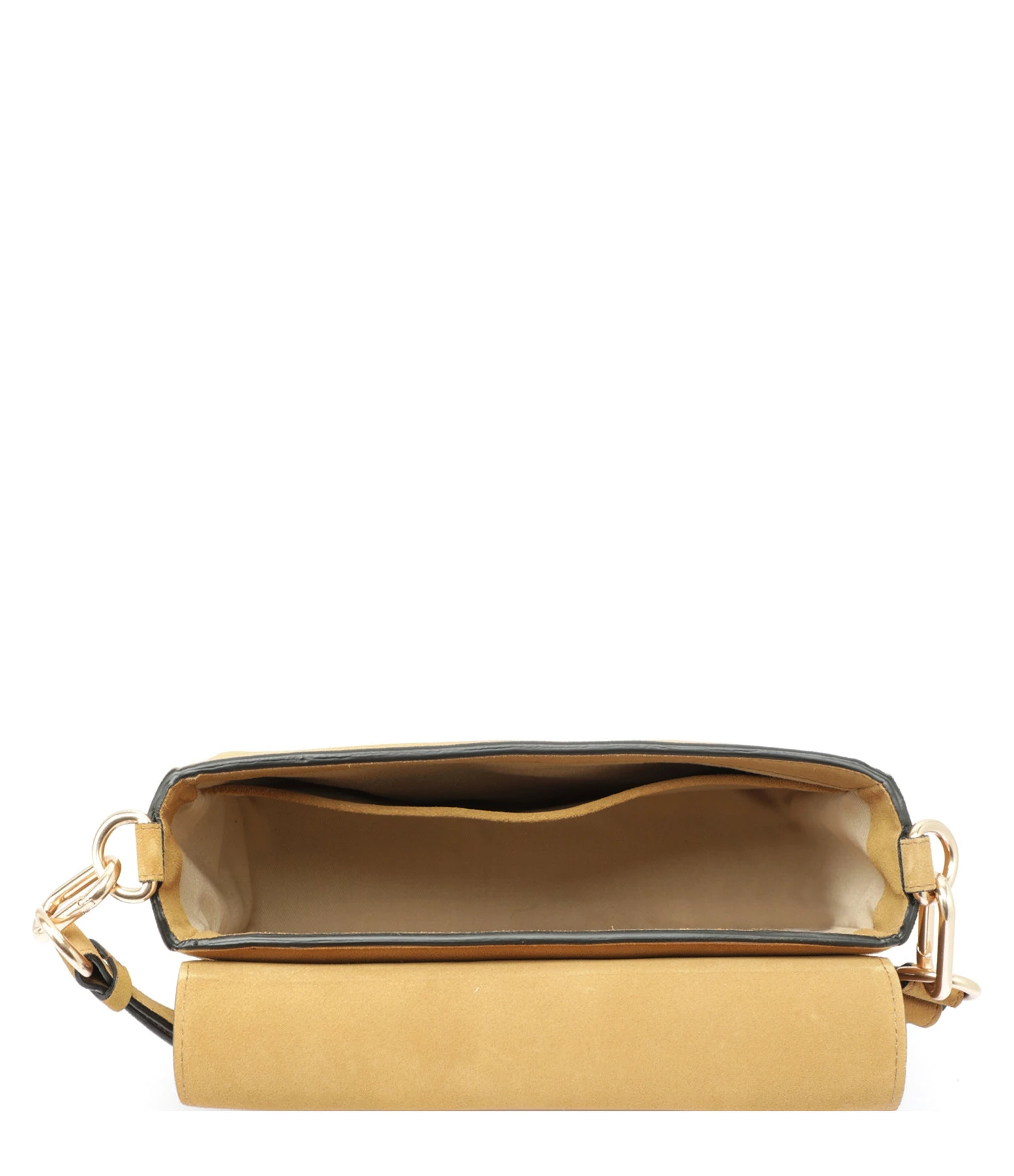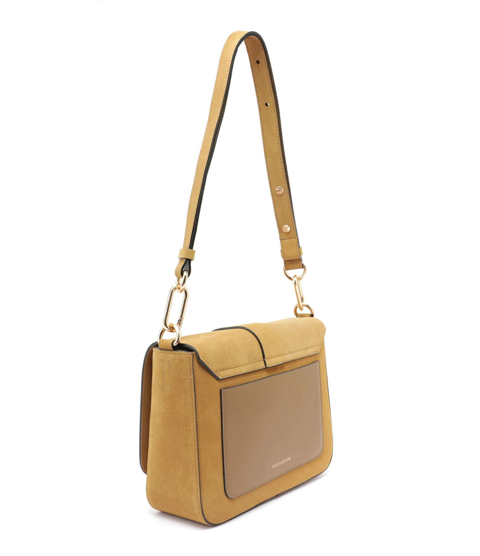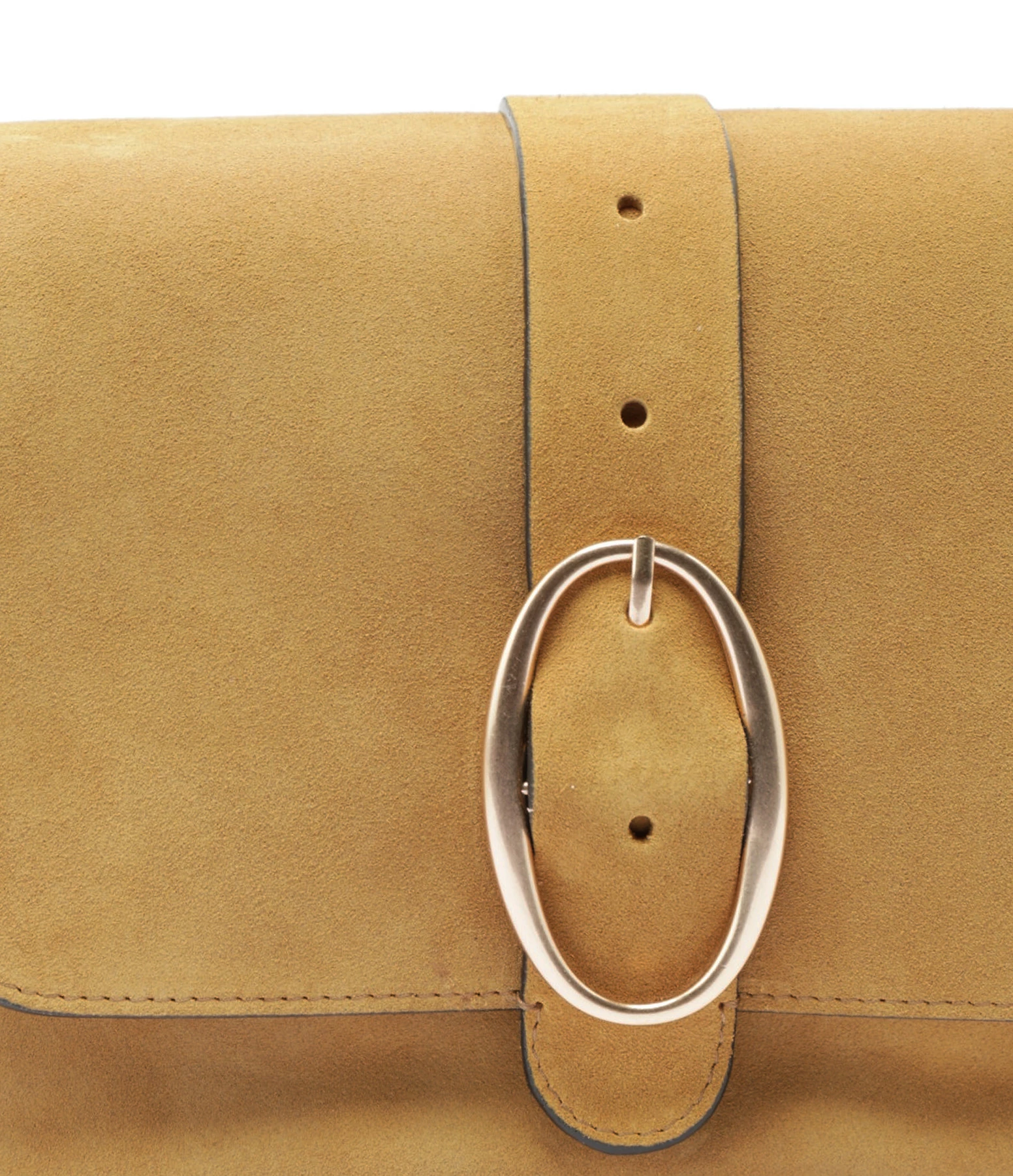 Sac à rabat en cuir suédé beige orné d’une boucle en métal dorée. Bandoulière ajustable permettant ainsi un double porté : épaule ou croisé. Deux poches intérieures et d’une poche au dos du sac estampillée « Vanessa Bruno». Fermoir à pression.