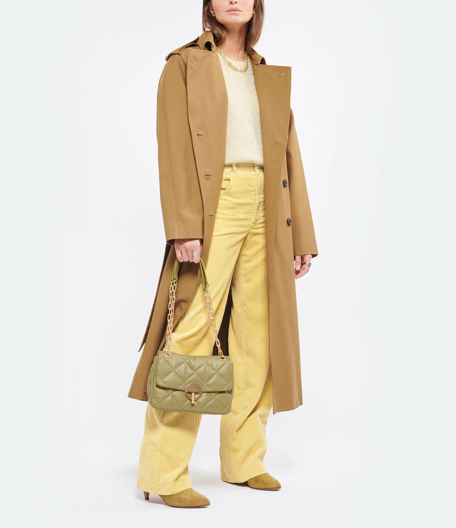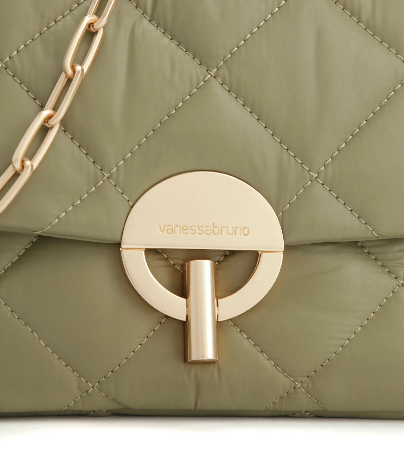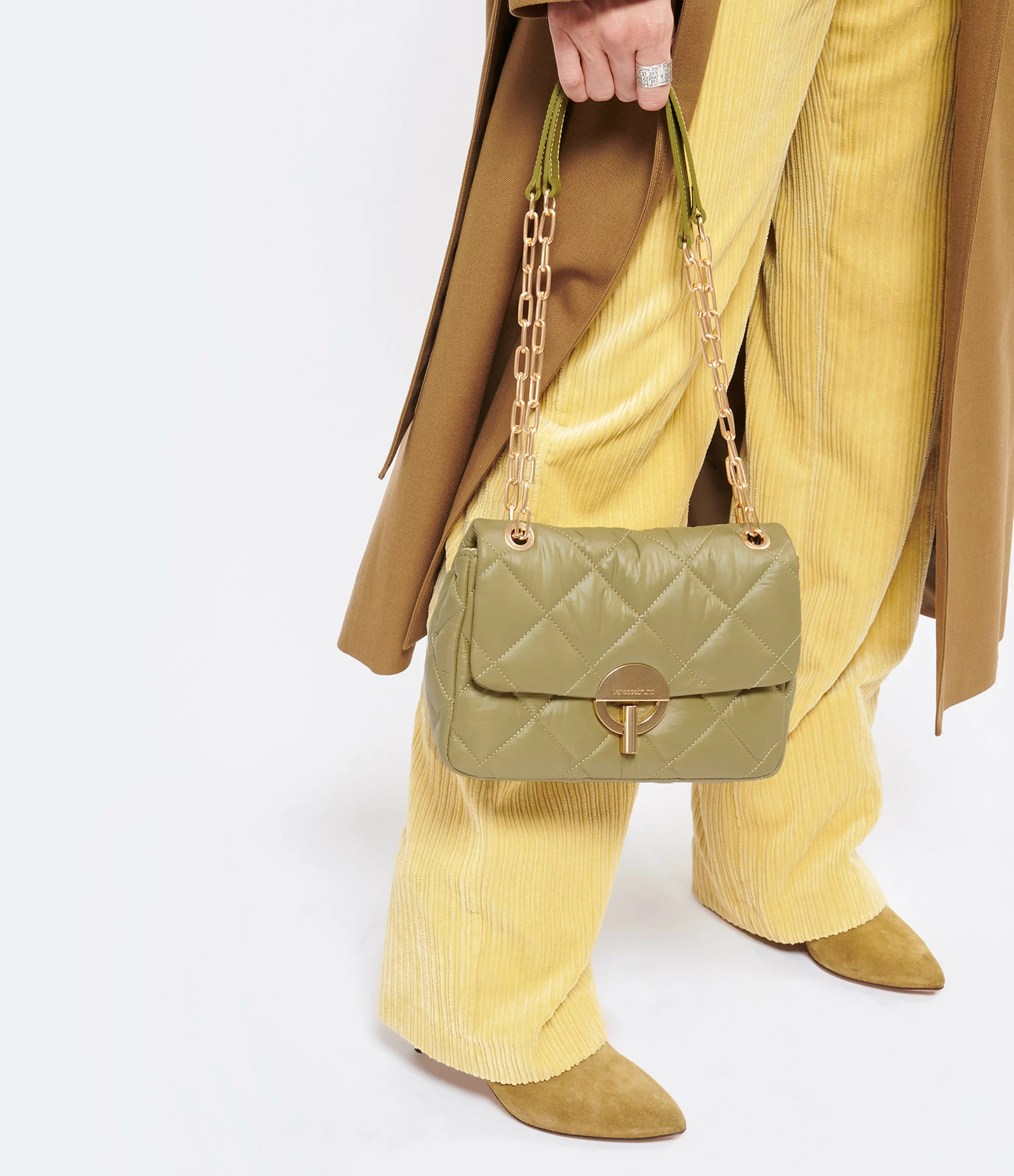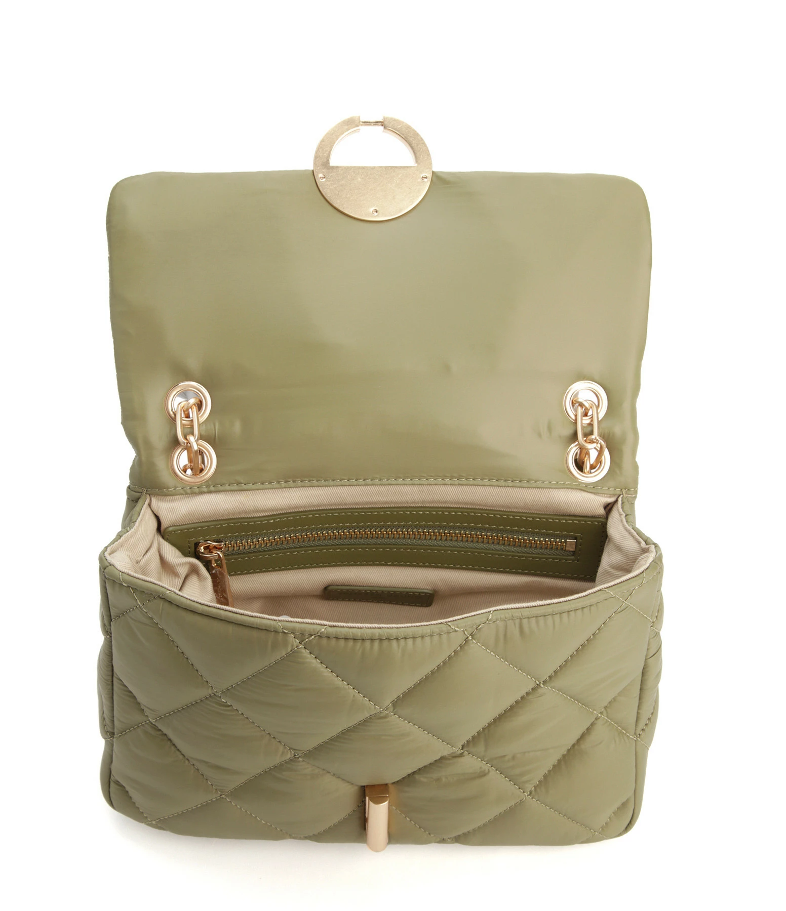 Sac bandoulière à rabat kaki matelassé effet doudoune. Bandoulière en chaîne et poigné en cuir, possibilité de porter en double chaîne Fermeture par boucle métallique. Intérieur doublé en coton avec une poche zippée et une poche plaquée.
