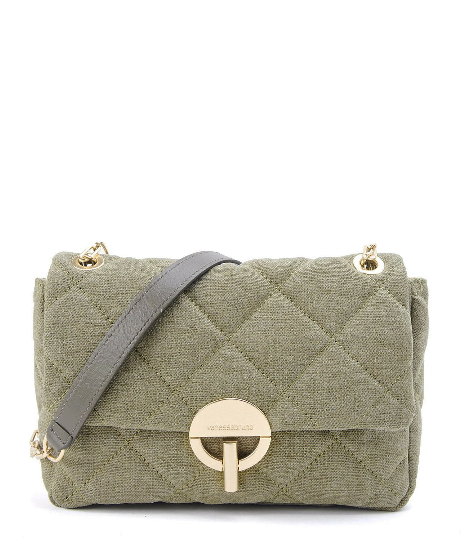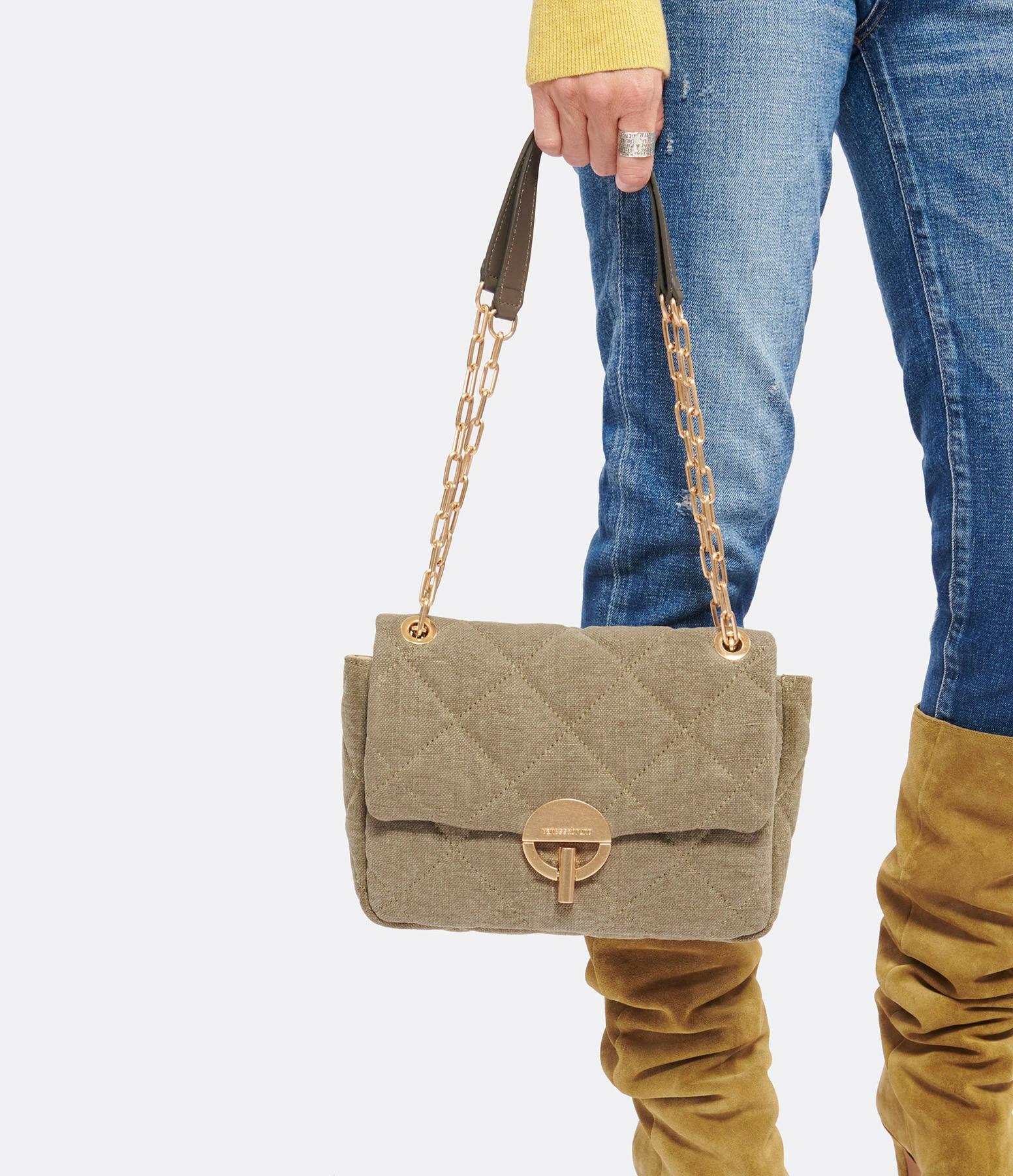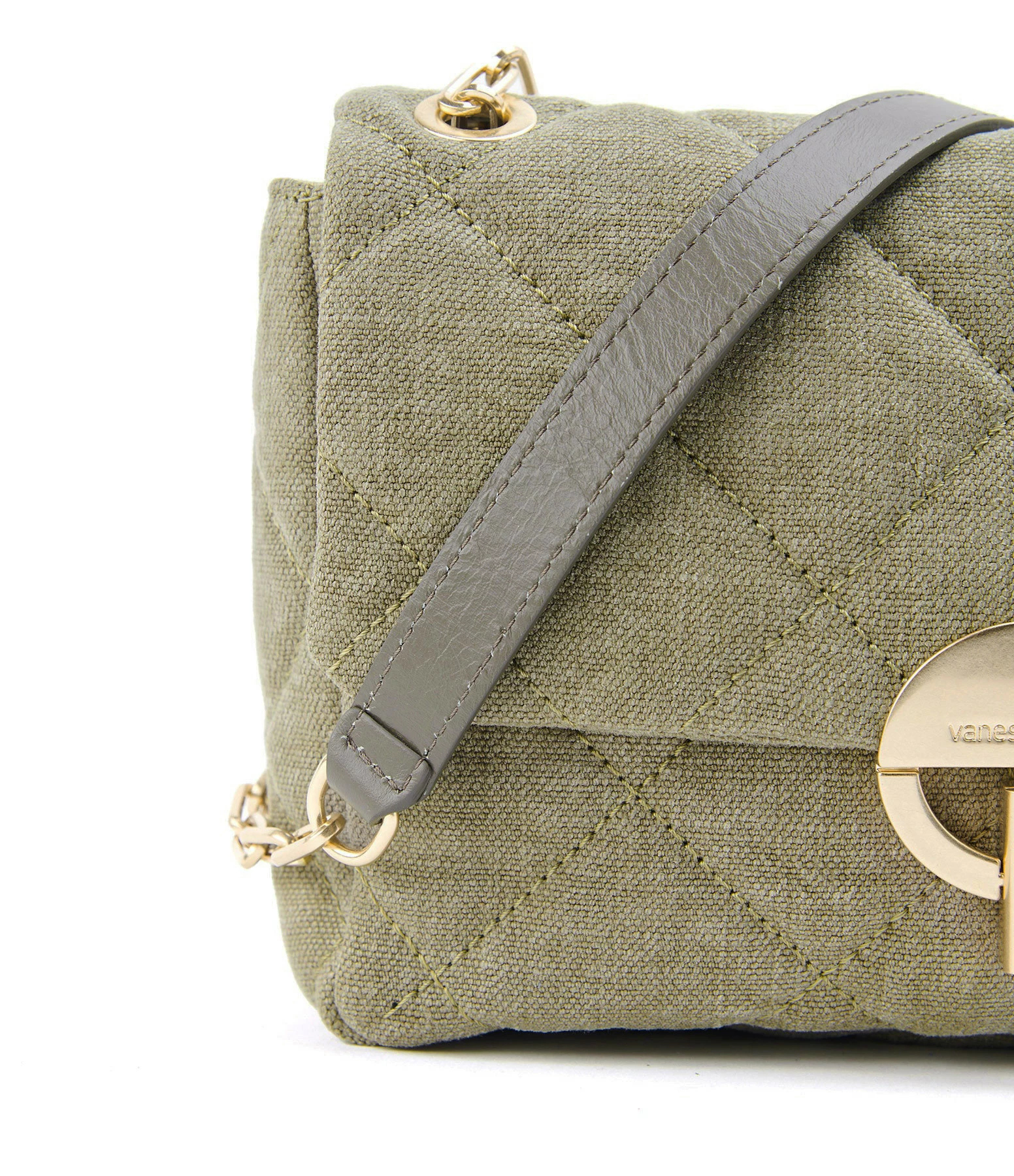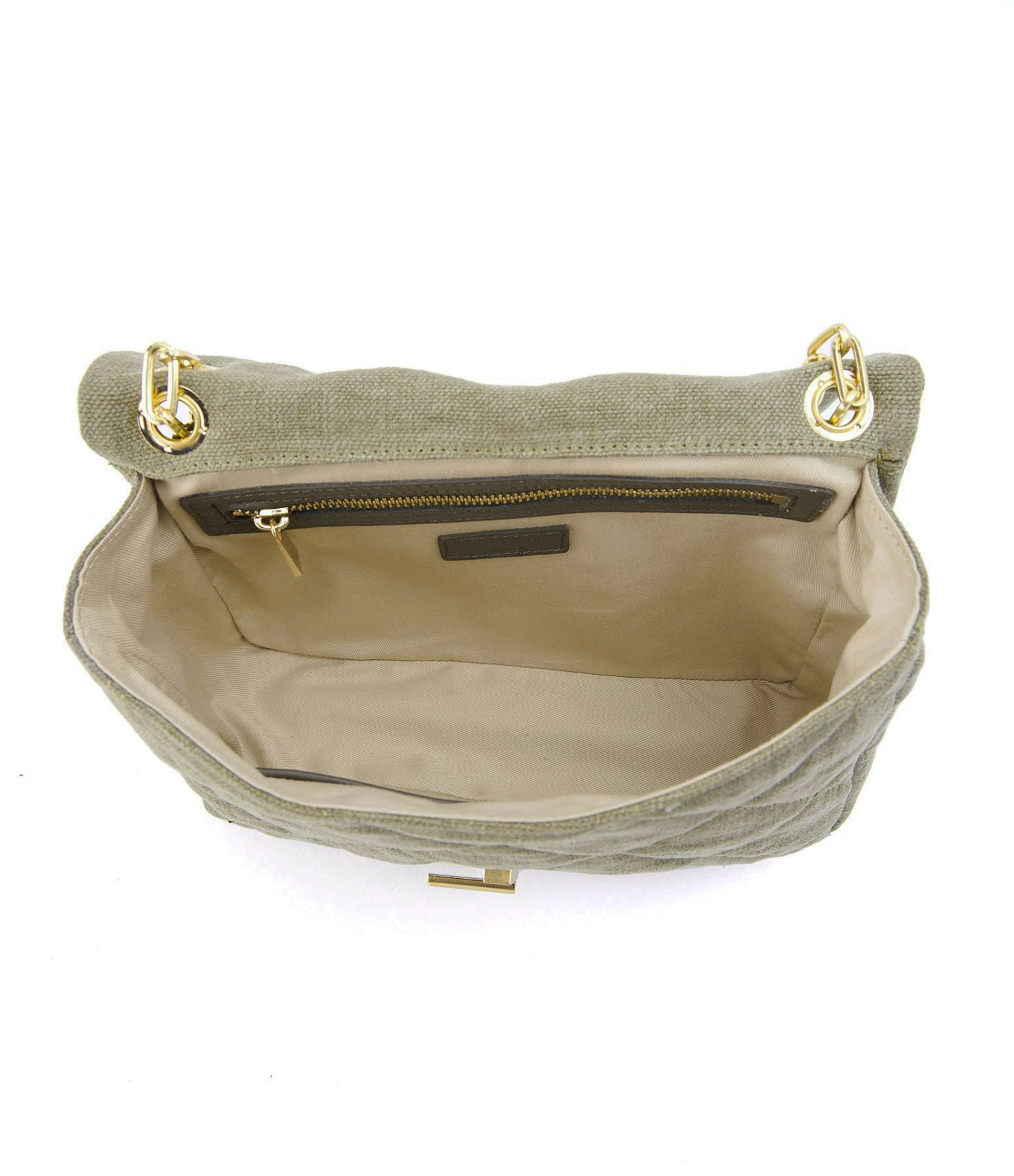 Sac bandoulière à rabat en lin matelassé kaki. Bandoulière en chaîne et poignet en cuir, possibilité de porter en double chaîne Fermeture par boucle métallique. Intérieur doublé en coton avec une poche zippée et une poche plaquée.