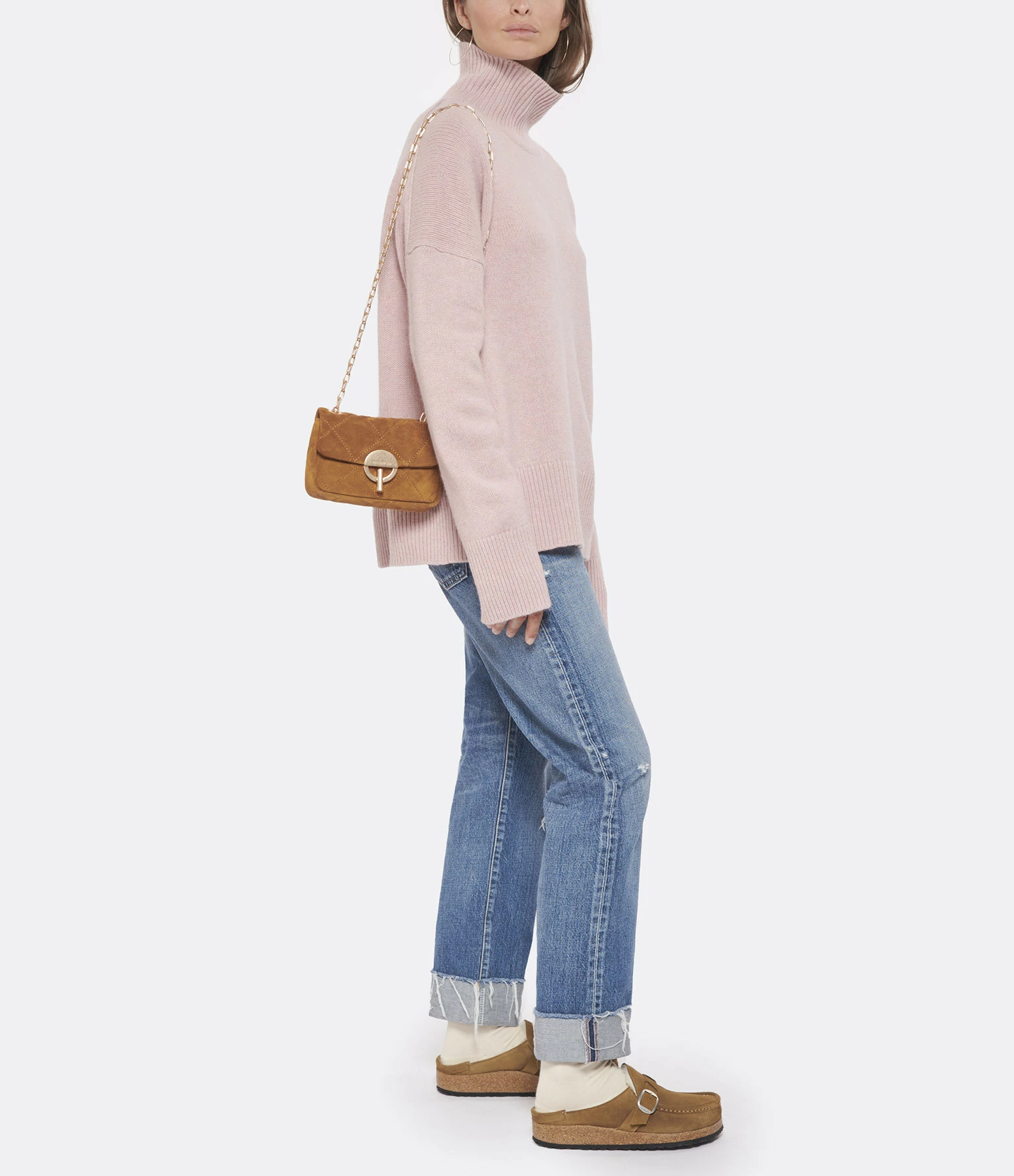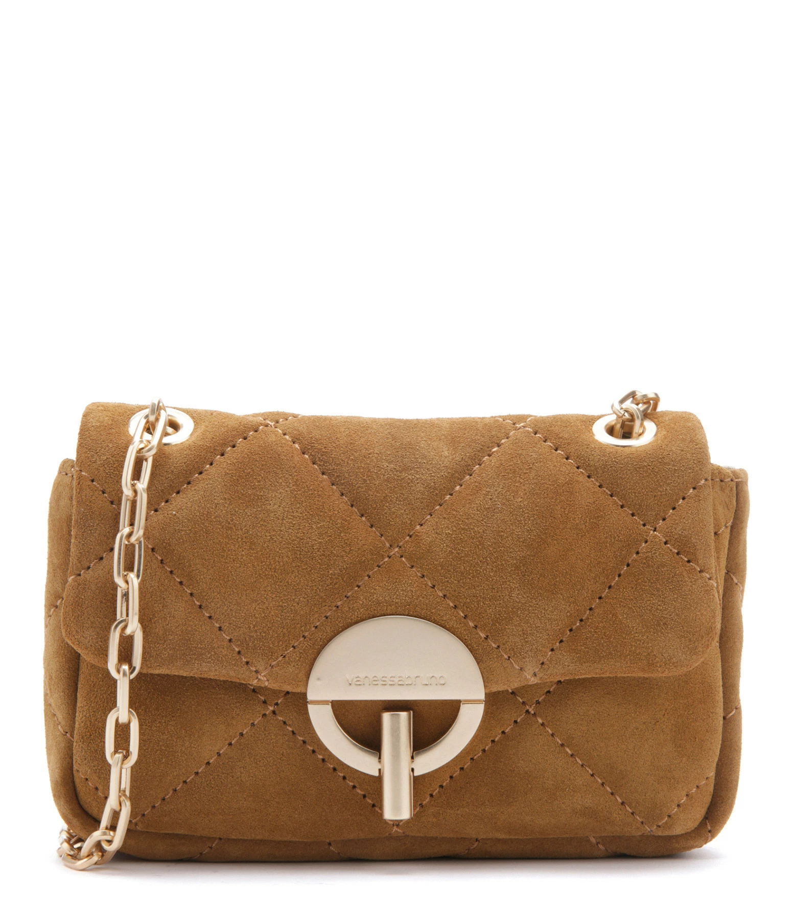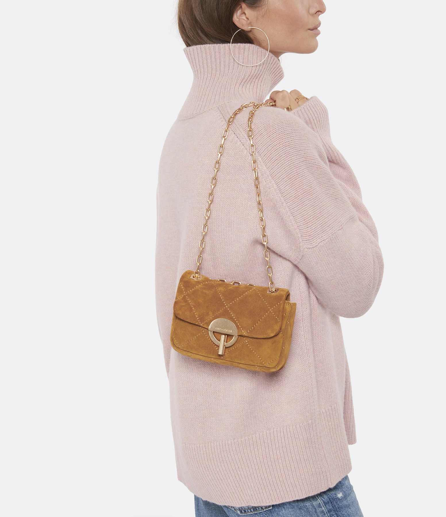 Sac bandoulière à rabat en cuir suédé matelassé marron. Bandoulière en chaîne, possibilité de porter en double chaîne Fermeture par boucle métallique. Intérieur doublé en coton avec une poche plaquée. Poche plaquée à l’arrière.