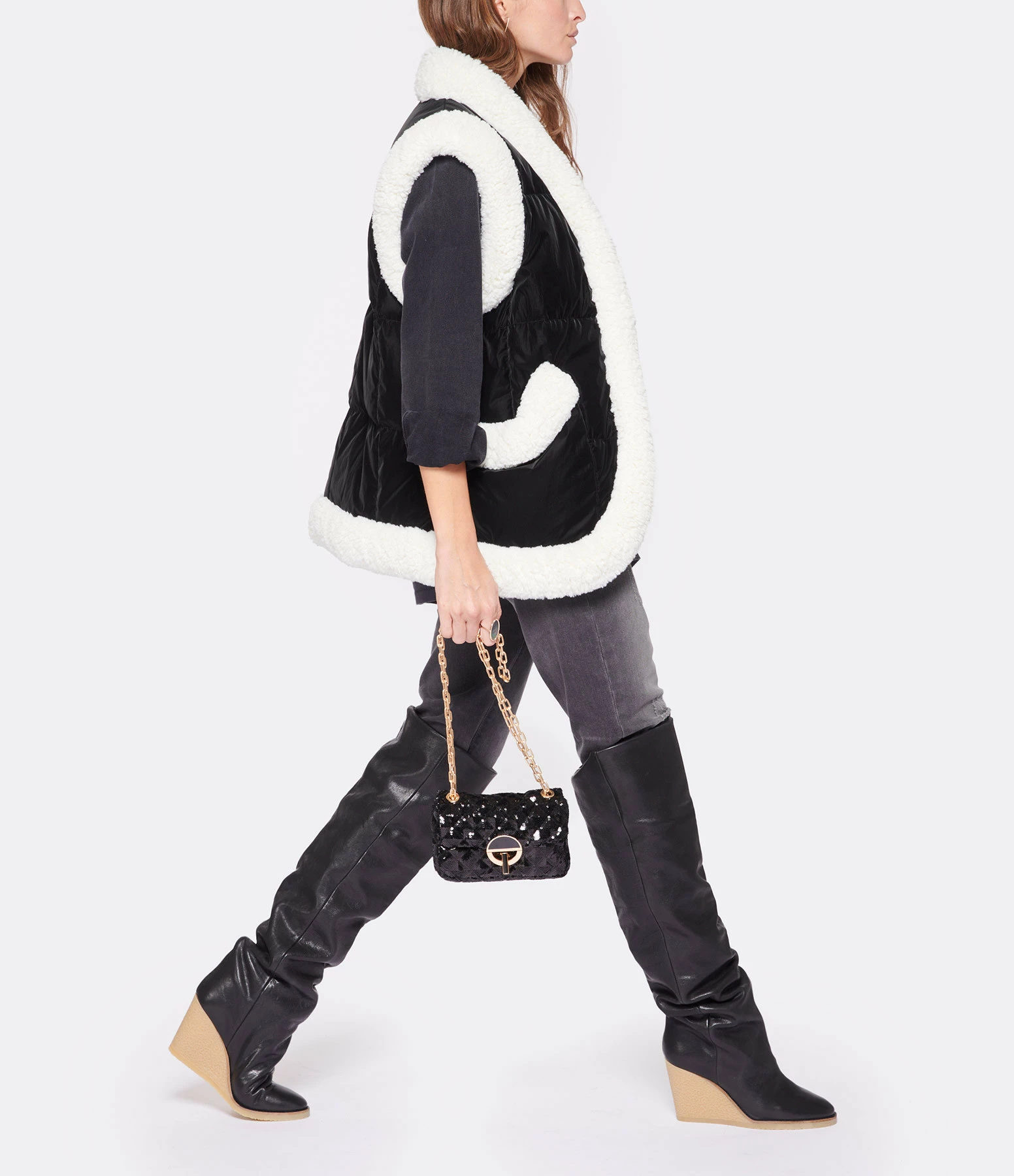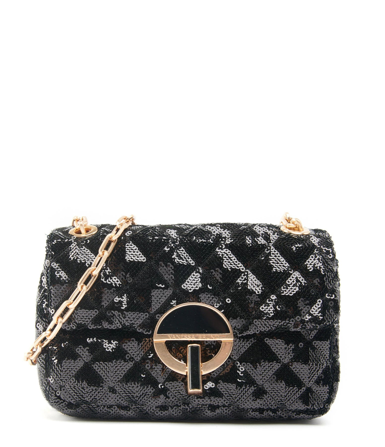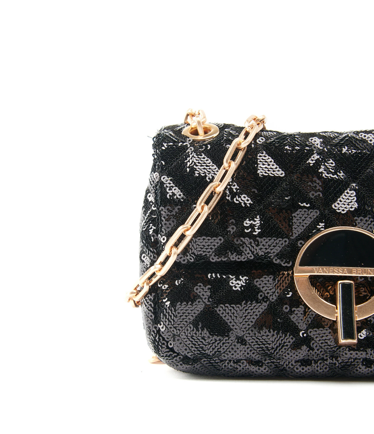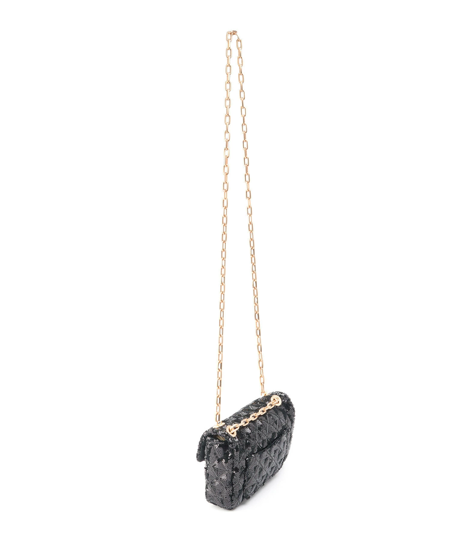 Mini sac bandoulière en sequins noirs. Bandoulière en chaîne dorée ajustable avec possibilité de porter en double chaîne pour porté épaule. Fermeture à rabat par boucle métallique dorée. Intérieur doublé en coton avec une poche plaquée. Une poche plaquée à l’arrière.