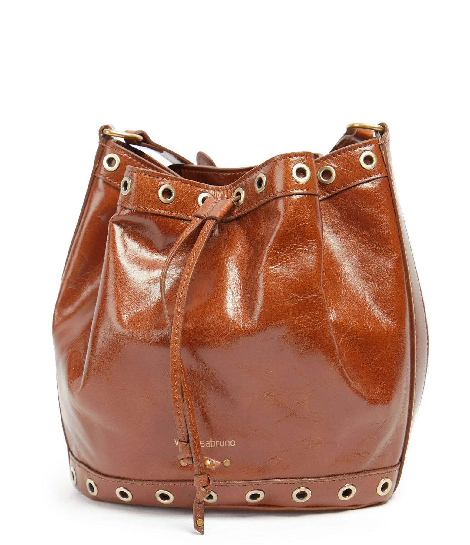 Sac bourse en cuir craquelé marron avec œillets. Une bandoulière ajustable, porté épaules ou cross body. Cordon en cuir aves passants pour le fermer. Intérieur doublé en coton. Marquage à chaud “Vanessa Bruno” à l’avant.