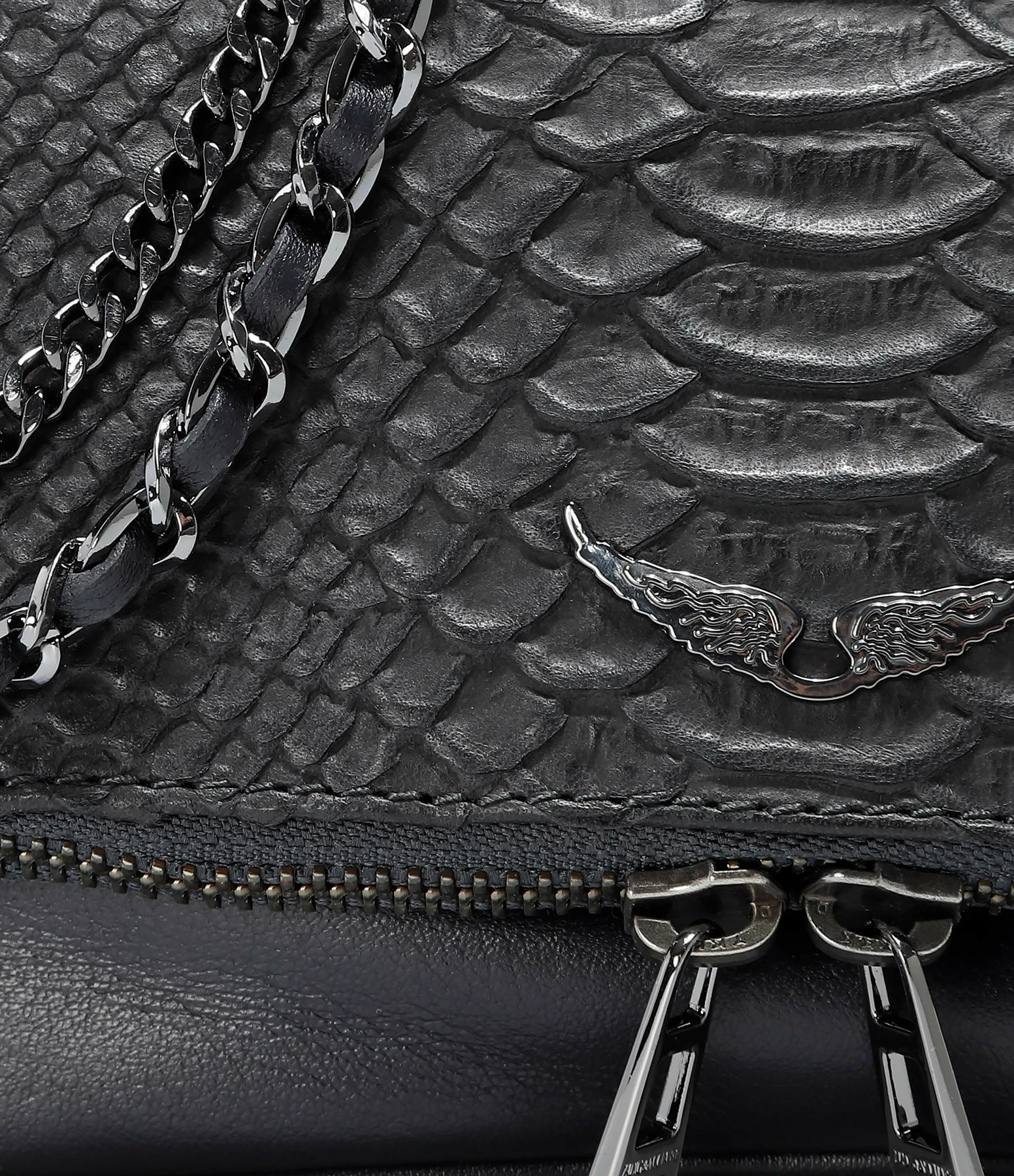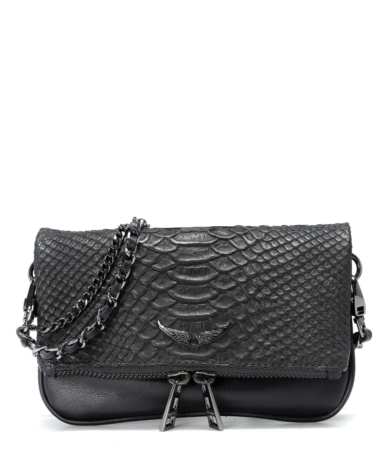Petite pochette en cuir effet serpent. Rabat aimanté avec fermeture zippée. Bandoulière deux longueurs, amovible par mousquetons.