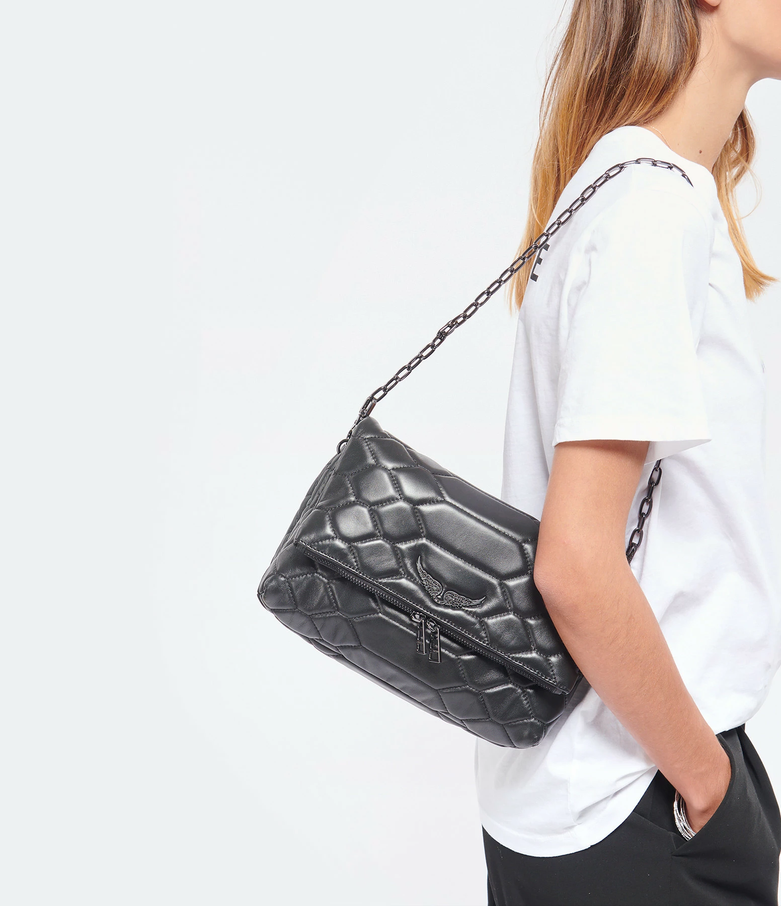 Sac en cuir matelassé noir. Fermeture par rabat aimanté. Intérieur doublé en coton composé de deux compartiments séparés par une poche zippée. Une poche zippée au dos. Deux bandoulières dont une chaîne et une en cuir amovible par mousquetons.