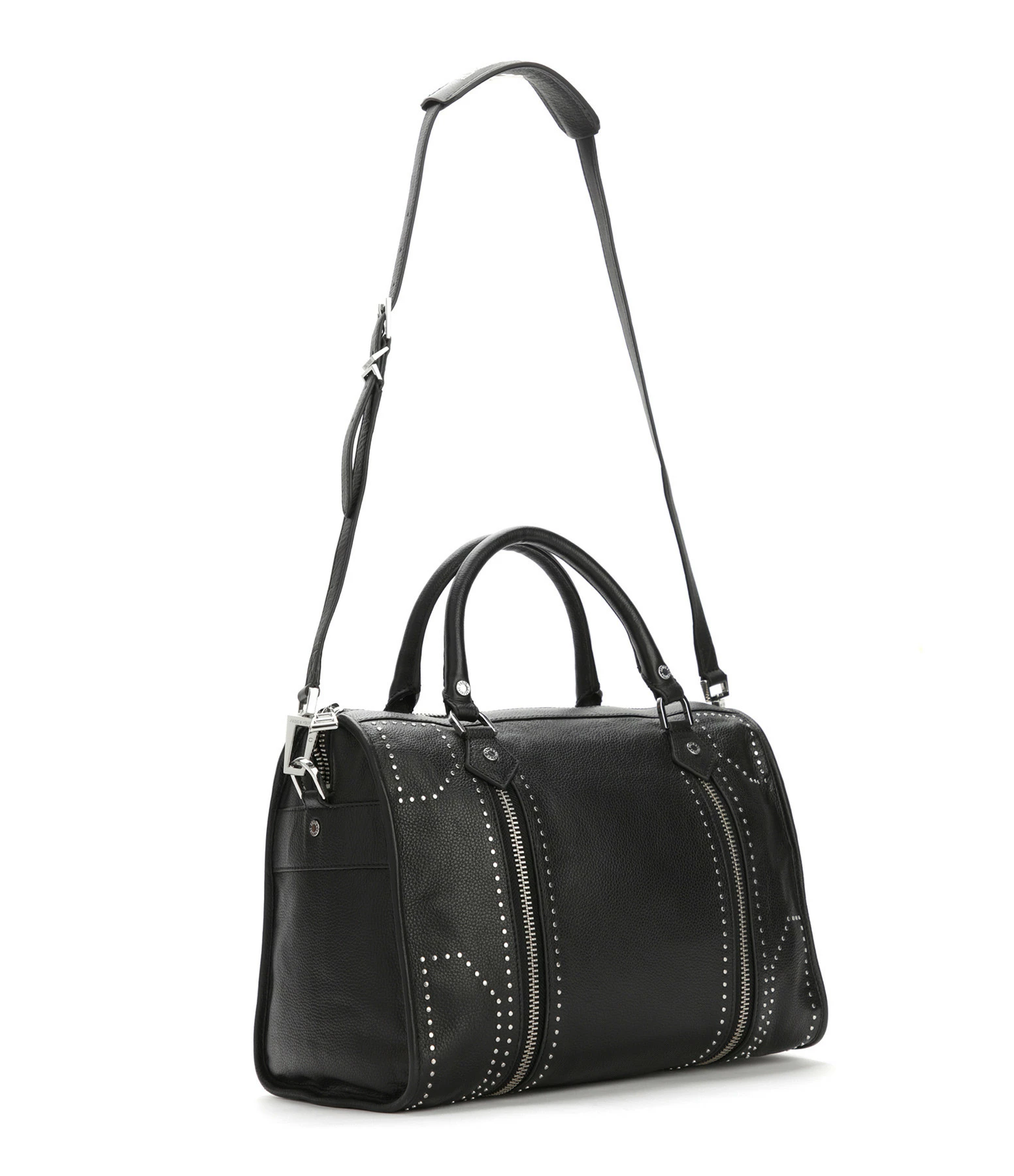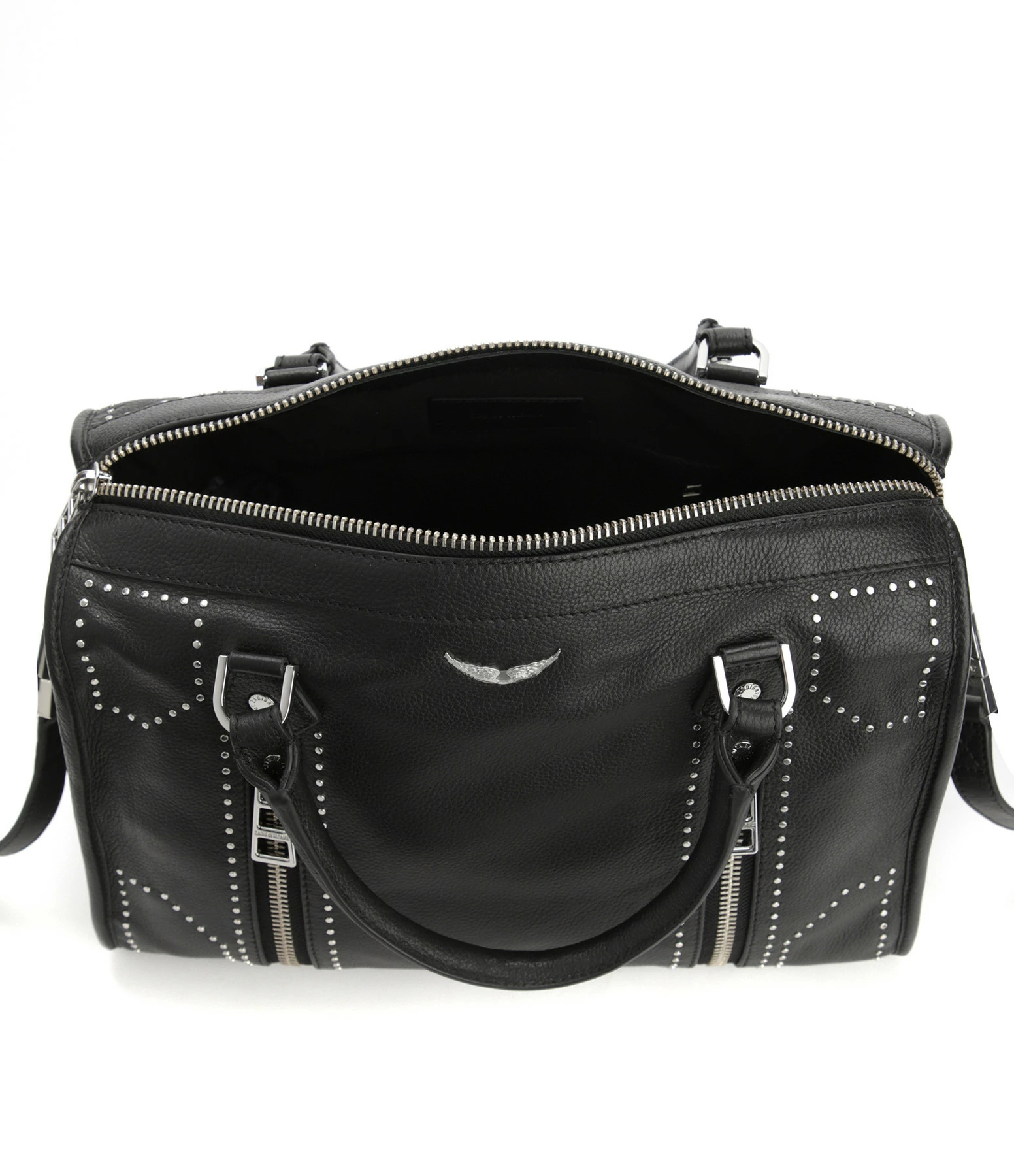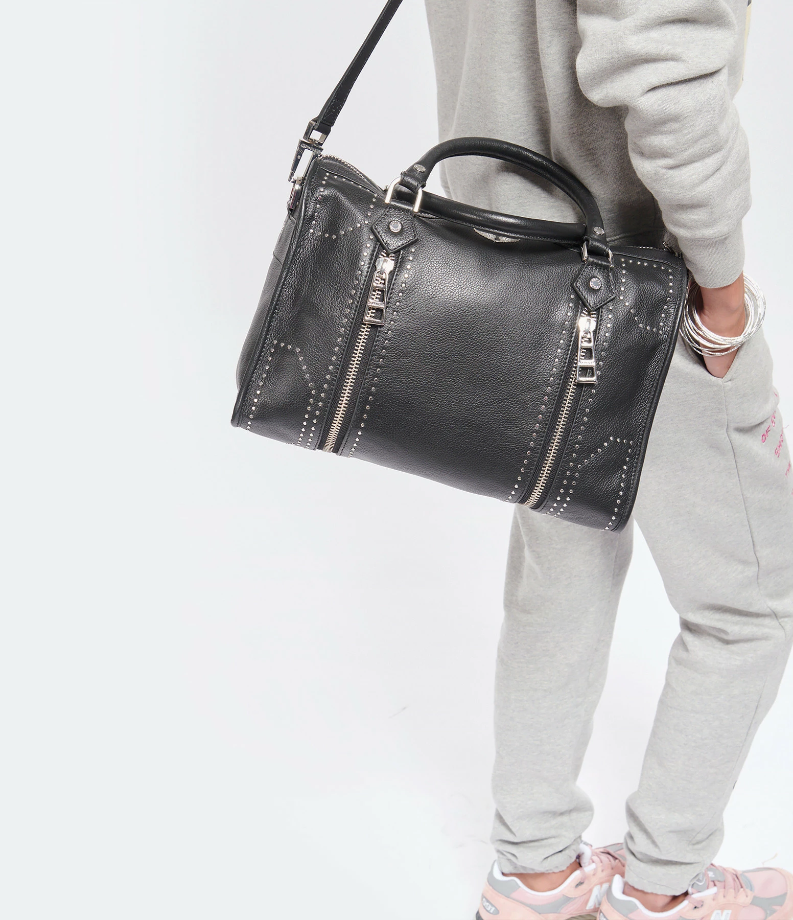 Sac à main en cuir suédé noir. Deux anses et une bandoulière réglable et amovible par mousquetons. Soufflets zippés à ouvrir ou non. Intérieur en toile avec une poche zippée et une poche plaquée.