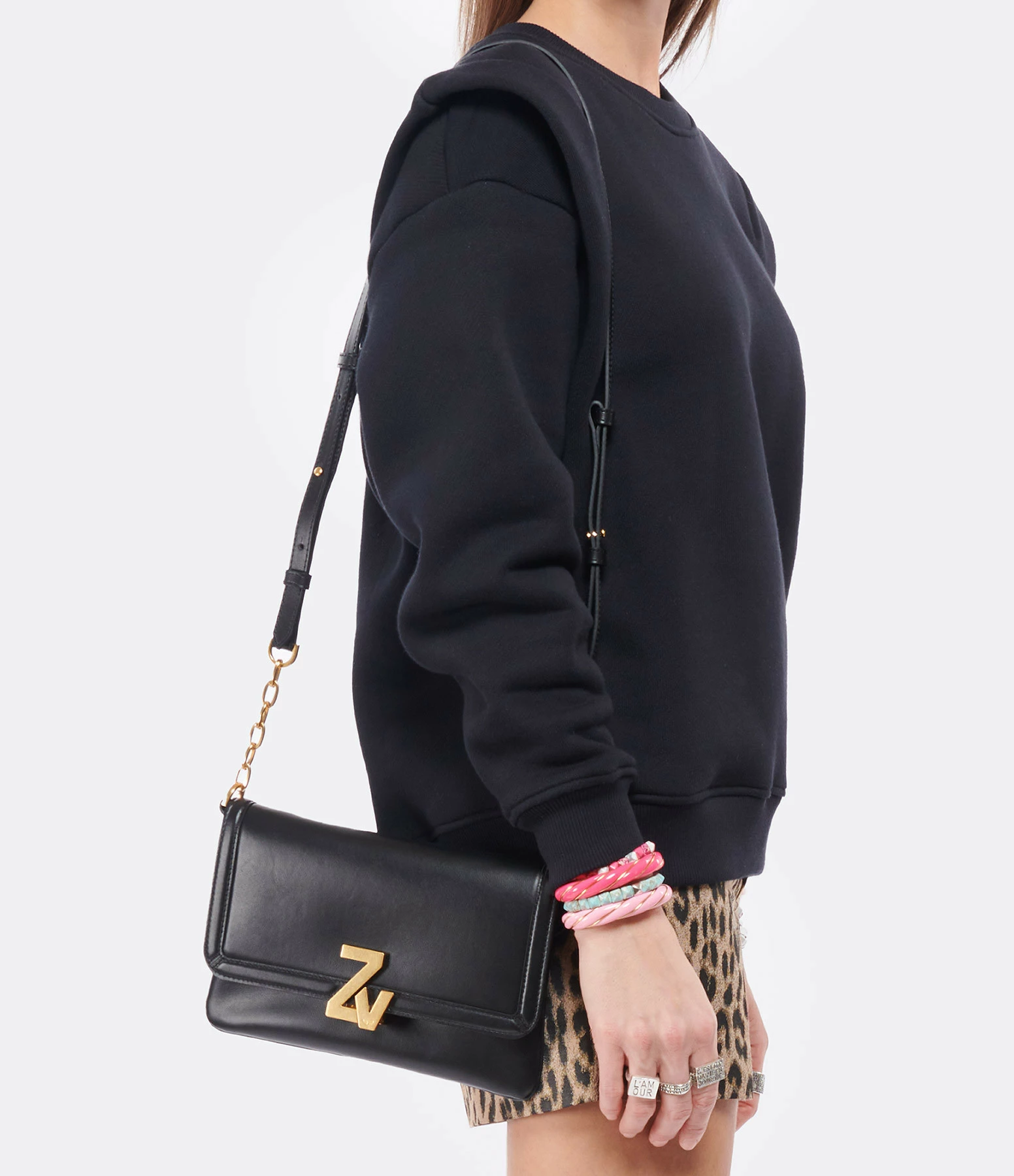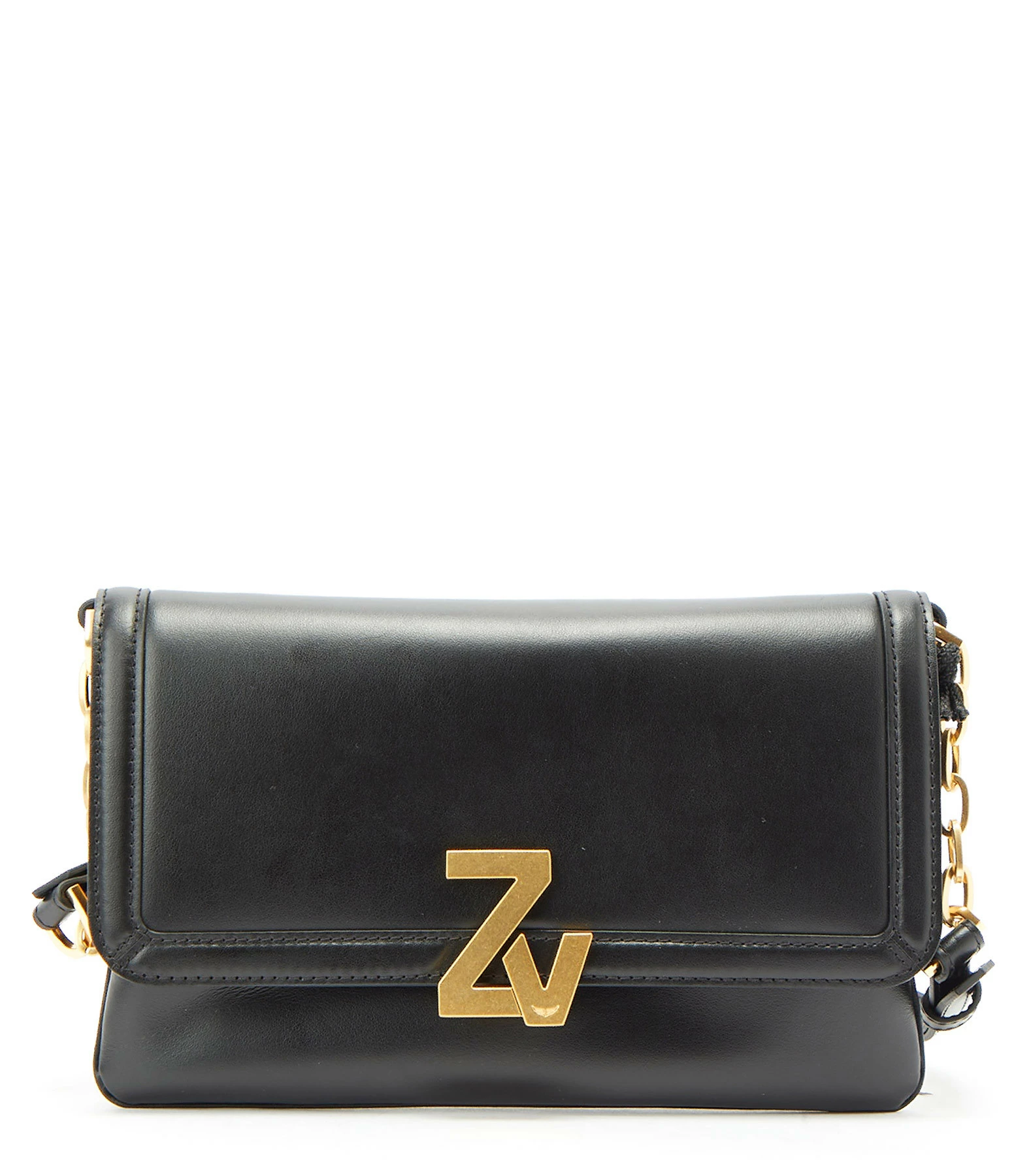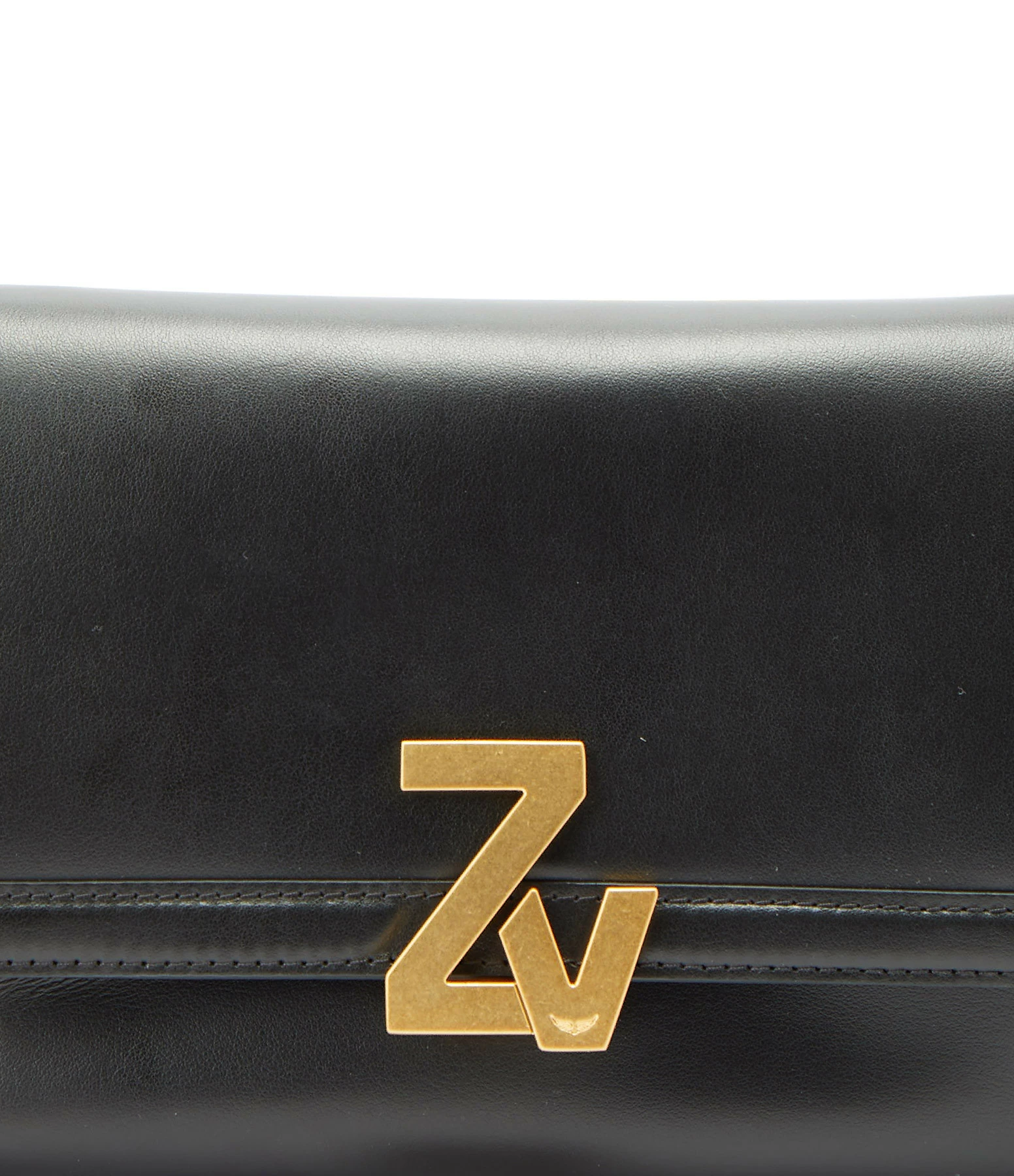 Pochette en cuir lisse noir. Rabat avec fermoir ZV dorĂ©. IntĂ©rieur doublĂ©. Une petite poche zippĂ©e Ă l’intĂ©rieur. BandouliĂšre en chaĂźne et cuir amovible et ajustable.