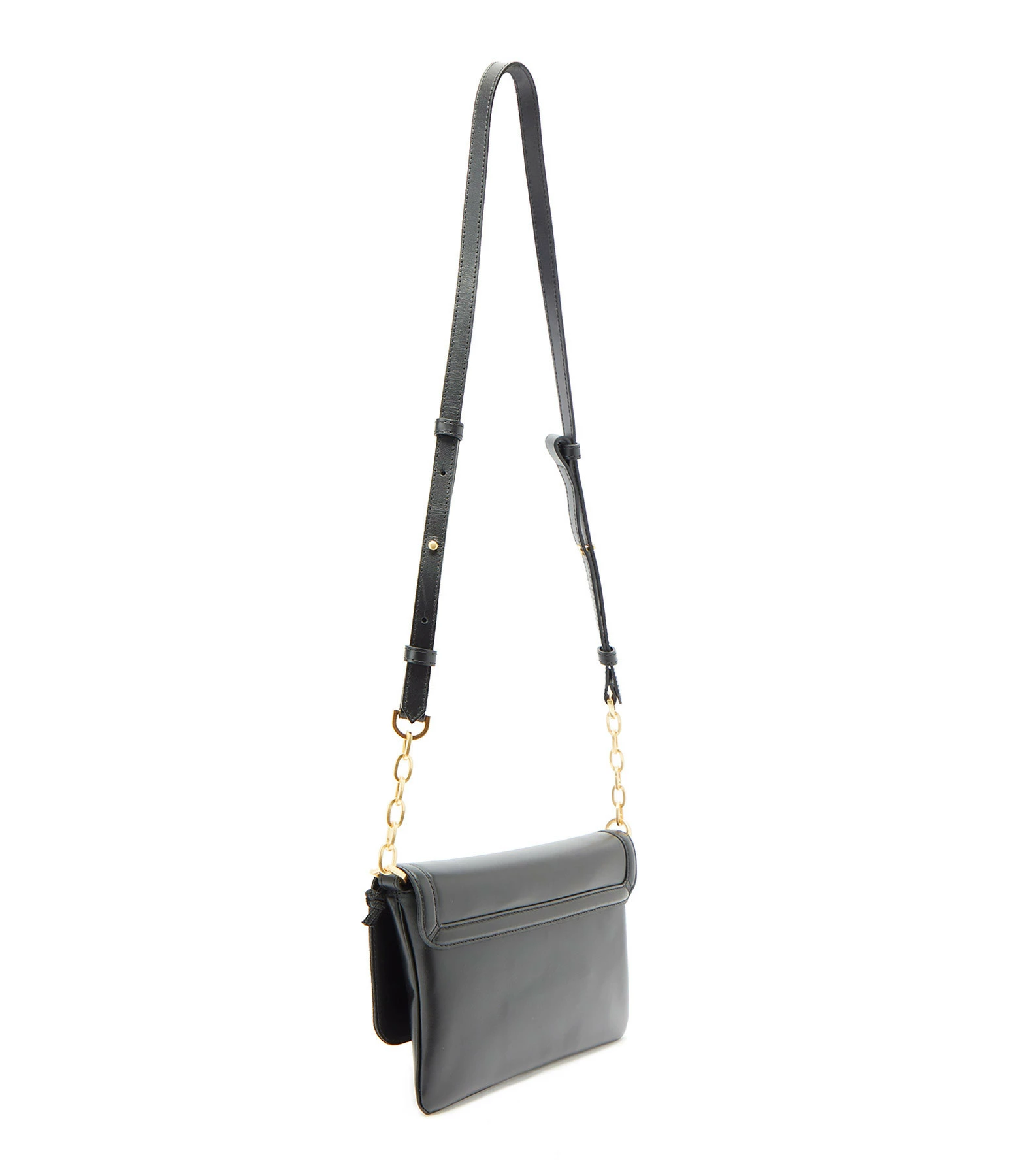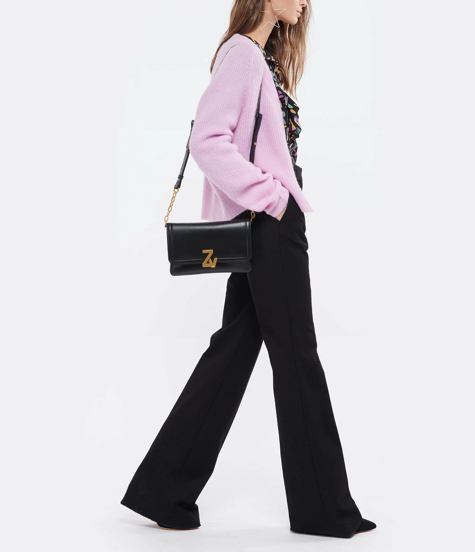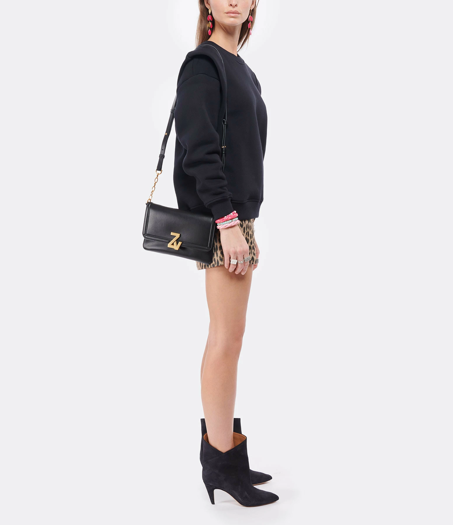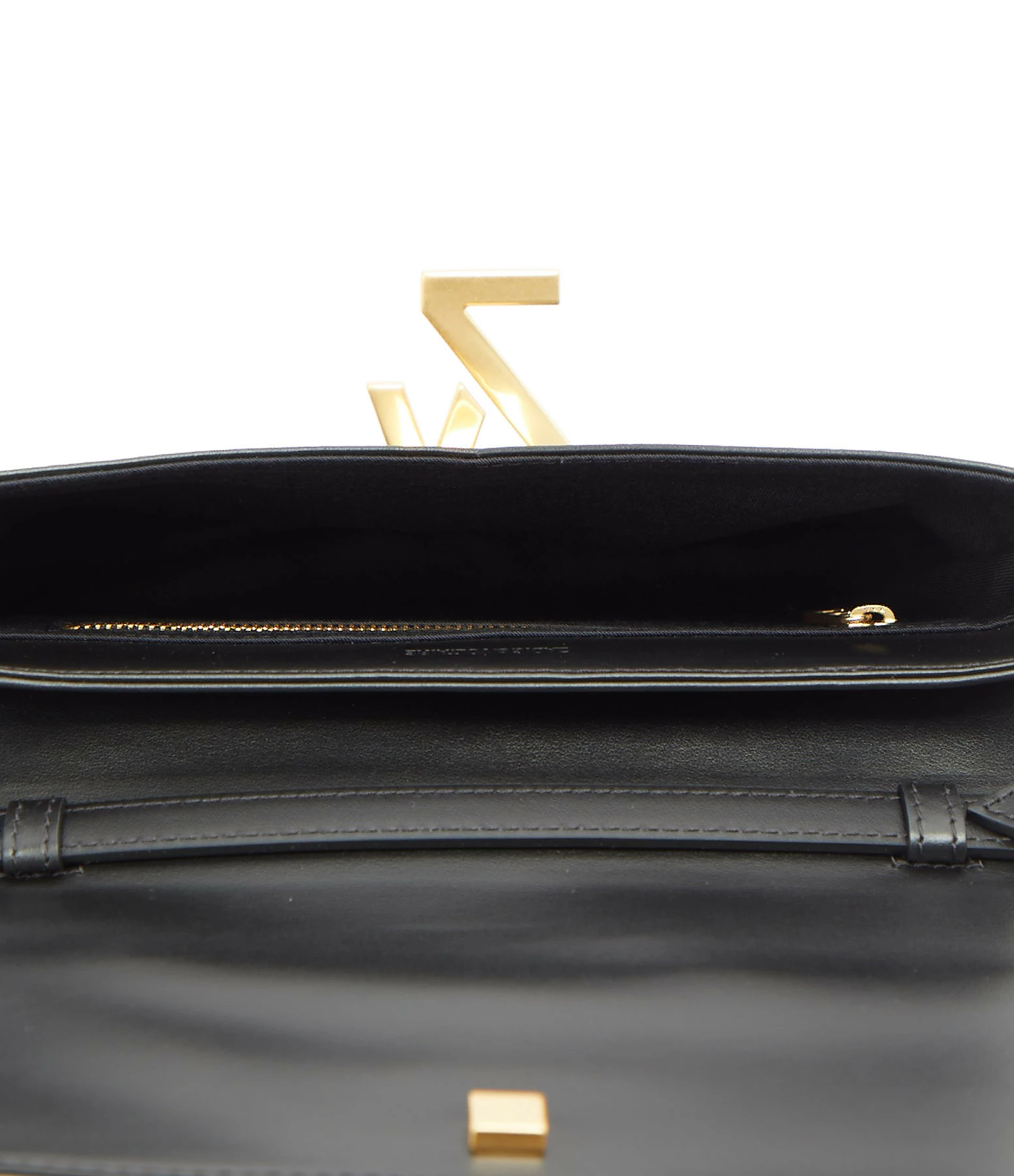 Pochette en cuir lisse noir. Rabat avec fermoir ZV dorĂ©. IntĂ©rieur doublĂ©. Une petite poche zippĂ©e Ă l’intĂ©rieur. BandouliĂšre en chaĂźne et cuir amovible et ajustable.